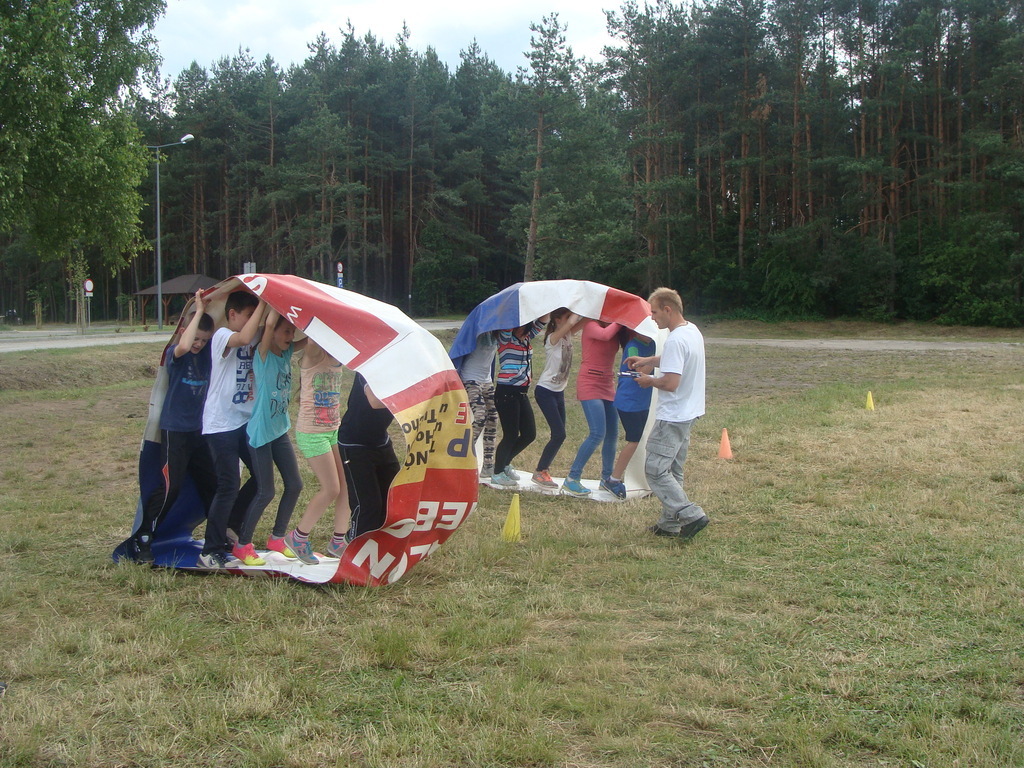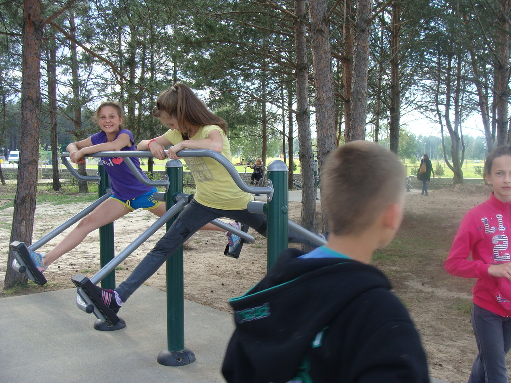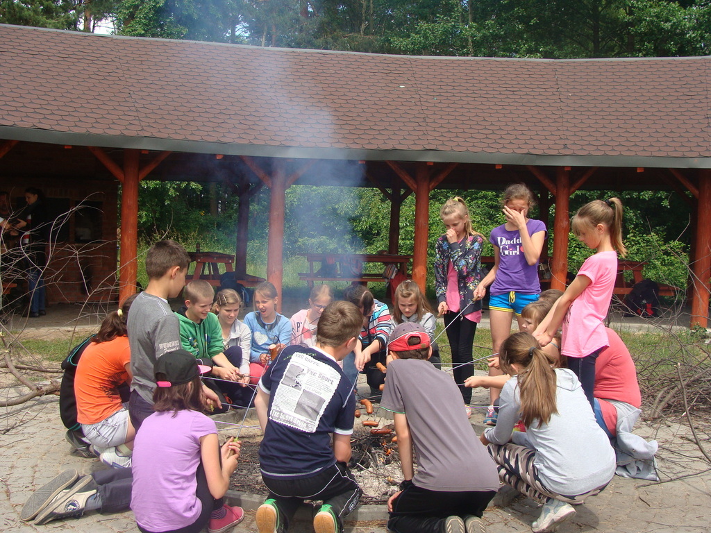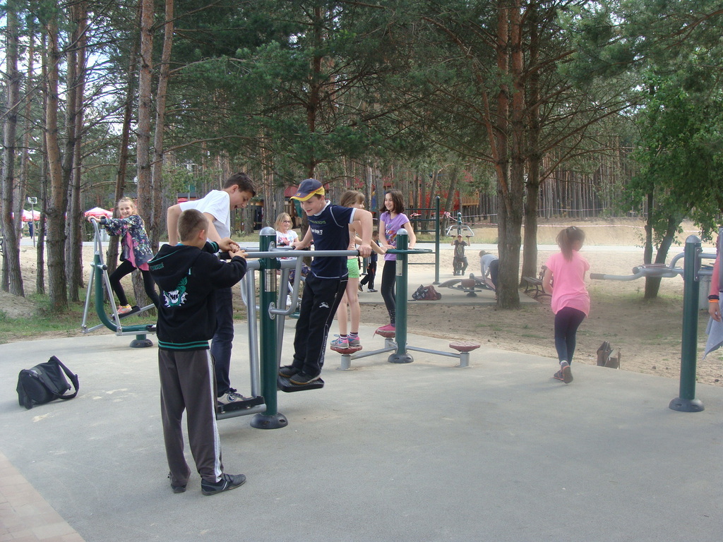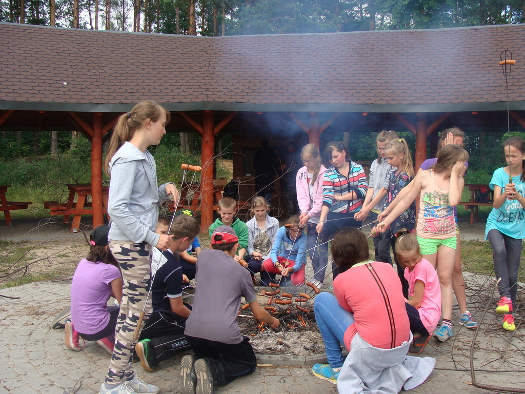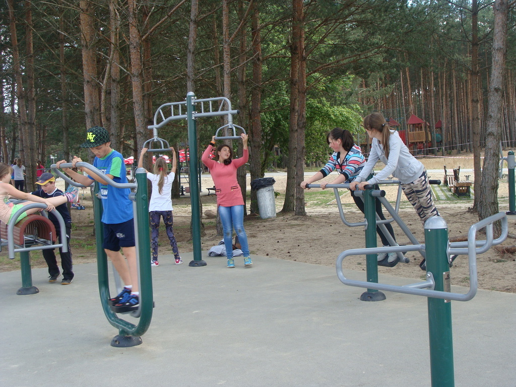 Po tych zmaganiach był czas na posiłek - pieczenie kiełbasek przy ognisku. Po nabraniu sił uczniowie integrowali się poprzez wykonywanie konkurencji w zespołach i ćwiczenia na siłowni na świeżym powietrzu.