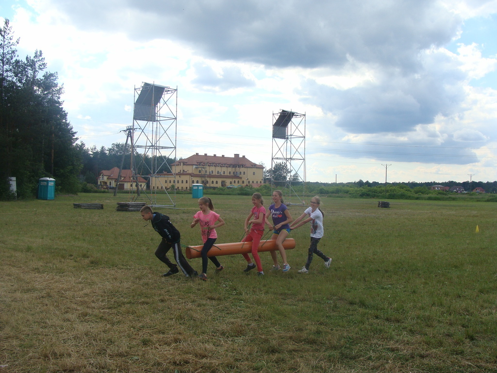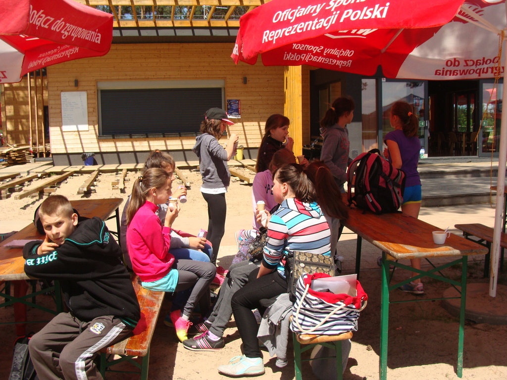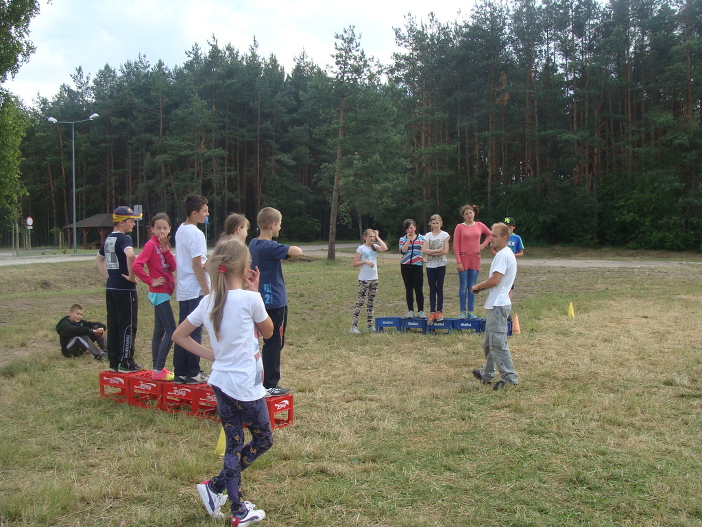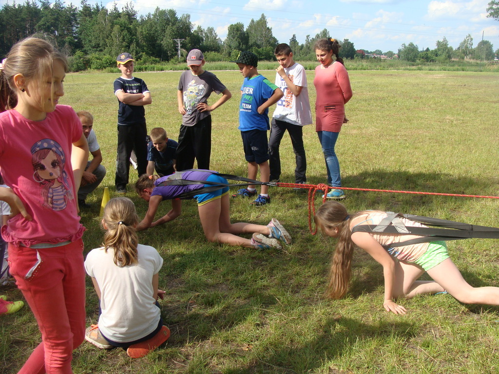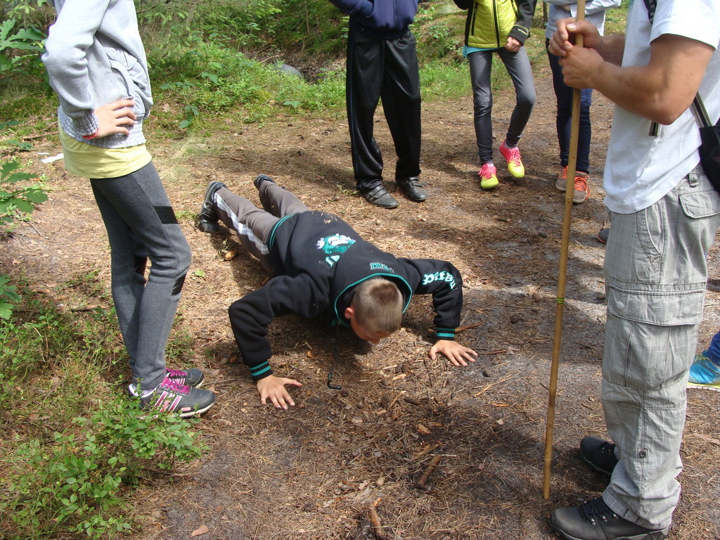 Po tych zmaganiach był czas na posiłek - pieczenie kiełbasek przy ognisku. Po nabraniu sił uczniowie integrowali się poprzez wykonywanie konkurencji w zespołach i ćwiczenia na siłowni na świeżym powietrzu.