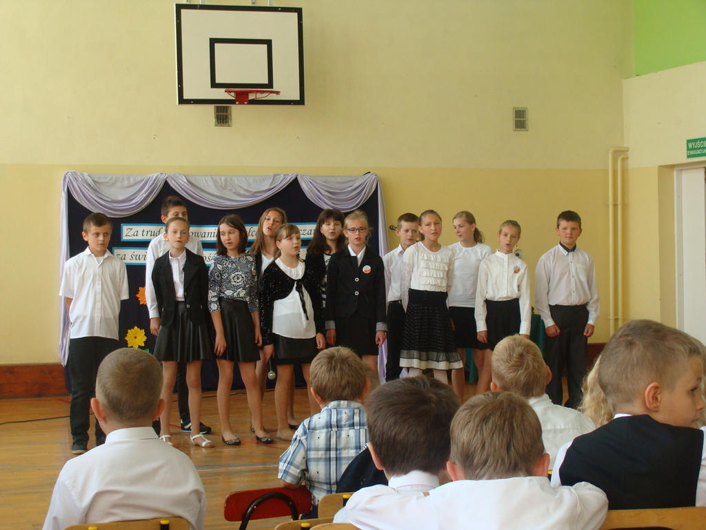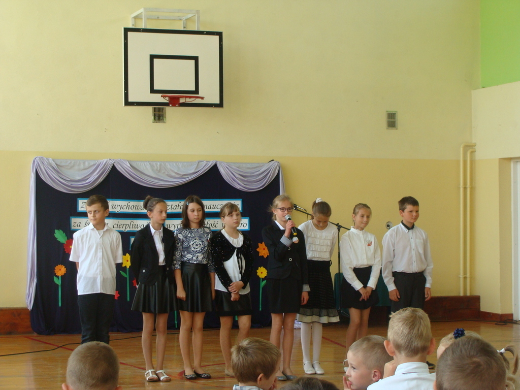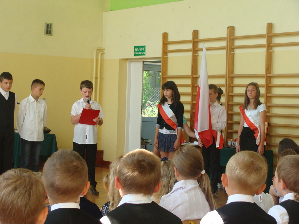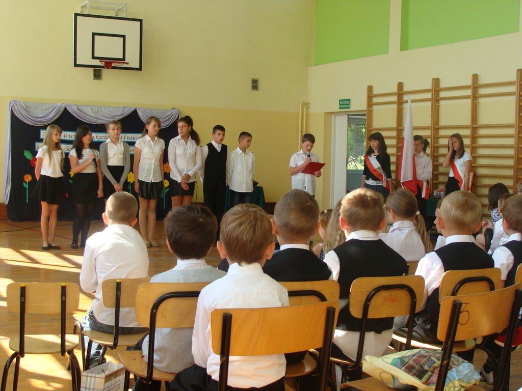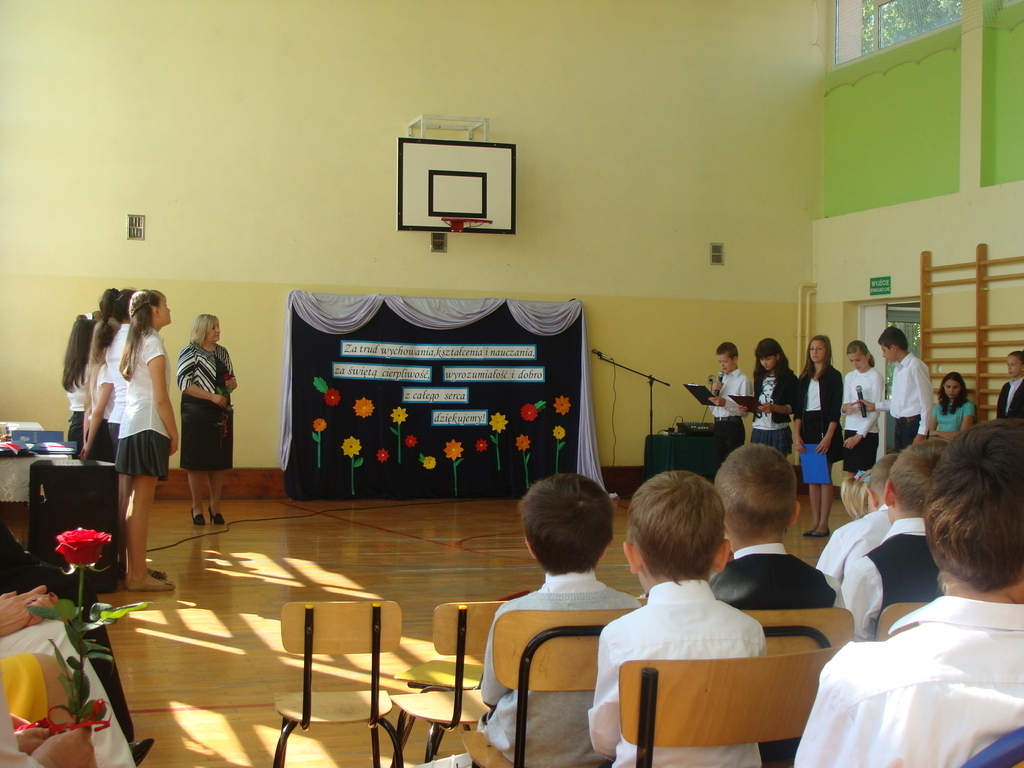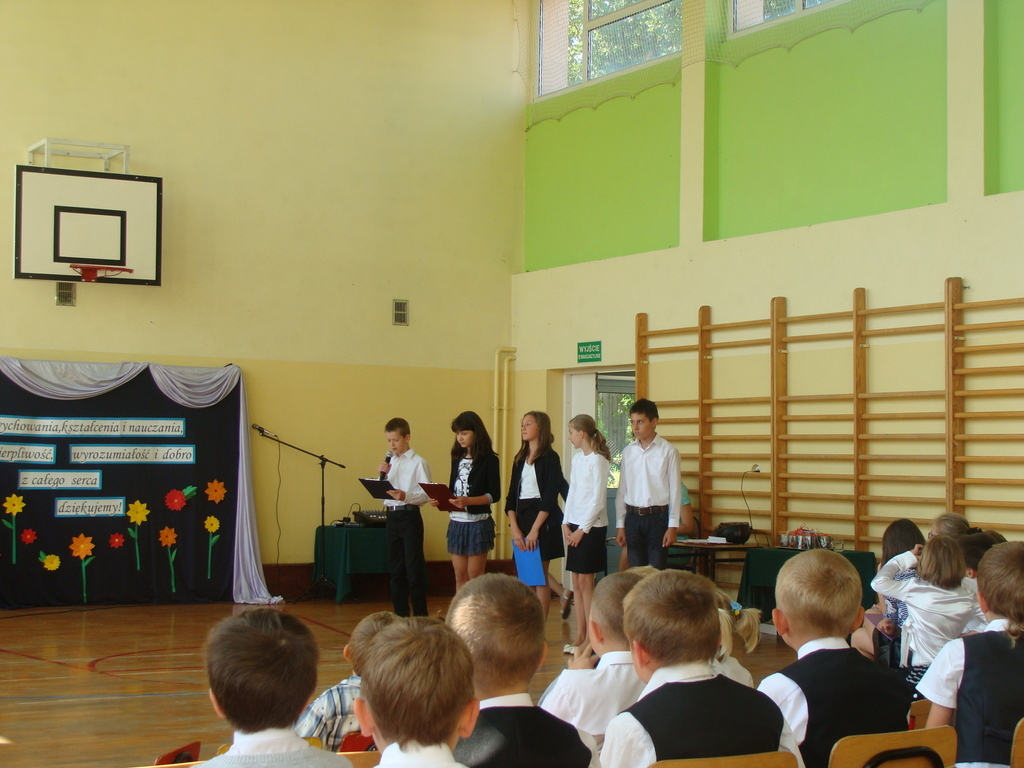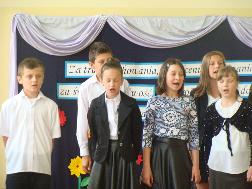 Wszyscy odśpiewali hymn państwowy, a w dalszej części uczniowie klasy szóstej zaprezentowali się w ciekawym programie artystycznym. Podziękowali nauczycielom za pomoc w zdobywaniu wiedzy, innym pracownikom za życzliwość, rodzicom za wsparcie.