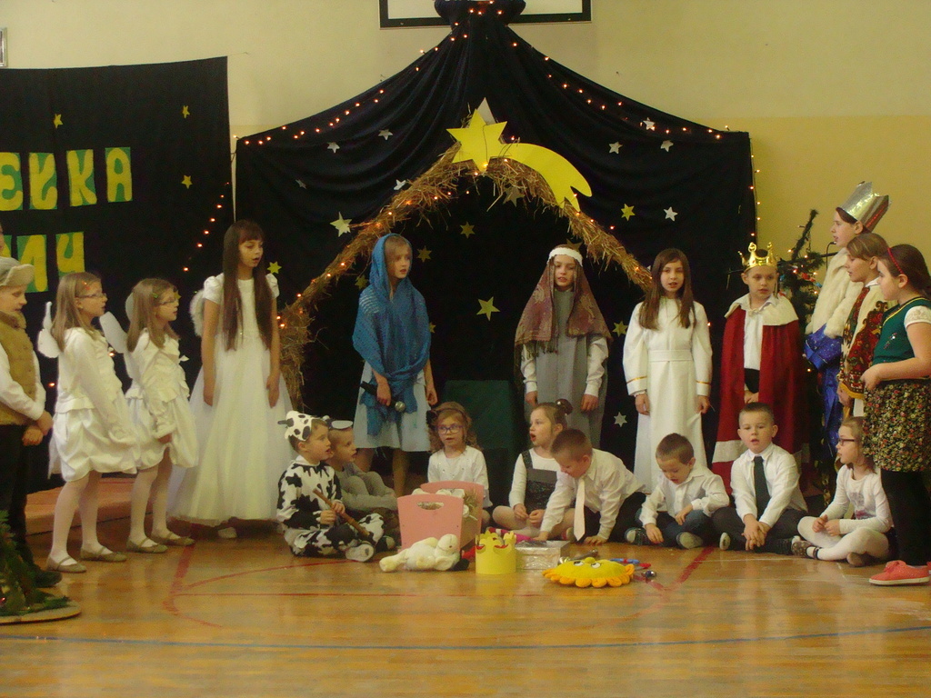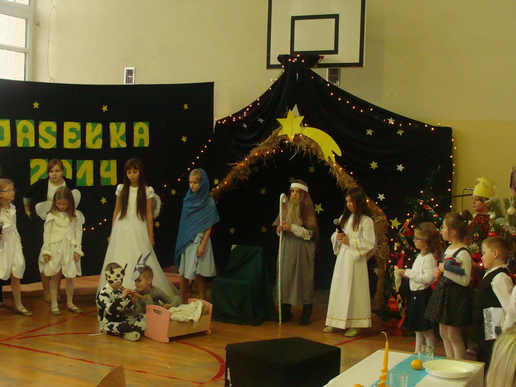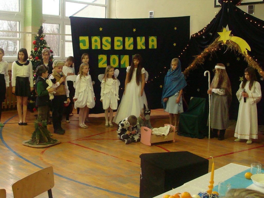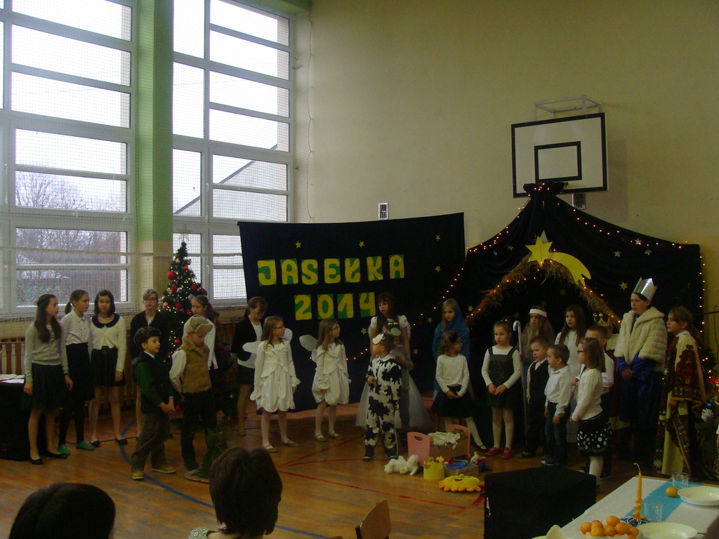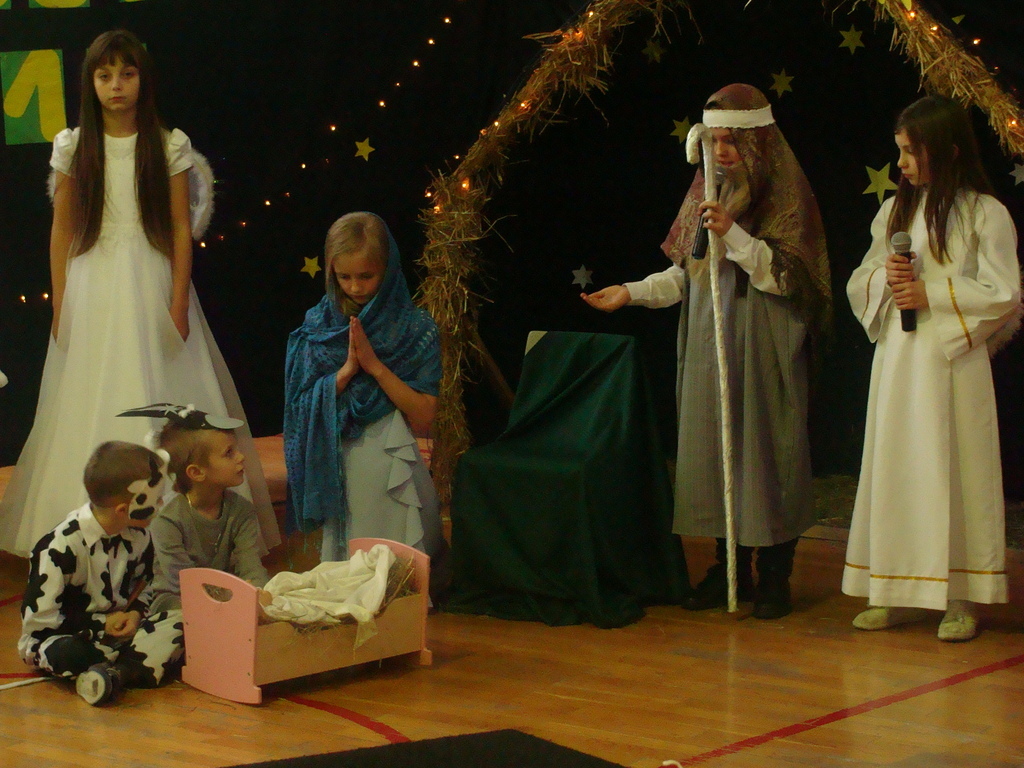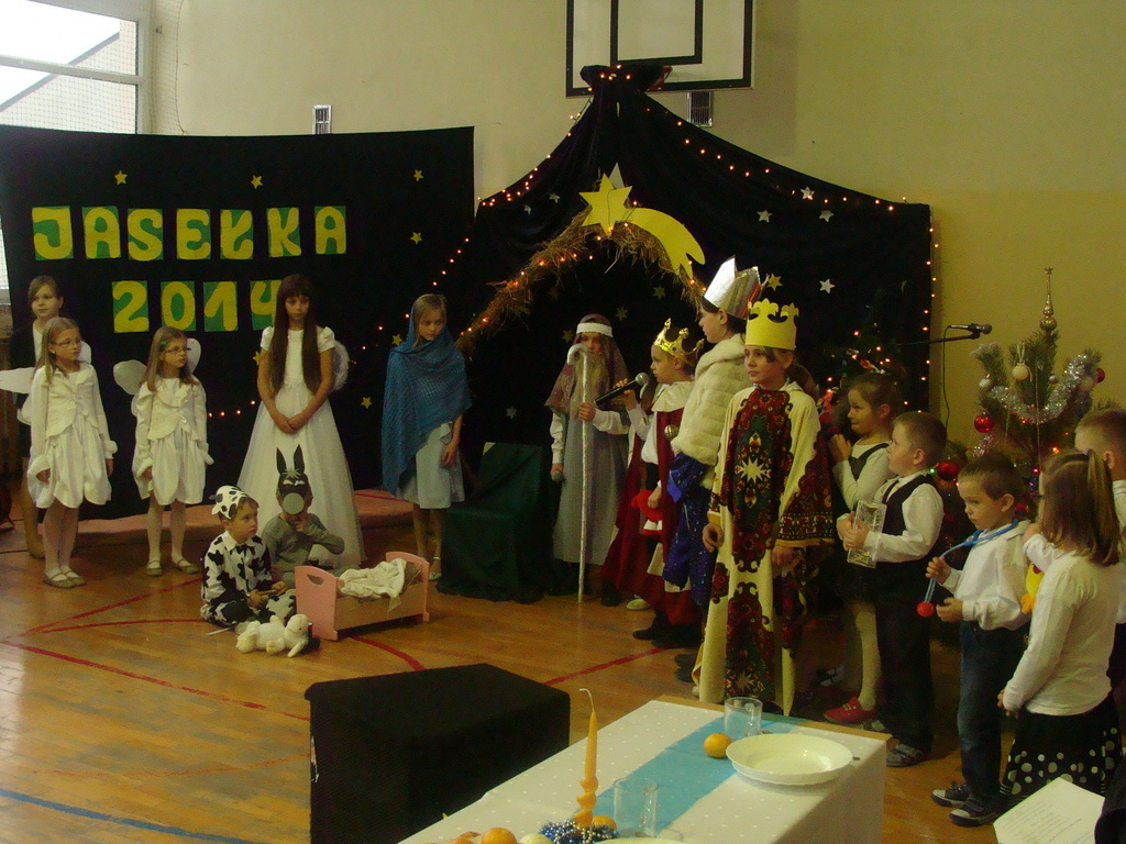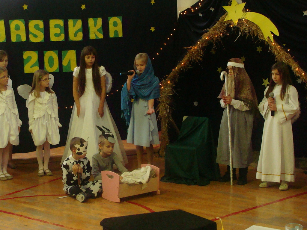 Jak co roku, w naszej szkole przed świętami, dzieci zaprezentowały jasełka. Część artystyczna została przygotowana pod kierunkiem pań: Marii Lipiec i Marioli Zielonki. Historię narodzenia Jezusa przedstawili uczniowie klasy IV, natomiast kolędy śpiewały uczennice z klasy V, I i oddziału przedszkolnego.