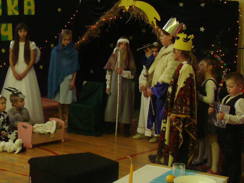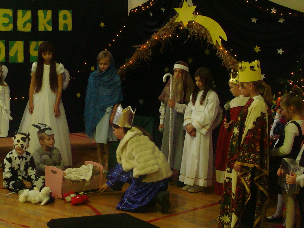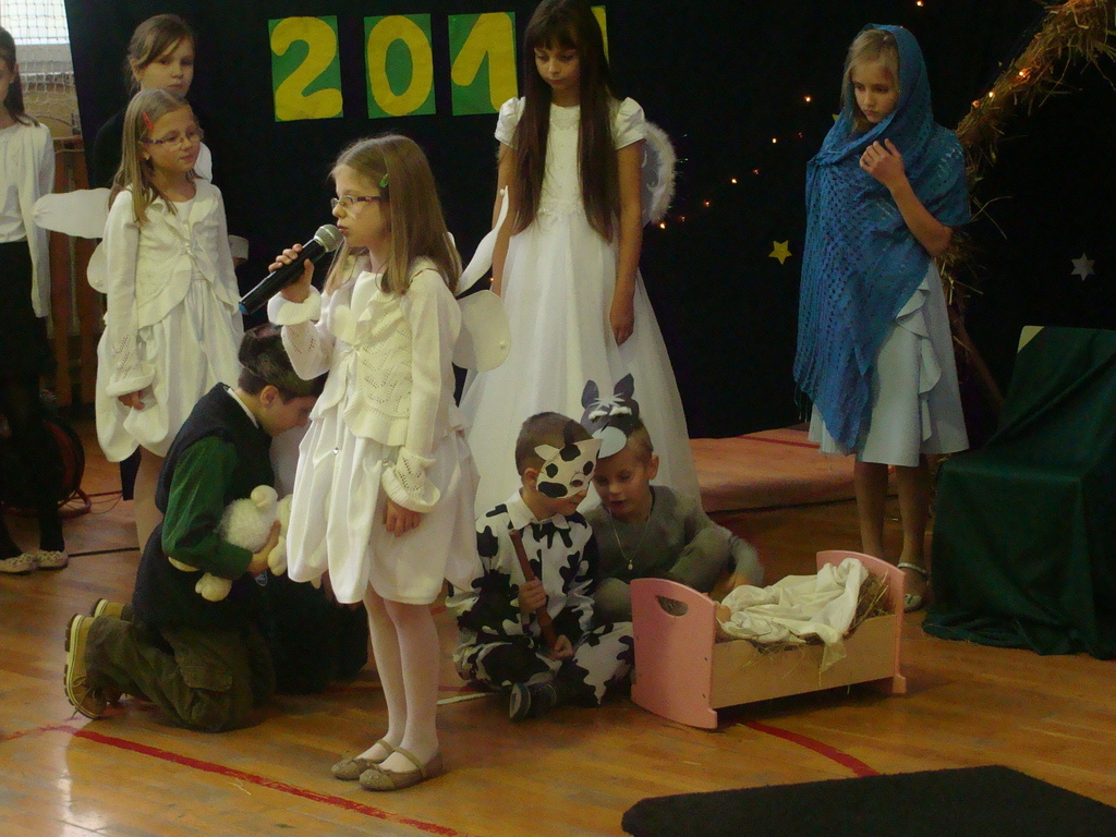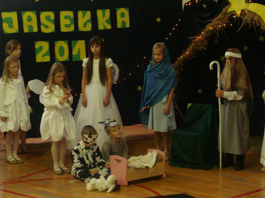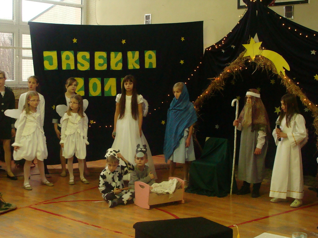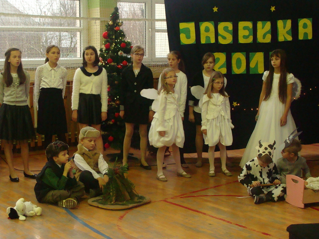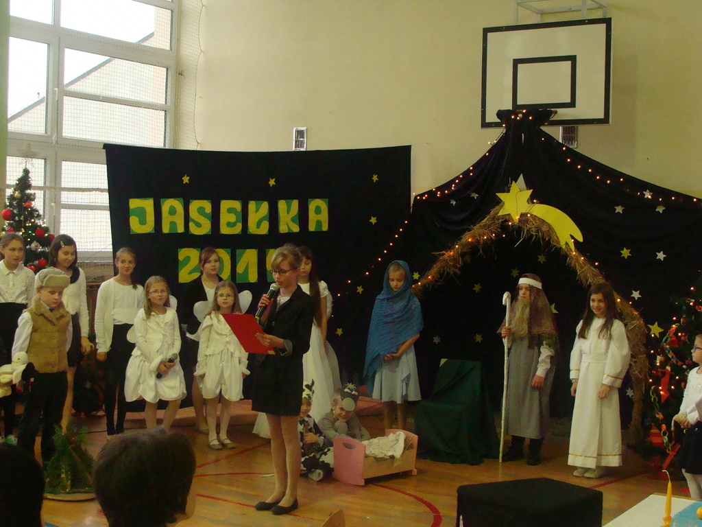 Jak co roku, w naszej szkole przed świętami, dzieci zaprezentowały jasełka. Część artystyczna została przygotowana pod kierunkiem pań: Marii Lipiec i Marioli Zielonki. Historię narodzenia Jezusa przedstawili uczniowie klasy IV, natomiast kolędy śpiewały uczennice z klasy V, I i oddziału przedszkolnego.
