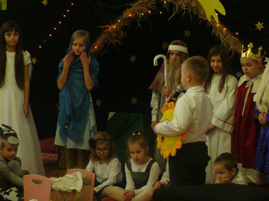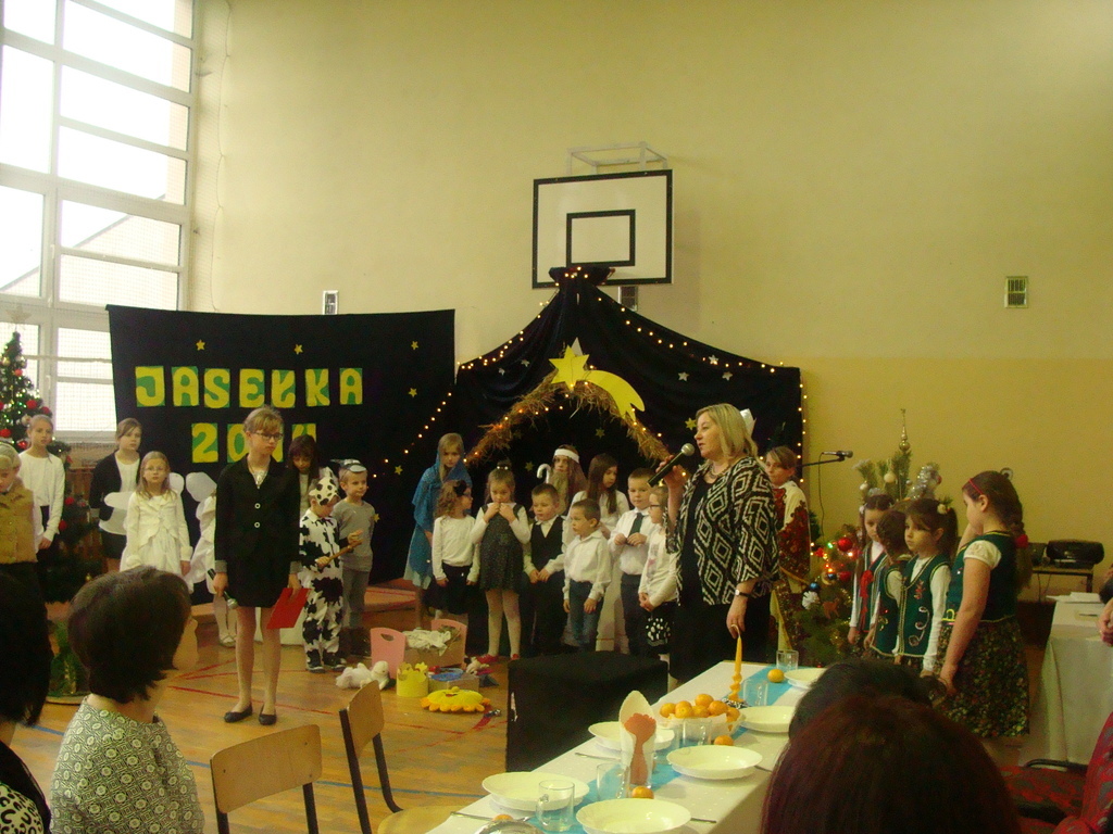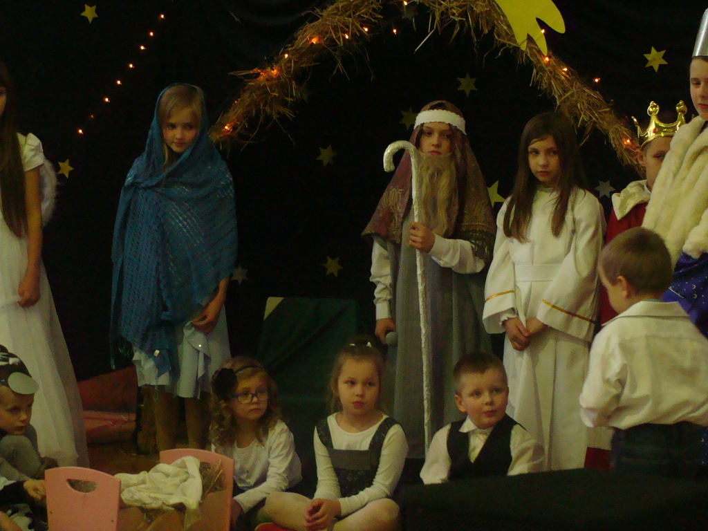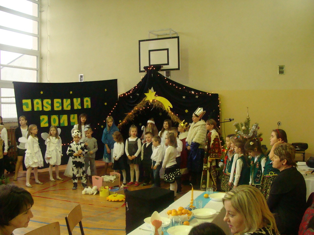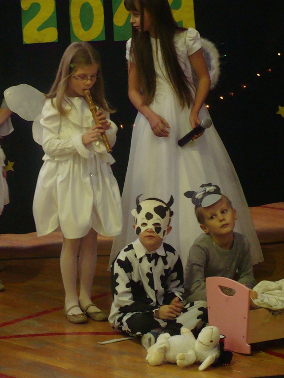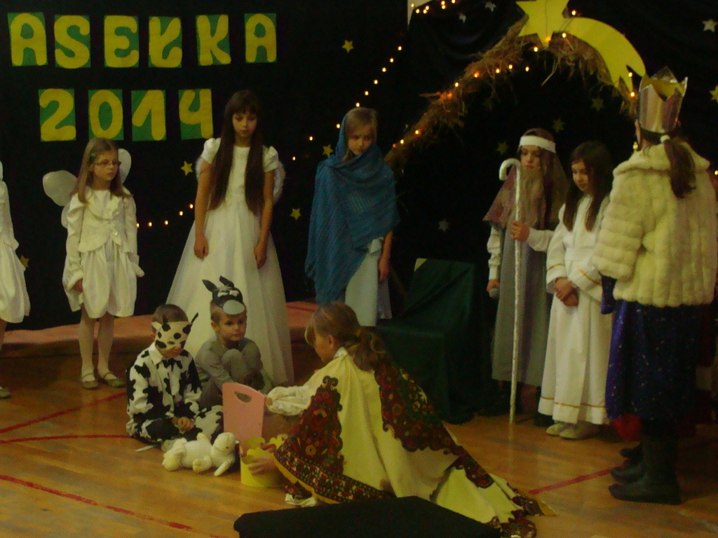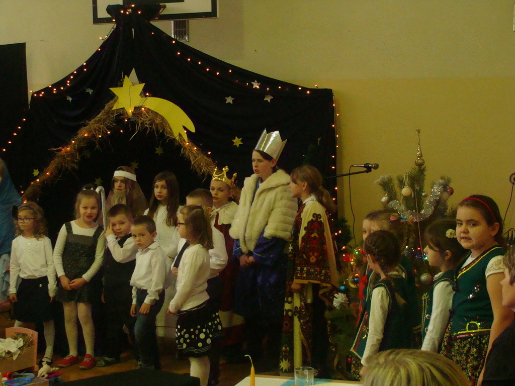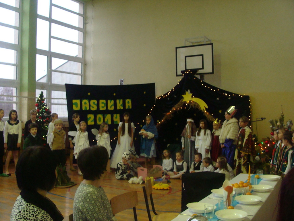 Jak co roku, w naszej szkole przed świętami, dzieci zaprezentowały jasełka. Część artystyczna została przygotowana pod kierunkiem pań: Marii Lipiec i Marioli Zielonki. Historię narodzenia Jezusa przedstawili uczniowie klasy IV, natomiast kolędy śpiewały uczennice z klasy V, I i oddziału przedszkolnego.