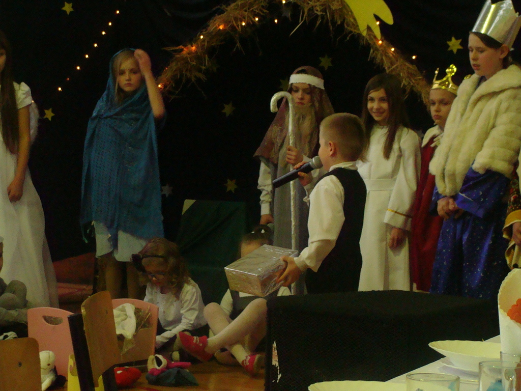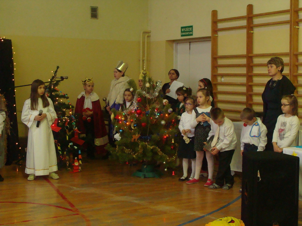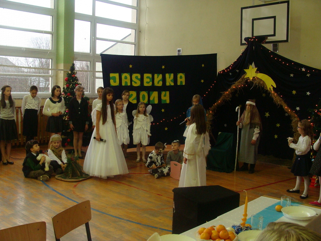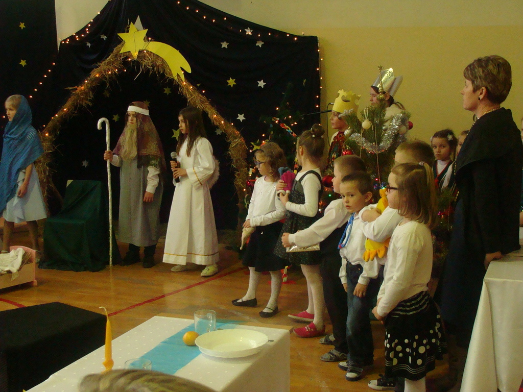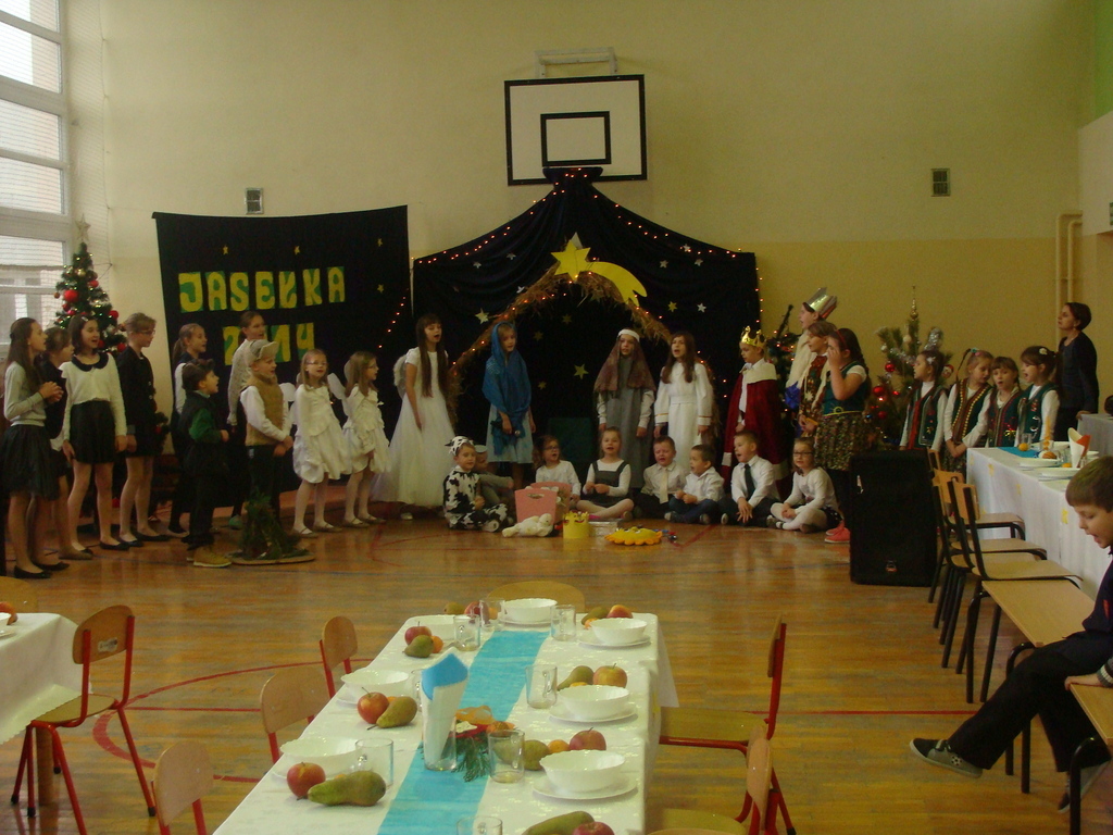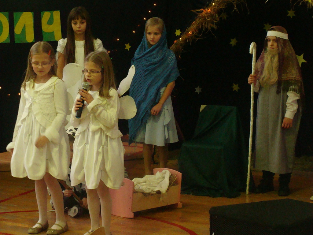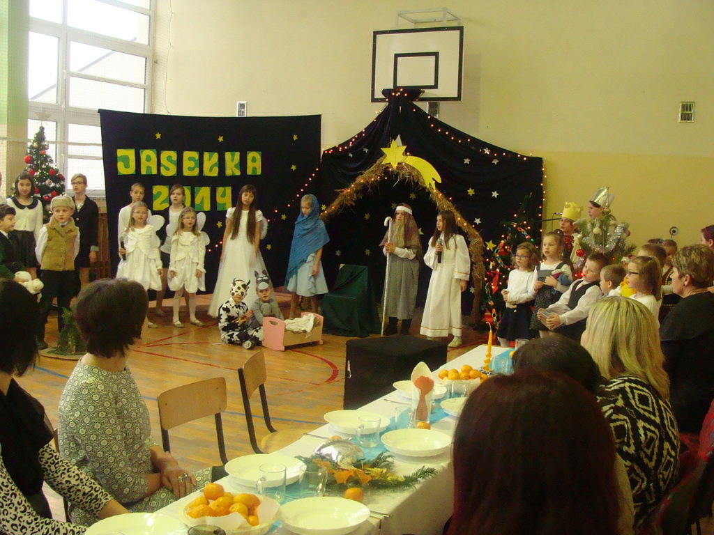 Jak co roku, w naszej szkole przed świętami, dzieci zaprezentowały jasełka. Część artystyczna została przygotowana pod kierunkiem pań: Marii Lipiec i Marioli Zielonki. Historię narodzenia Jezusa przedstawili uczniowie klasy IV, natomiast kolędy śpiewały uczennice z klasy V, I i oddziału przedszkolnego.