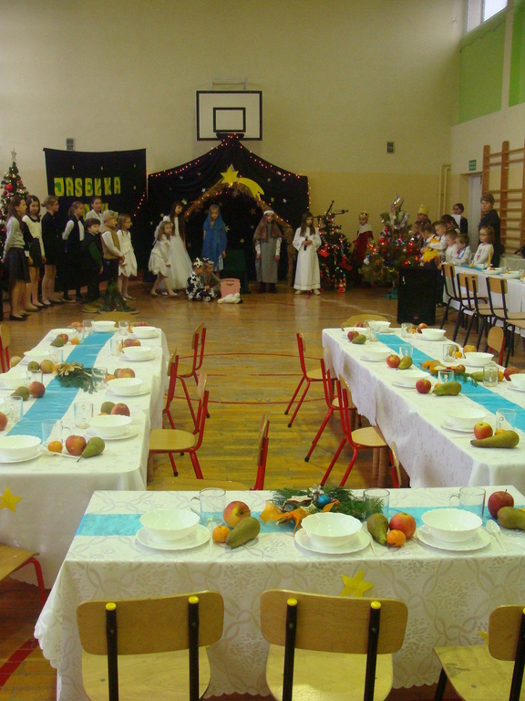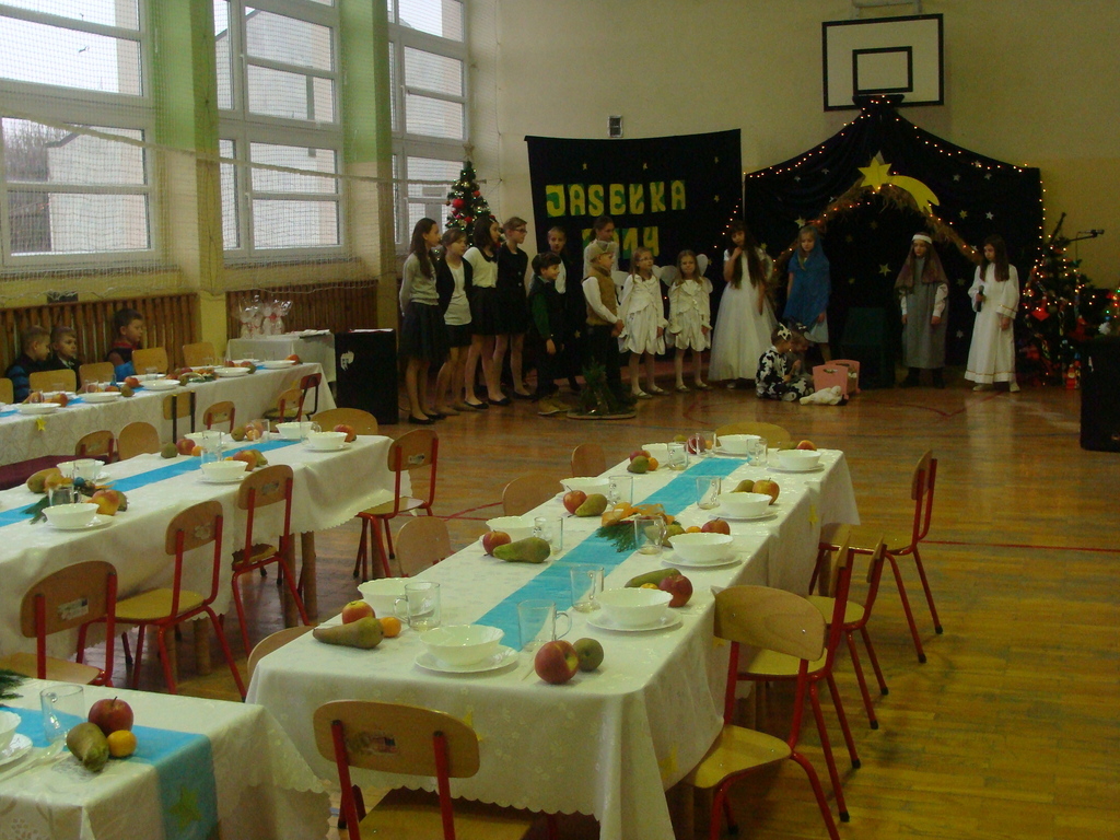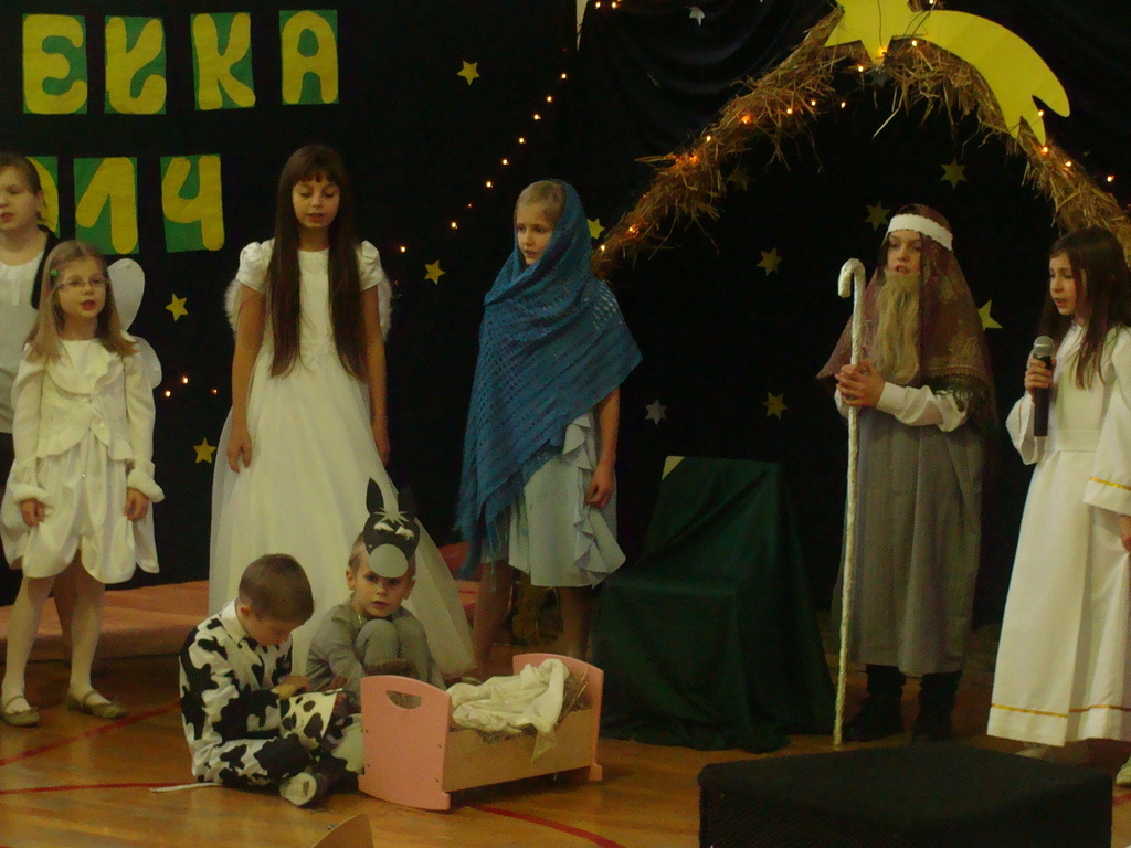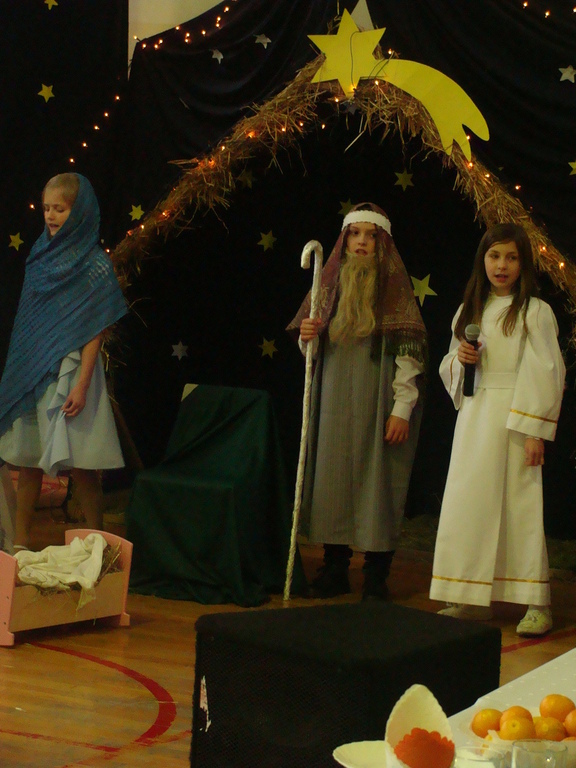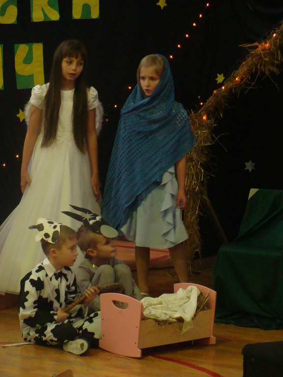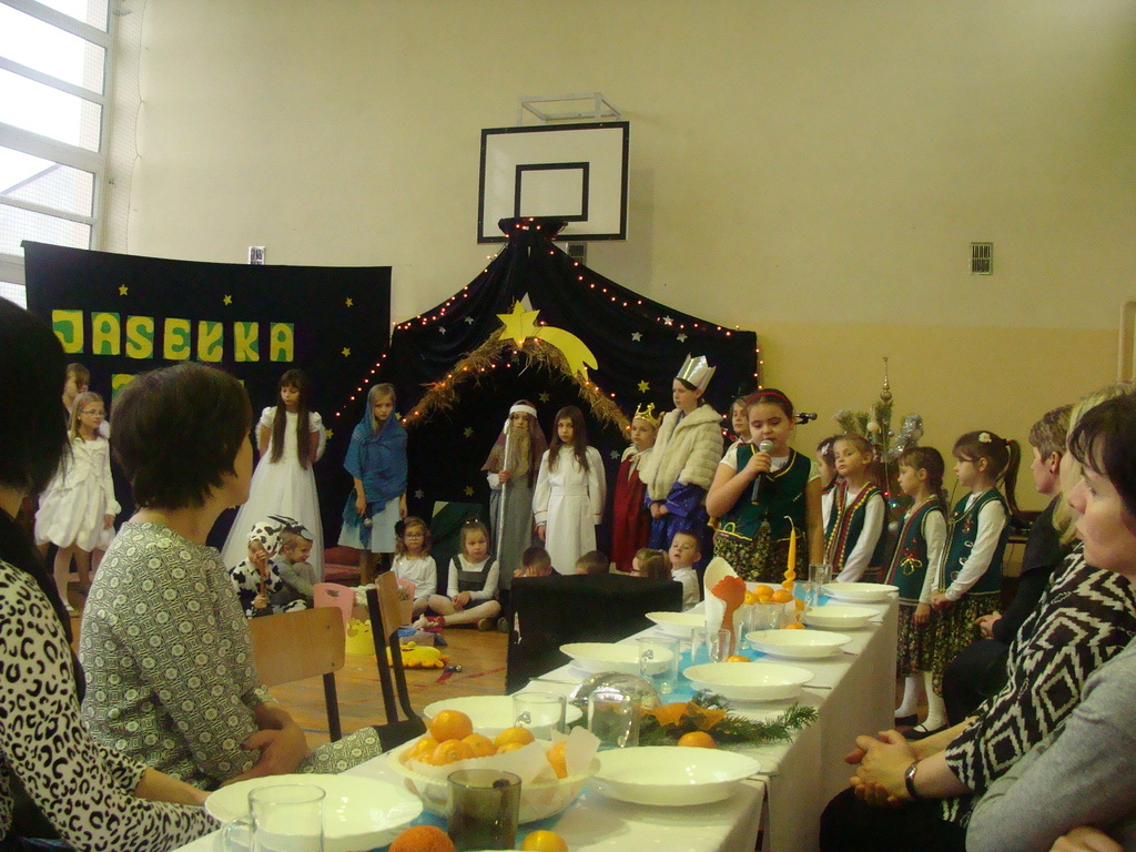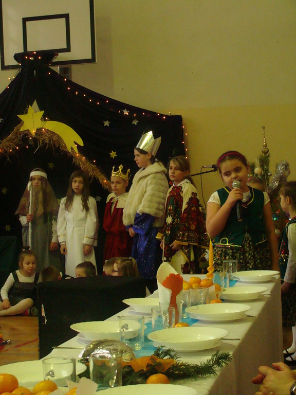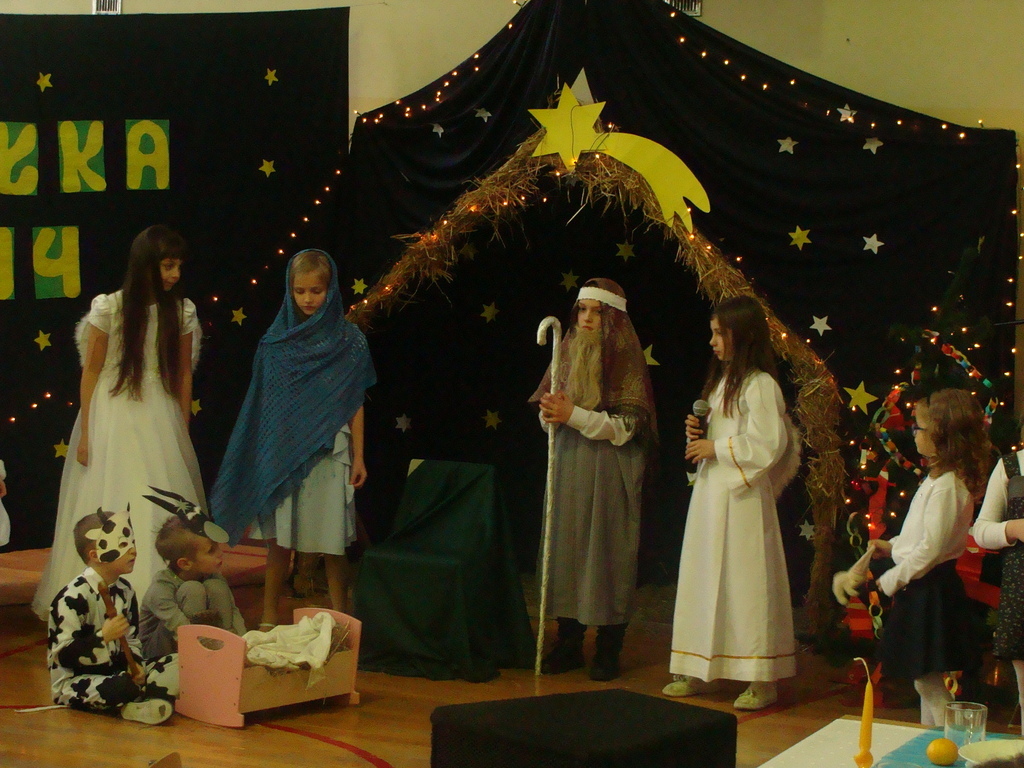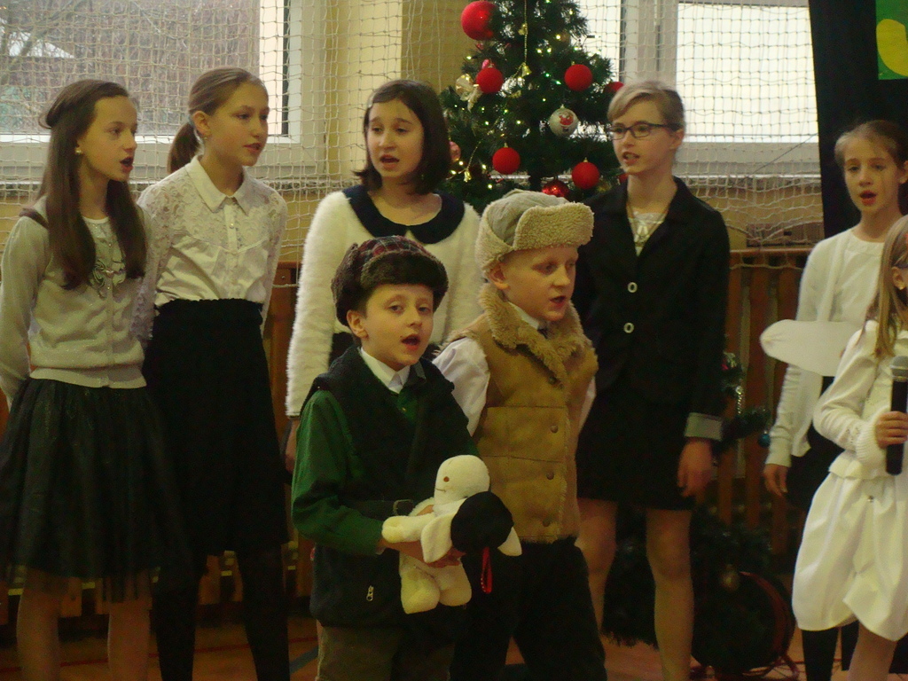 Jak co roku, w naszej szkole przed świętami, dzieci zaprezentowały jasełka. Część artystyczna została przygotowana pod kierunkiem pań: Marii Lipiec i Marioli Zielonki. Historię narodzenia Jezusa przedstawili uczniowie klasy IV, natomiast kolędy śpiewały uczennice z klasy V, I i oddziału przedszkolnego.