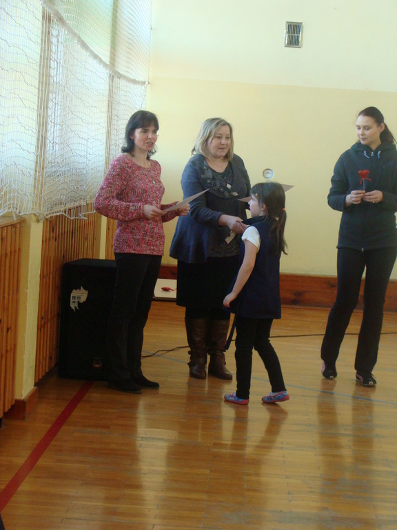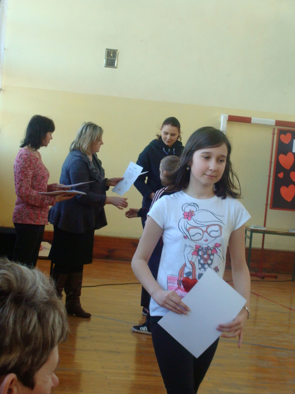 Pani dyrektor z opiekunami Samorządu Uczniowskiego wręczyła dyplomy i upominki uczniom, którzy brali udział w szkolnym konkursie na najładniejszą kartkę walentynkową.
