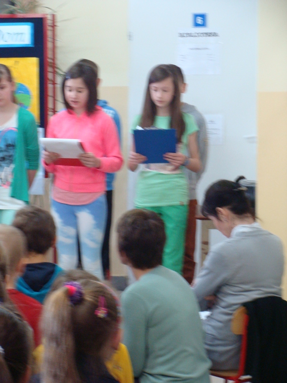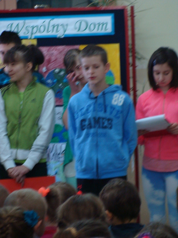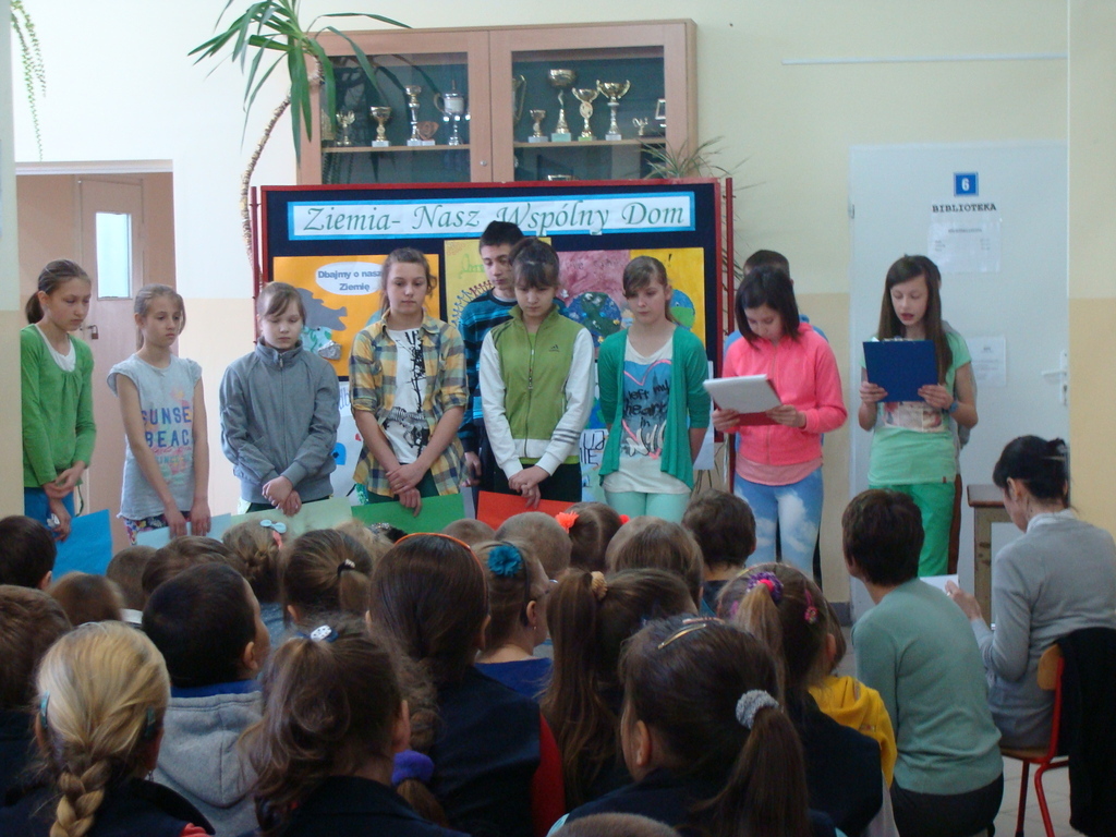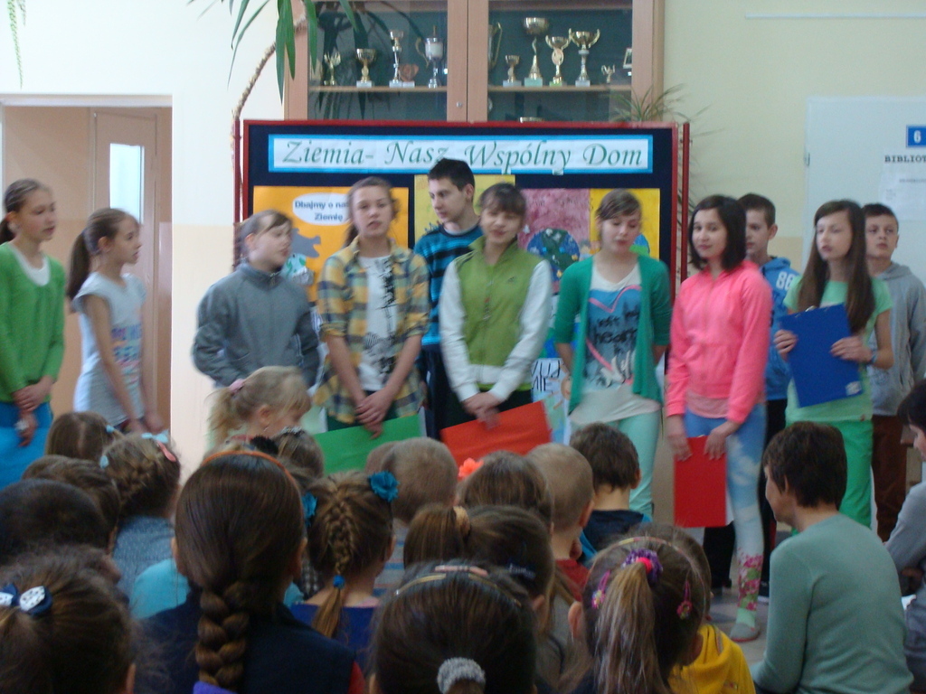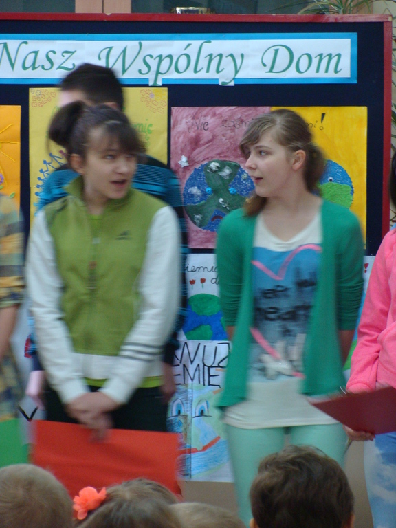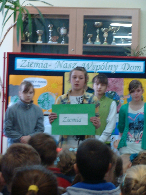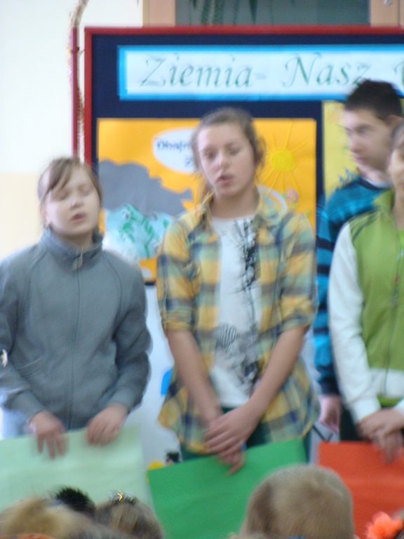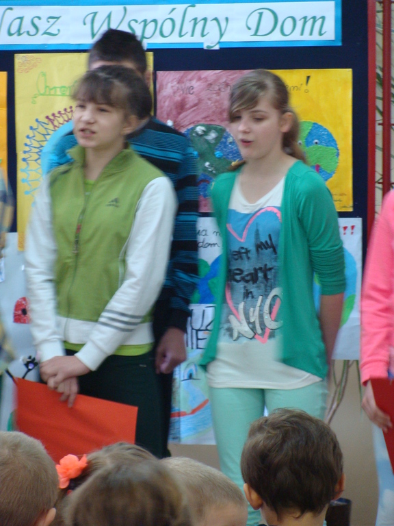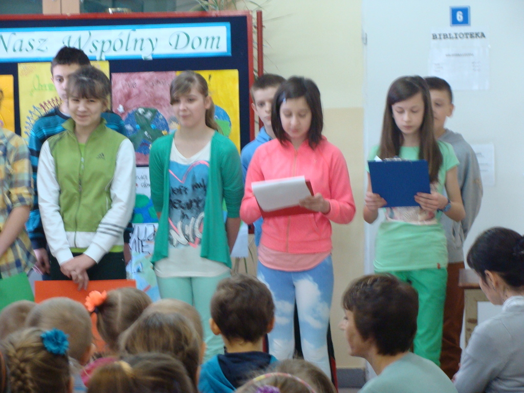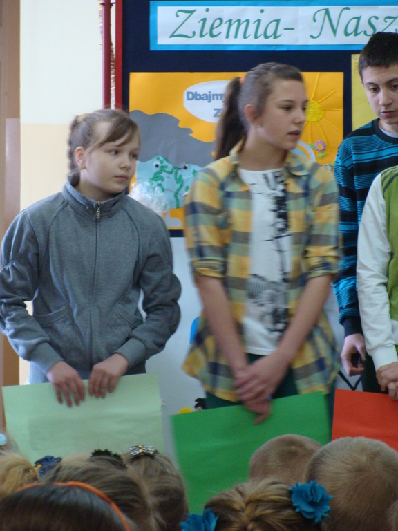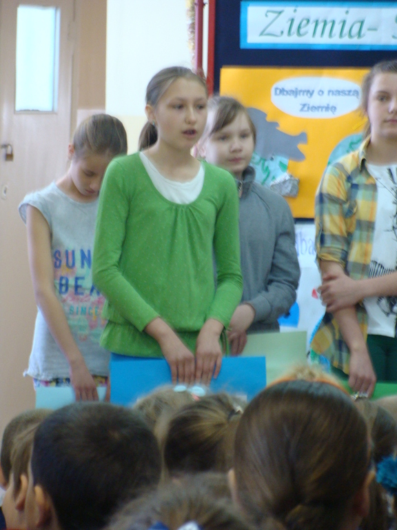 21 kwietnia uczniowie z klasy piątej i szóstej pod kierunkiem pani Małgorzaty Malinkiewicz-Szot zaprezentowali montaż słowno - muzyczny z okazji Dnia Ziemi. Uczniowie zachęcali wszystkich do dbania o środowisko naturalne, poinformowali o tym, co niszczy i zatruwa naszą planetę, a także przekazali uczniom i wychowankom w jaki sposób należy dbać o przyrodę i jej piękno. Przedstawienie uświetniły piosenki o tematyce ekologicznej.
