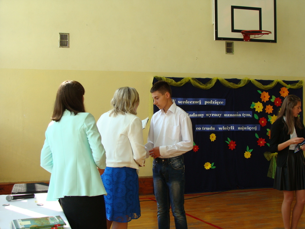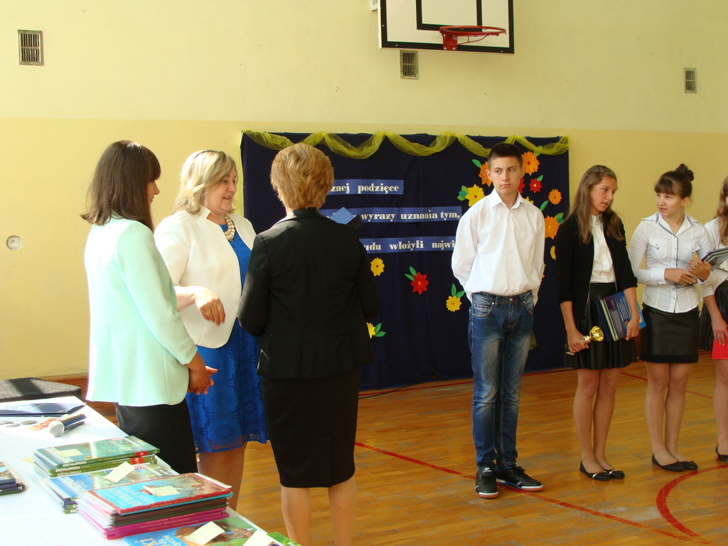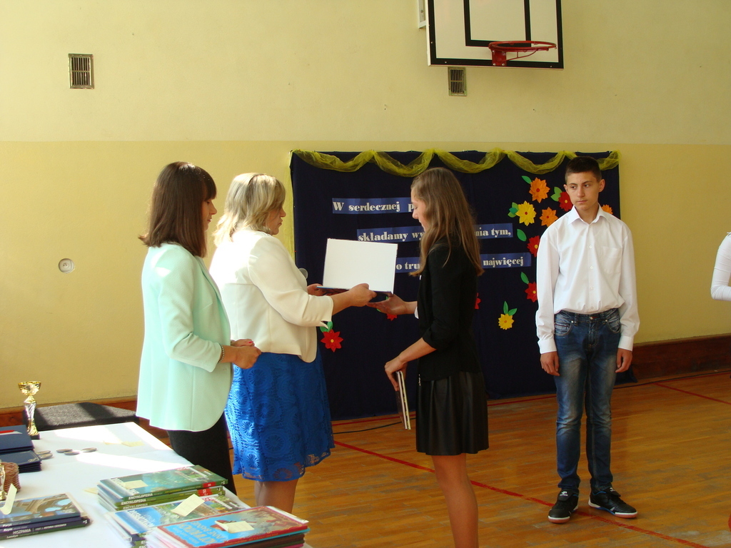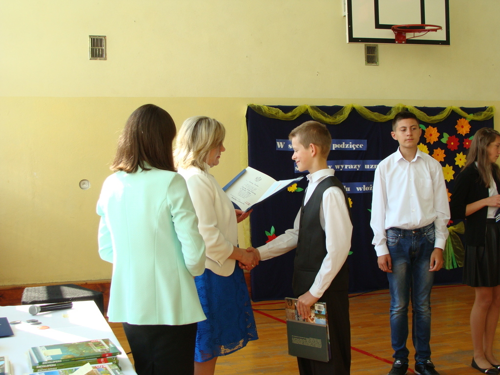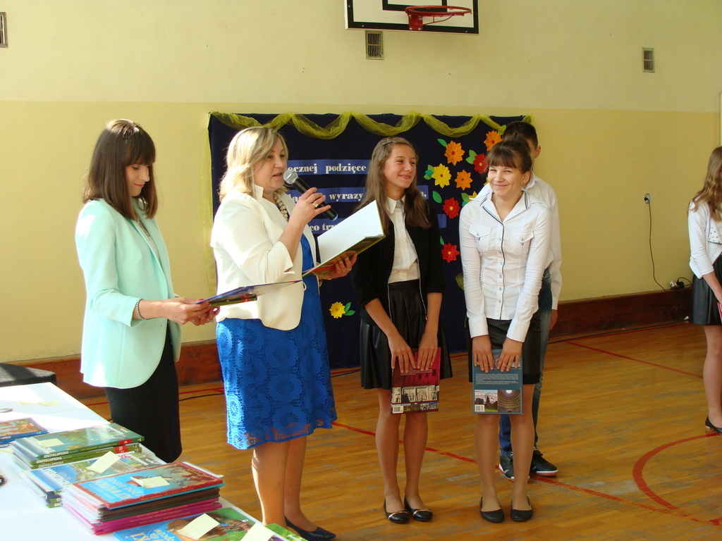 Podczas uroczystej akademii dyrektor szkoły z wychowawcami poszczególnych klas wręczyła świadectwa z wyróżnieniem oraz nagrody uczniom, którzy w tym roku szkolnym osiągnęli najwyższe wyniki w nauce, za wzorową frekwencję, za działalność w Samorządzie Uczniowskim, osiągnięcia sportowe i godne reprezetnowanie szkoły w środowisku lokalnym.