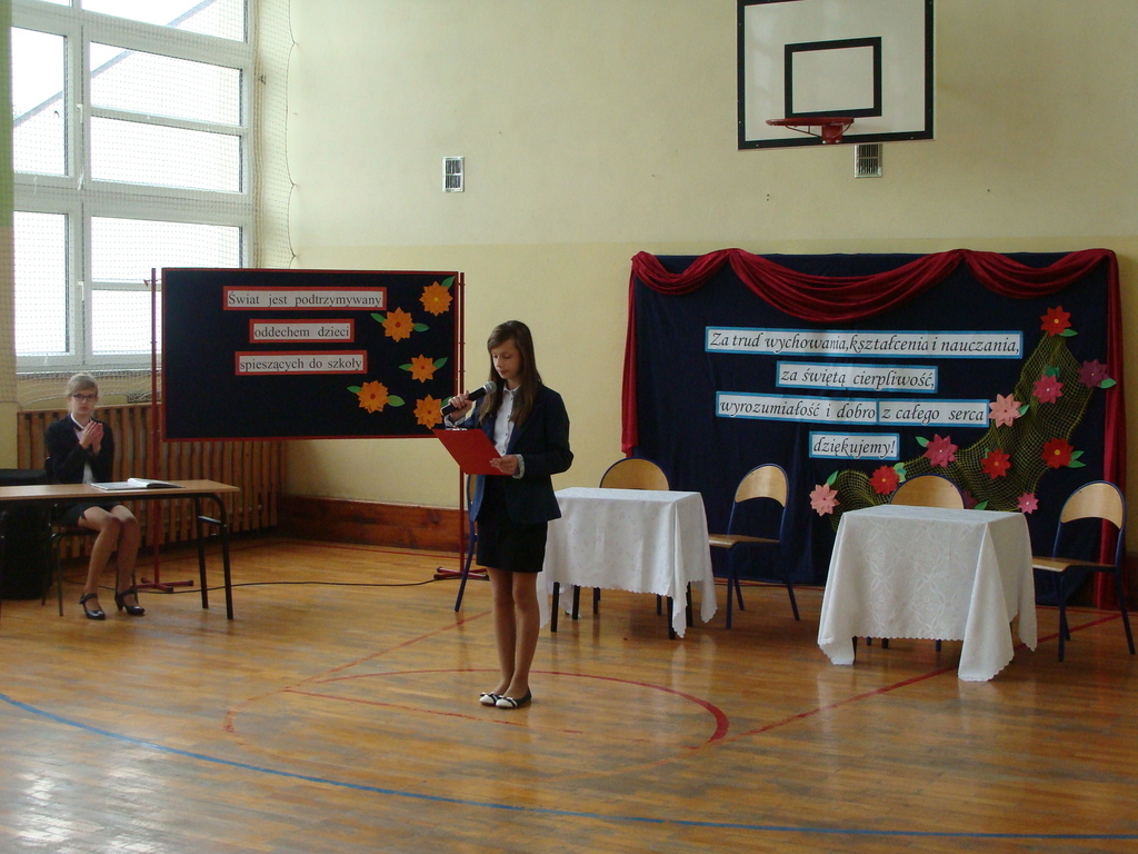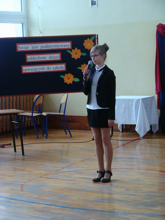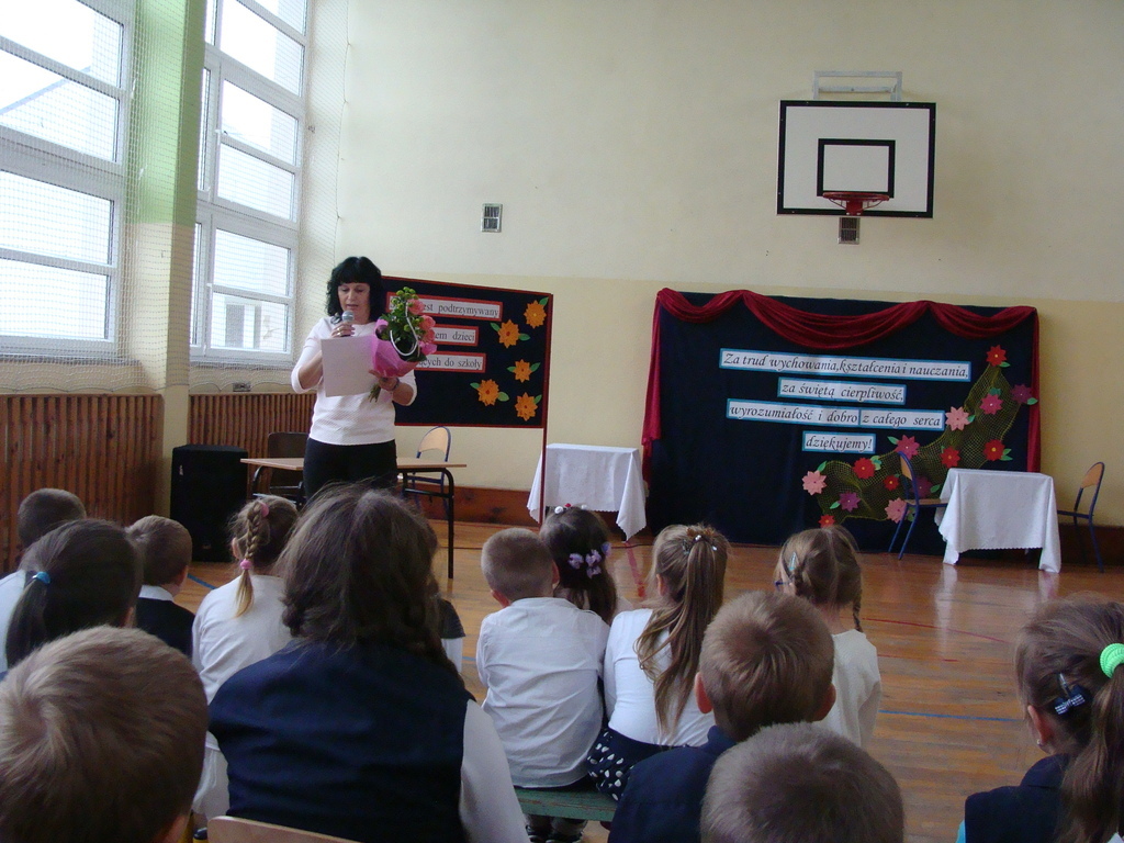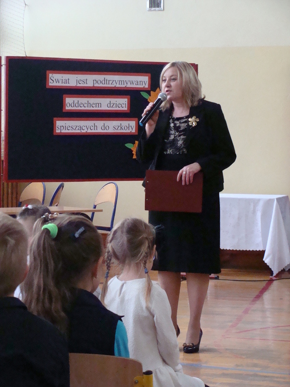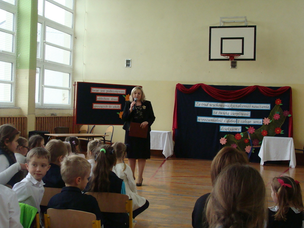W części oficjalnej głos zabrała pani dyrektor Edyta Igras, która podziękowała za trud wkładany każdego dnia w kształcenie i wychowanie młodego pokolenia oraz złożyła życzenia nauczycielom, pracownikom obsługi i uczniom z okazji tego święta.