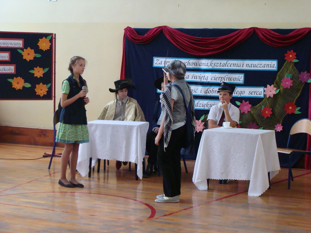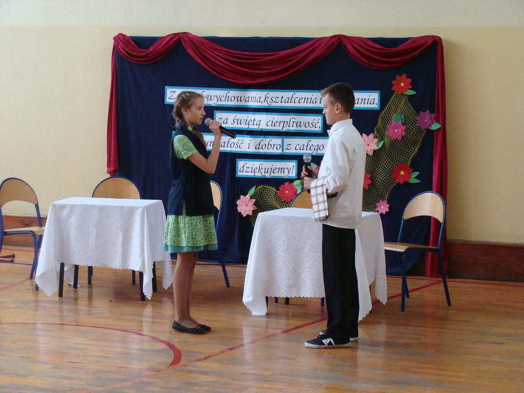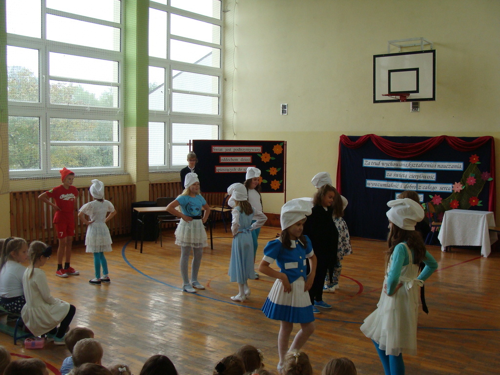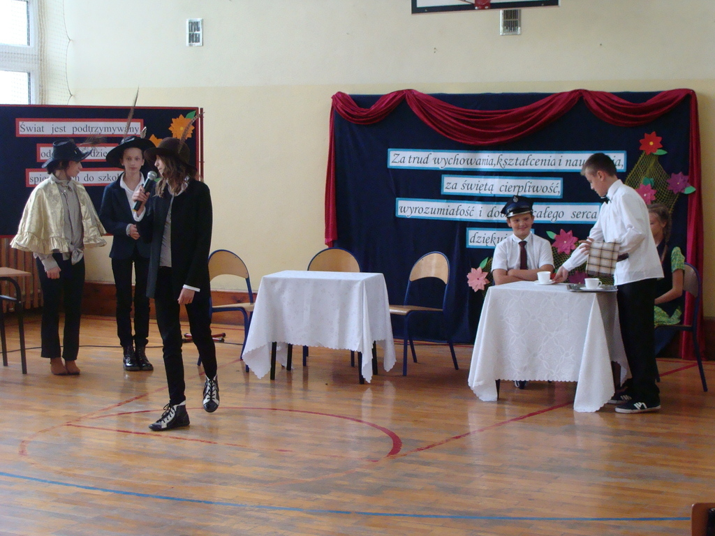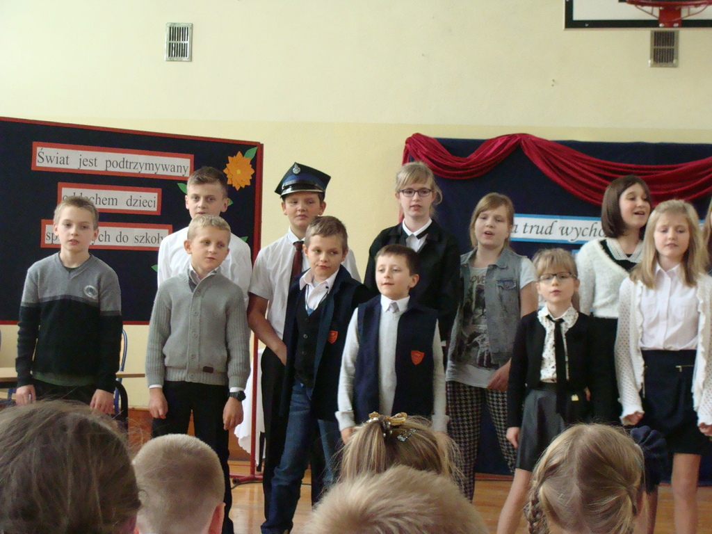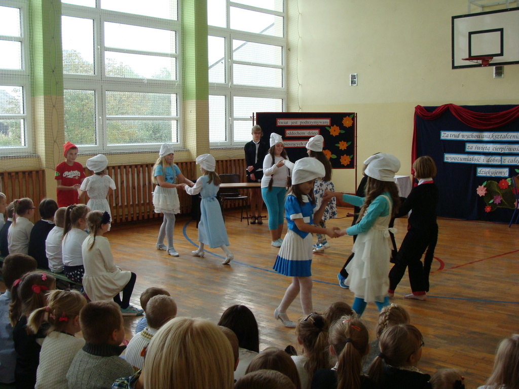 W części artystycznej zaprezentowali przedstawienie pt. "Czy szkoła jest potrzebna?". Tańcem, wierszem i piosenką wyrazili podziękowanie i słowa uznania dla trudnej pracy pedagogów. Wiele ciepłych słów popłynęło w kierunku nauczycieli i pracowników naszej szkoły.