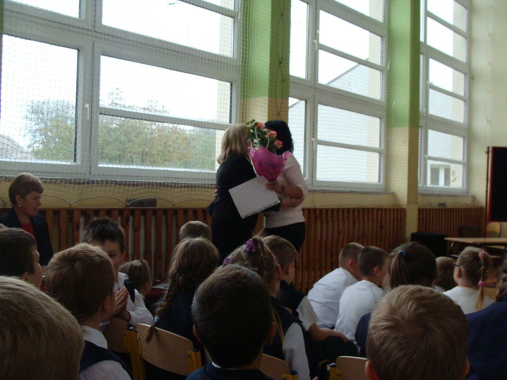 Następnie przedstawiciel rady rodziców - pani Irena Garbacz zwracając się do nauczycieli przekazała najlepsze życzenia, a na ręcę pani dyrektor złożyła bukiet kwiatów.