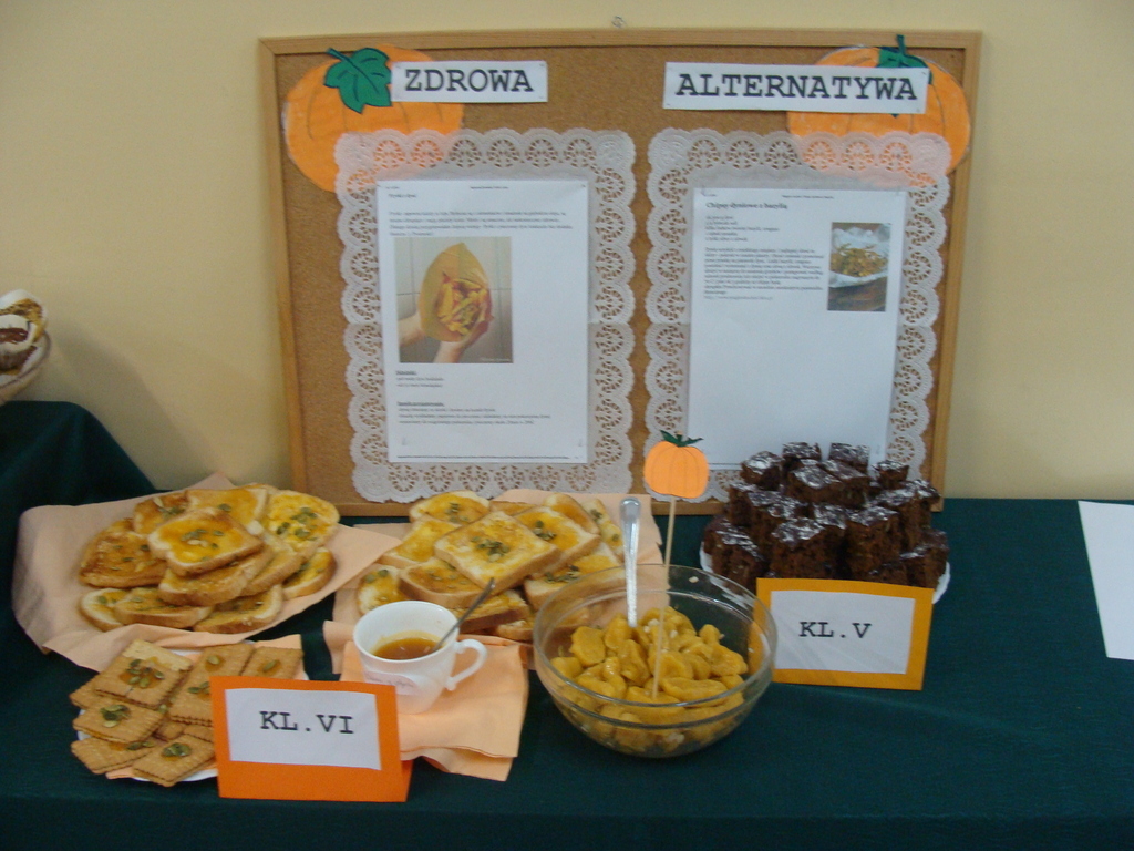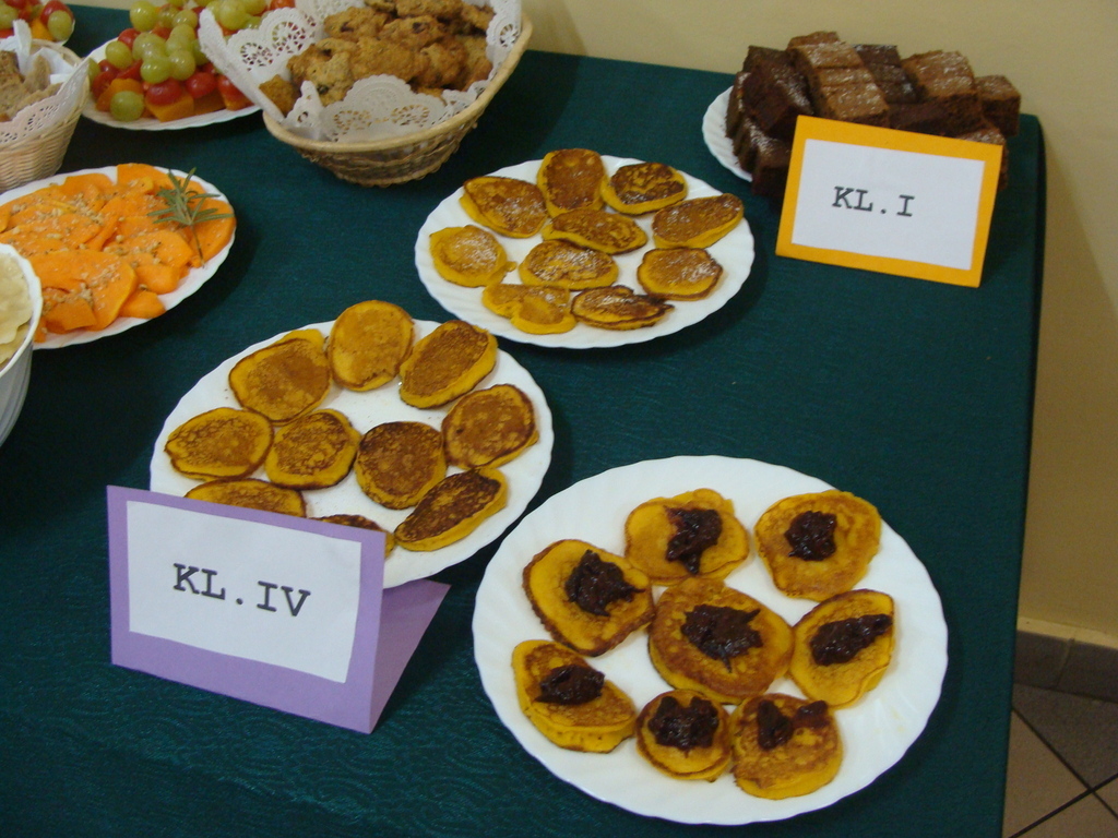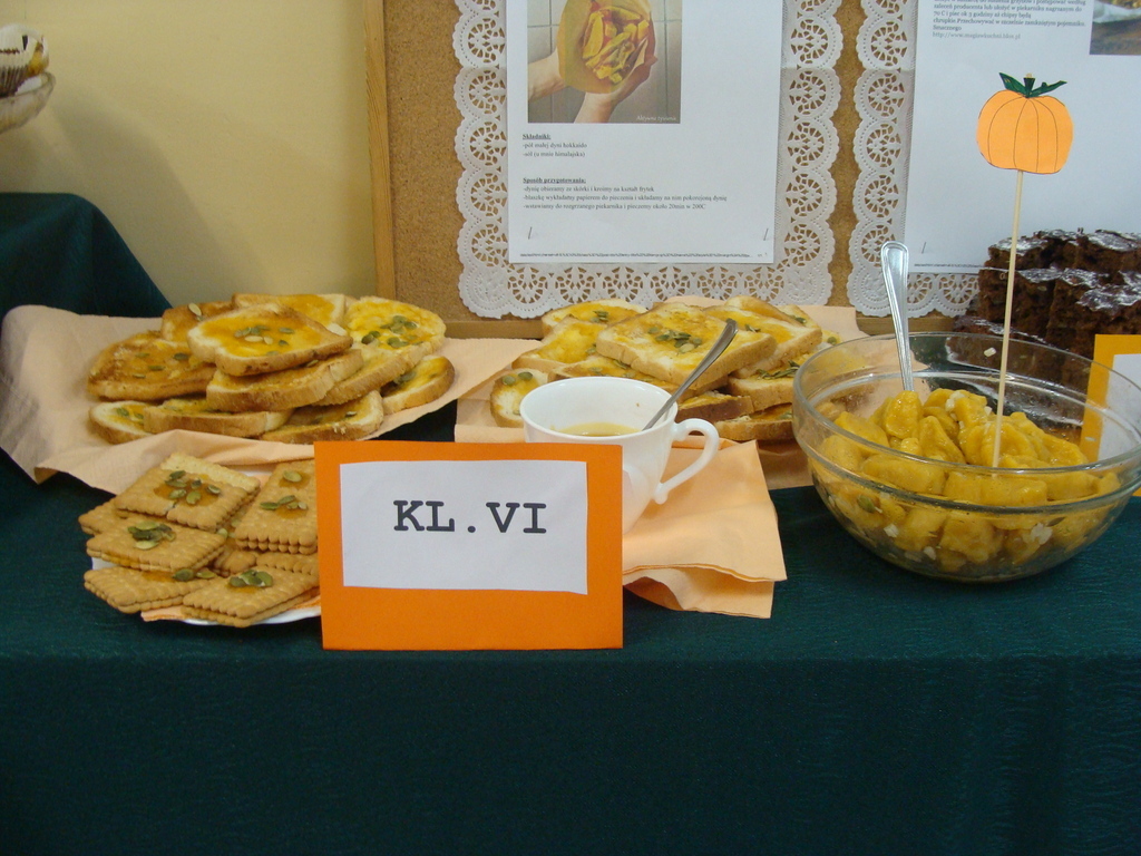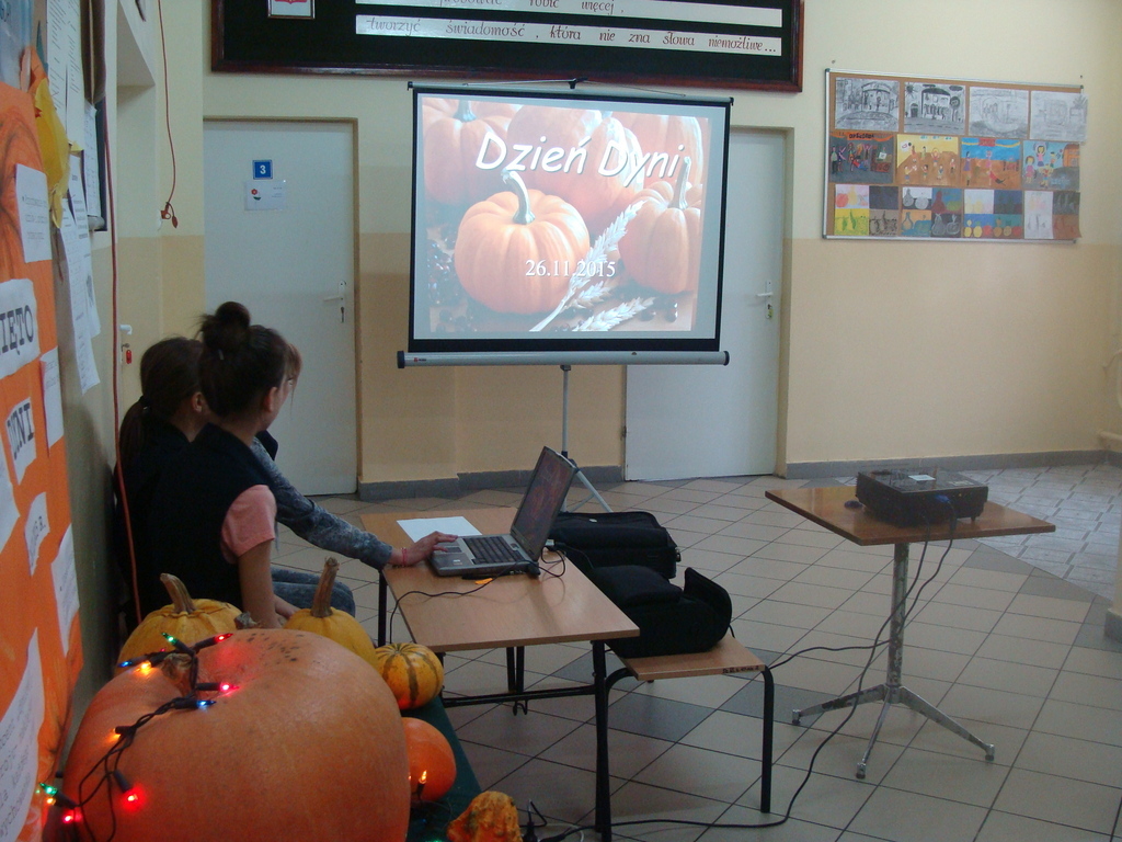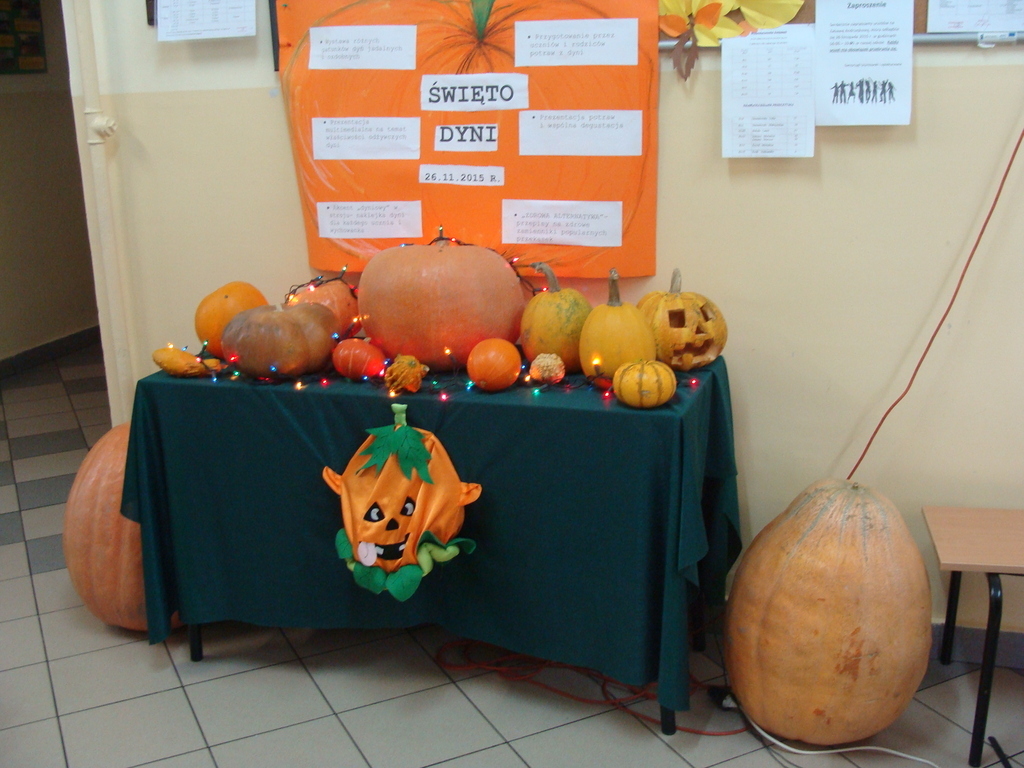 26 listopada w naszej szkole obchodziliśmy Święto Dyni. Wszyscy mieliśmy okazję zapoznać się z zaletami płynącymi ze spożywania tego warzywa oraz z przepisami na zdrowe dyniowe zamienniki popularnych niezdrowych przekąsek (frytki, chipsy). Uczniowie klasy szóstej przygotowali prezentację multimedialną na temat zalet płynących z jedzenia dyni oraz przedstawili jej główne jadalne gatunki. Po krótkiej części "oficjalnej" nastąpiła prezentacja przygotowanych przez wszystkie klasy potraw oraz najprzyjemniejsza część dnia- wspólna degustacja. Całą uroczystość uświetniała wystawa różnych odmian dyń- ogromnym zainteresowaniem cieszyły się te największe okazy.