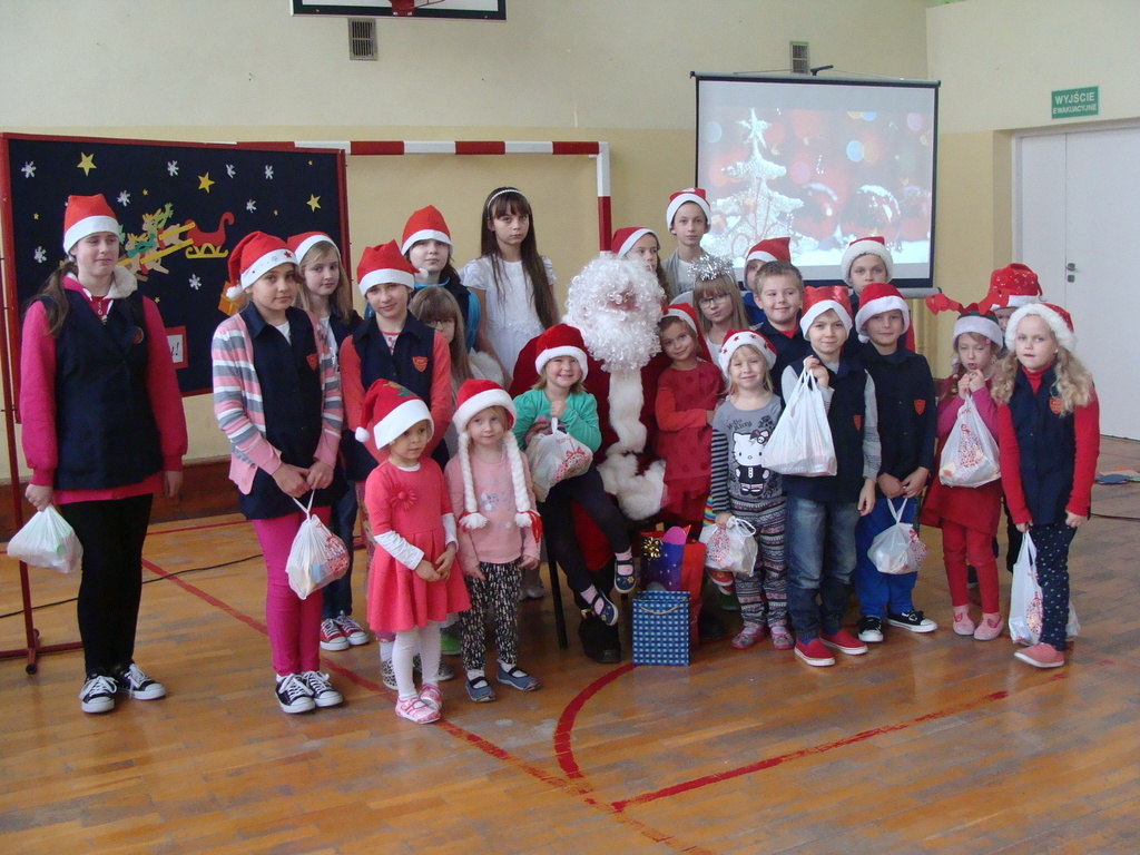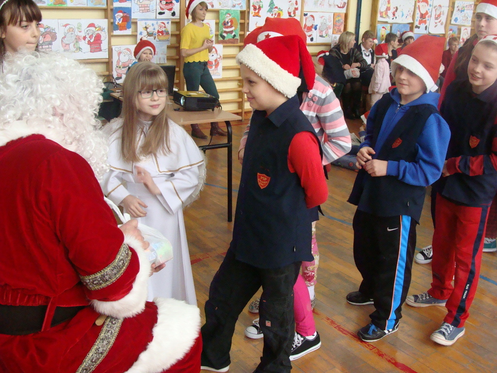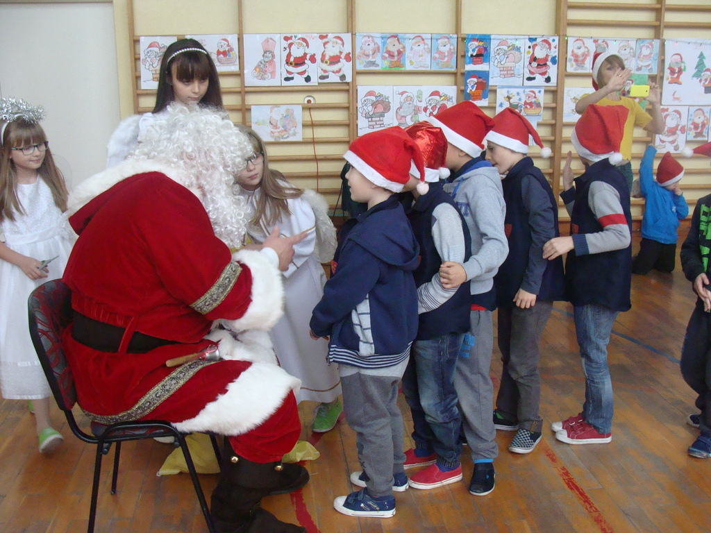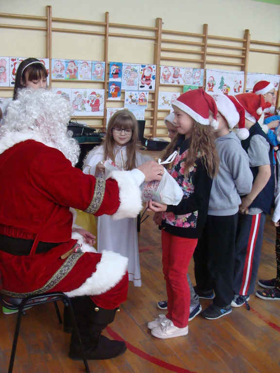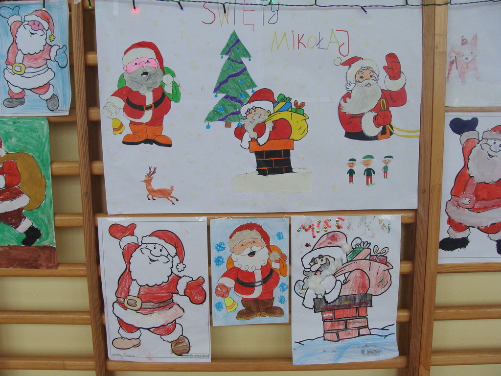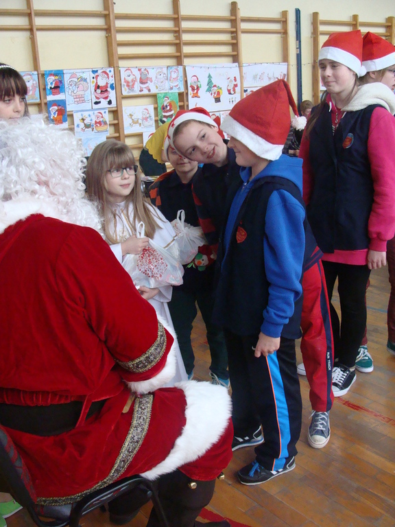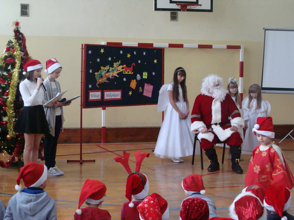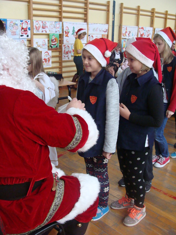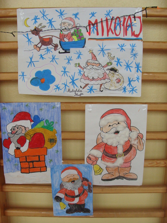 7 grudnia naszą szkołę odwiedził wyjątkowy gość- Święty Mikołaj. Przyniósł ze sobą wór pełen prezentów dla wszystkich grzecznych dzieci. Dzieci nie pozostały dłużne i również przygotowały Mikołajowi wspaniałe prezenty w postaci piosenek, wierszyków i plakatów z podobizną Świętego. Specjalnie na tę okazję wypisały też swoje dobre uczynki, by Mikołaj miał namacalne "dowody" ich dobrych serduszek.