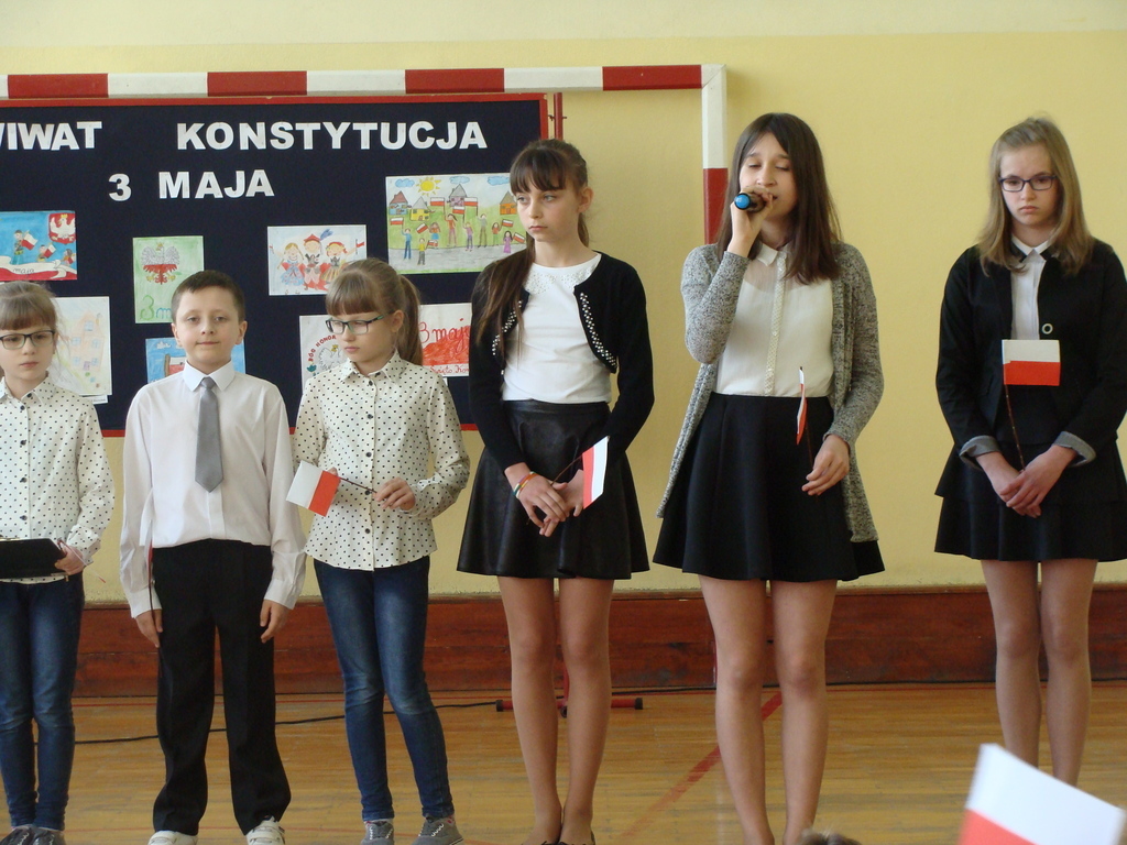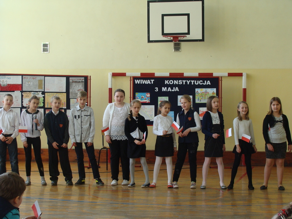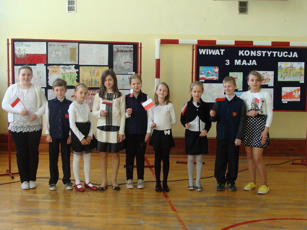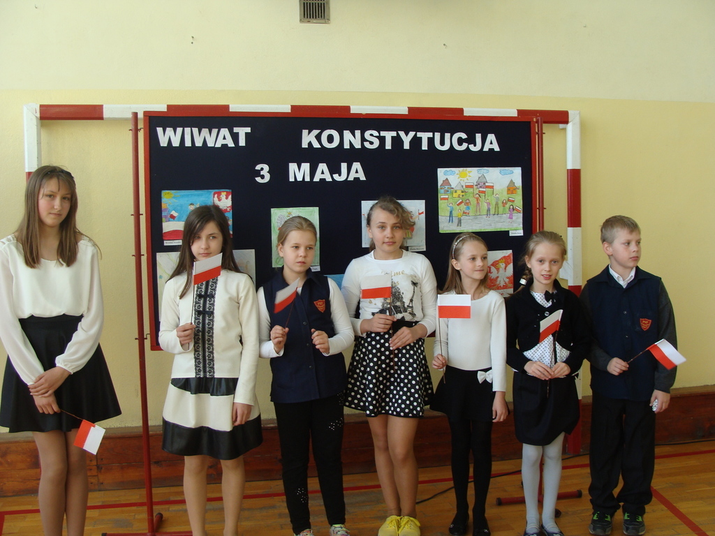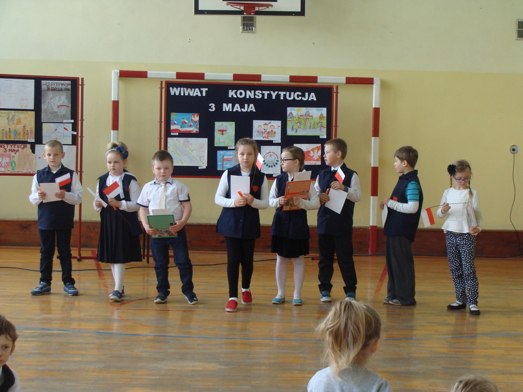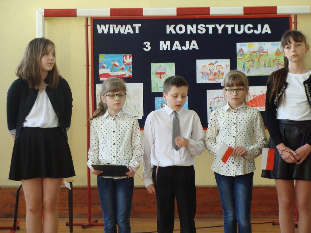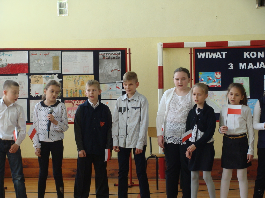 Uczniowie klasy szóstej, piątej i czwartej przygotowali lekcję historii, w której przypomnieli dlaczego czcimy dzień 3 Maja i z jakimi ważnymi wydarzeniami dla naszego kraju wiąże się ta data.