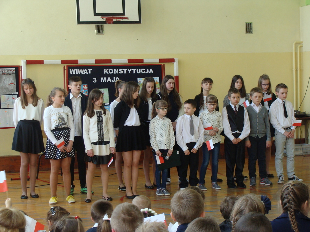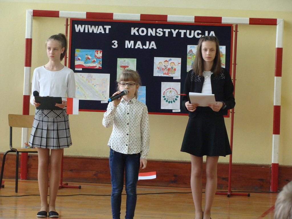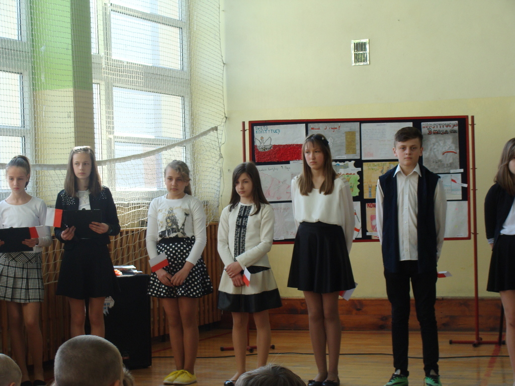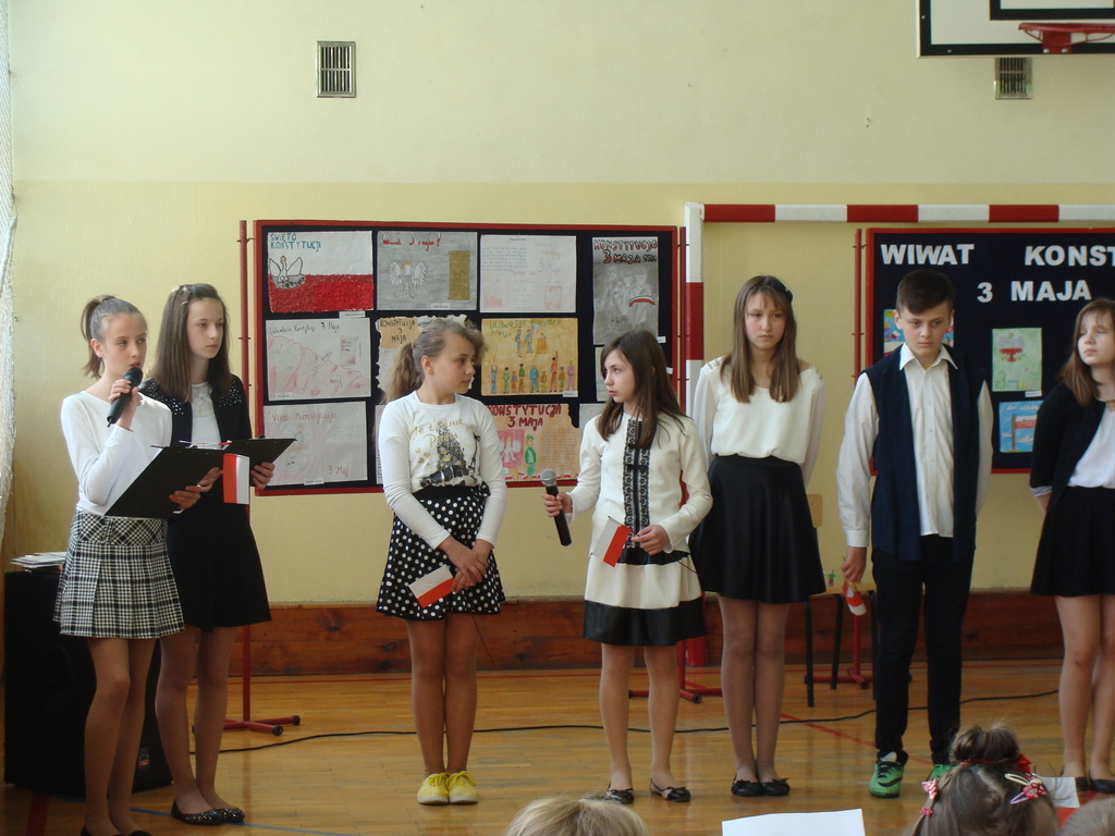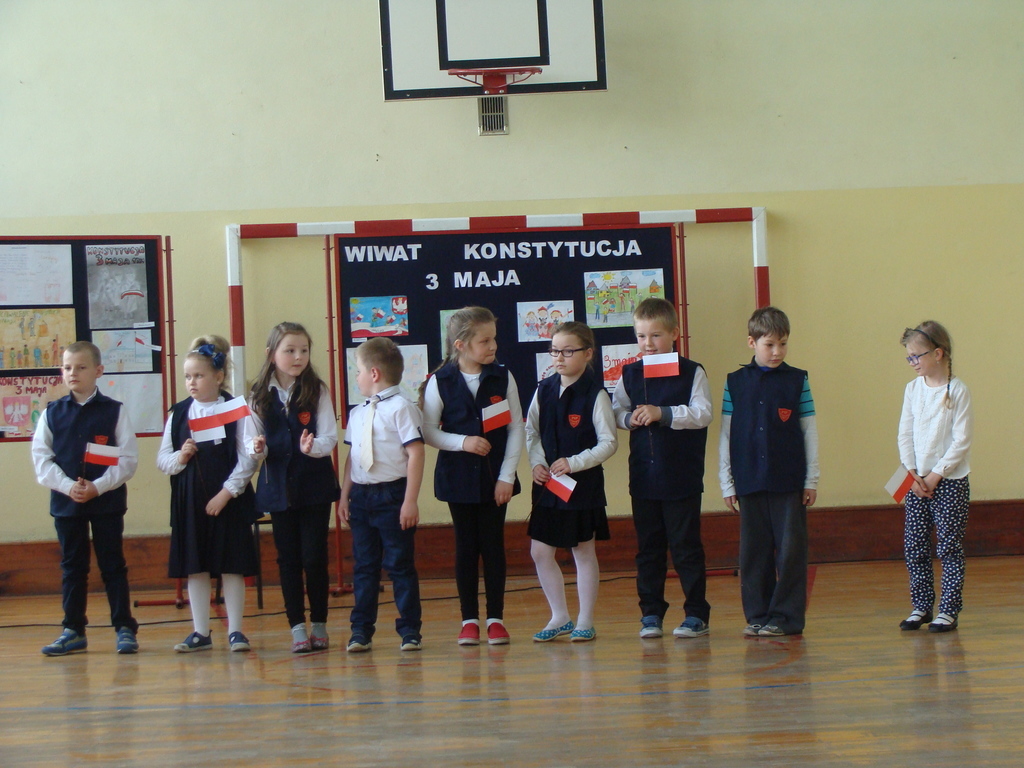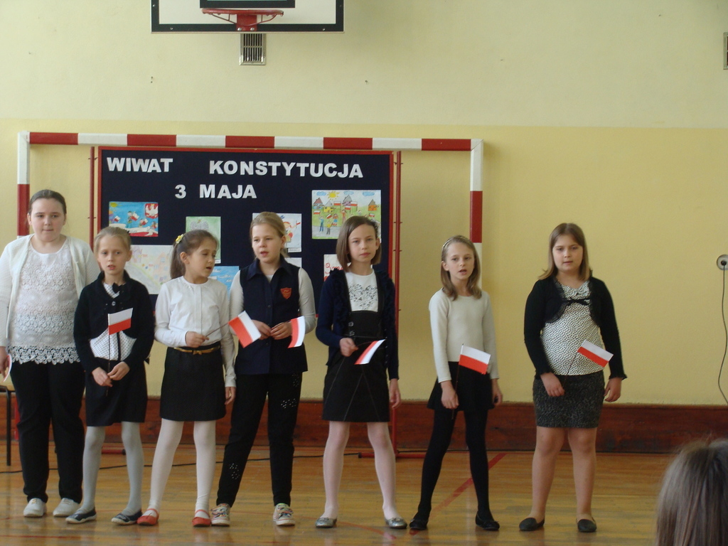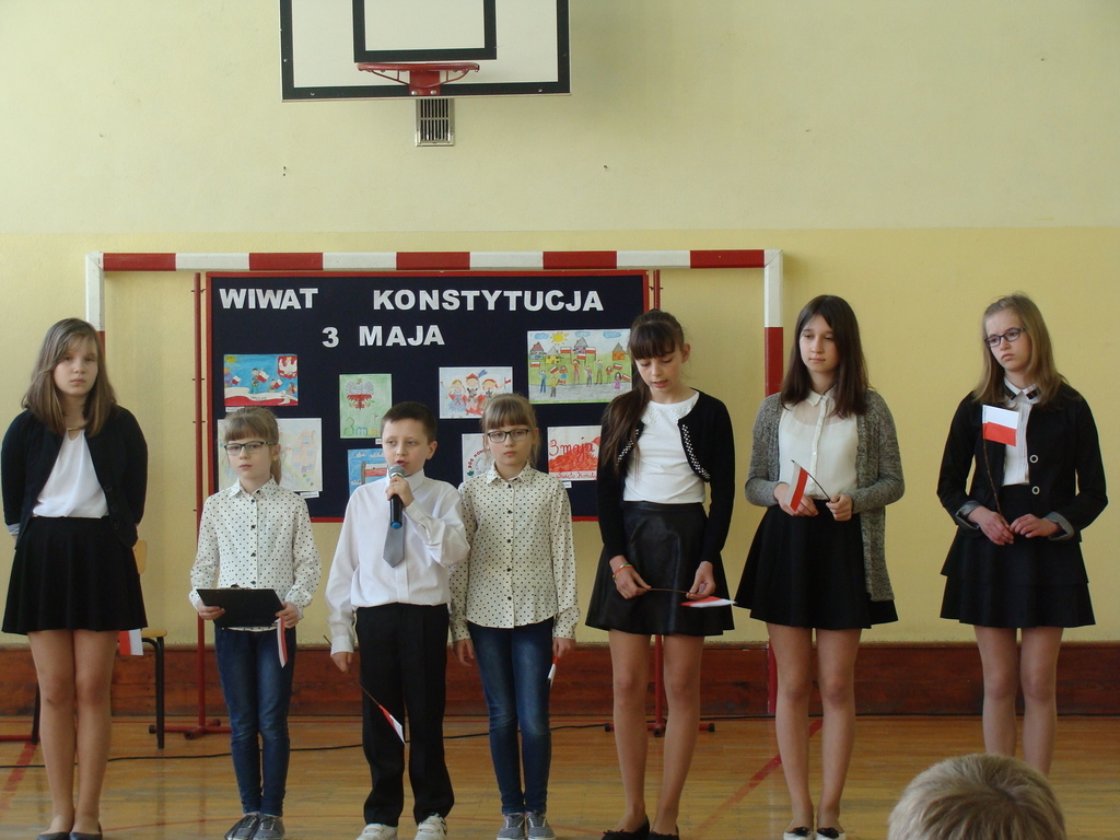 Uczniowie klasy szóstej, piątej i czwartej przygotowali lekcję historii, w której przypomnieli dlaczego czcimy dzień 3 Maja i z jakimi ważnymi wydarzeniami dla naszego kraju wiąże się ta data.