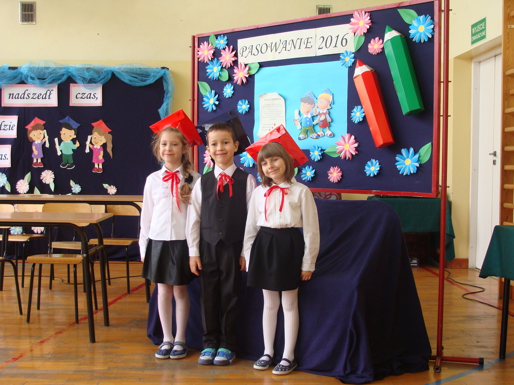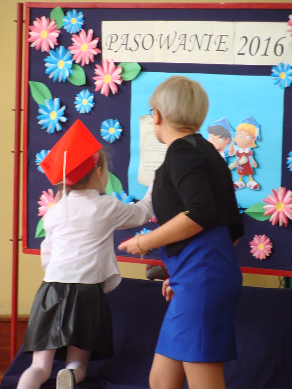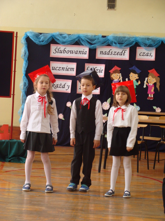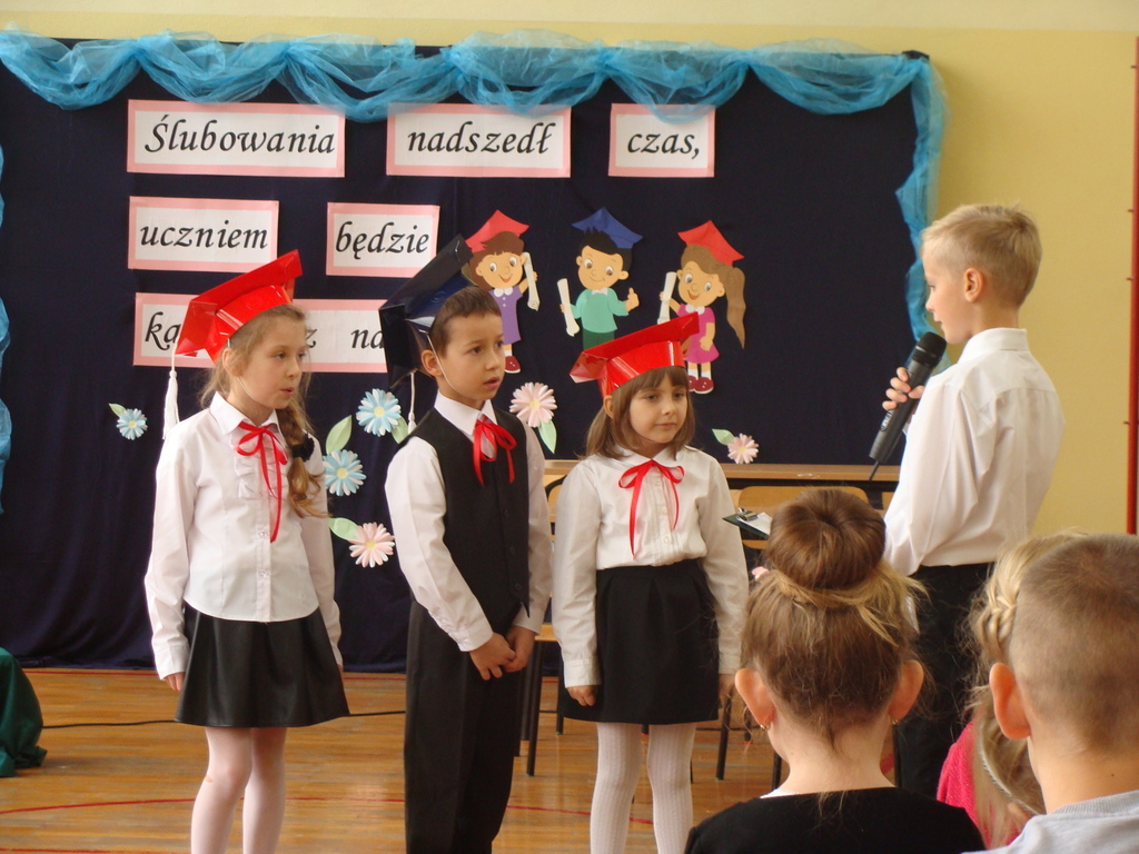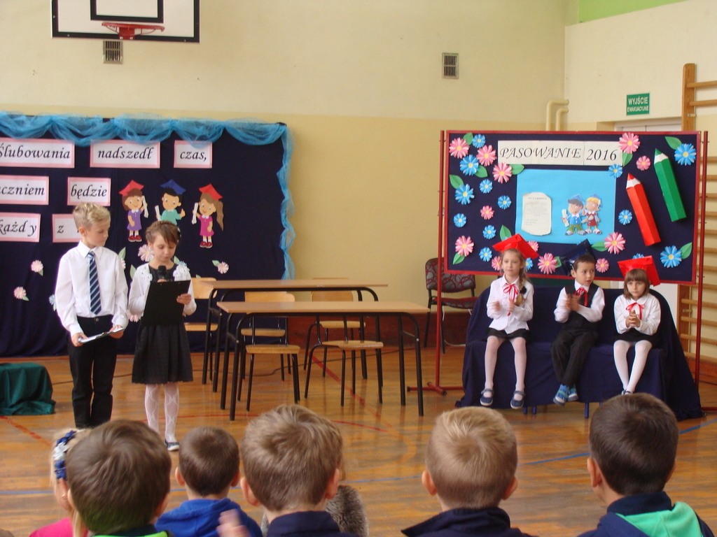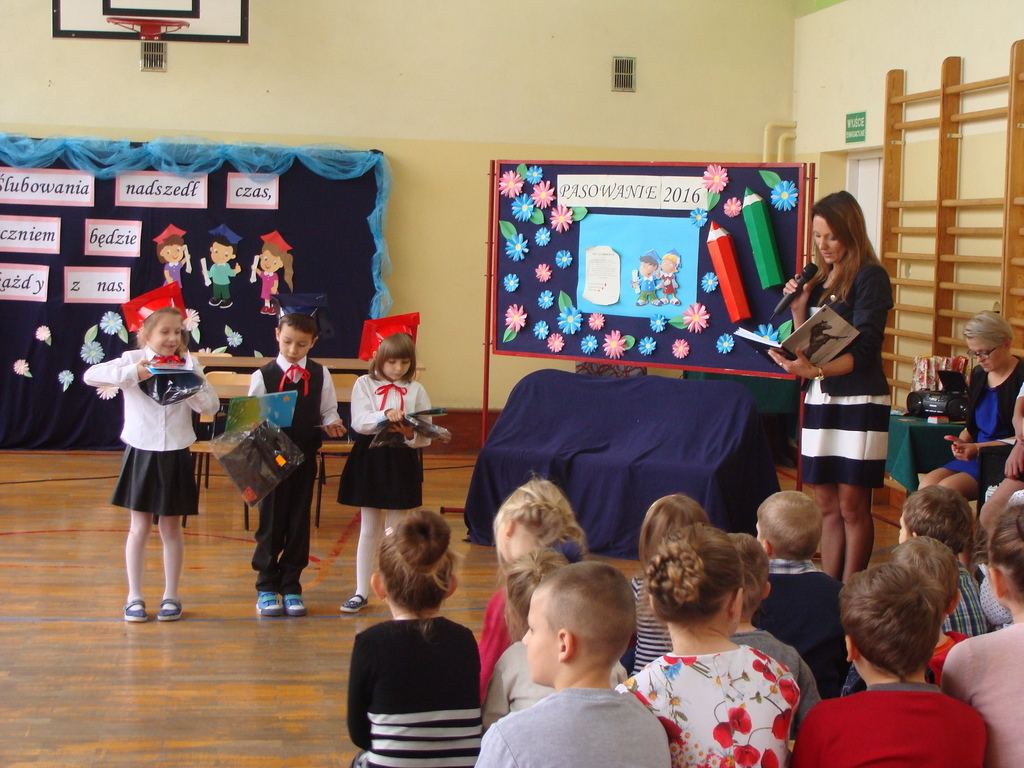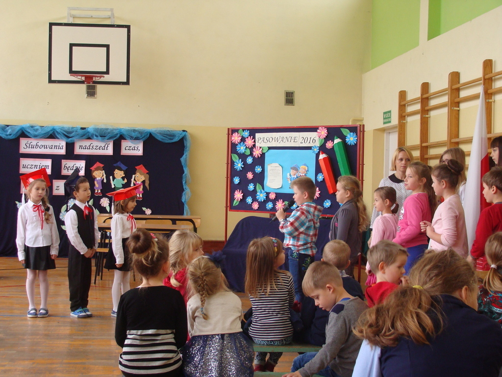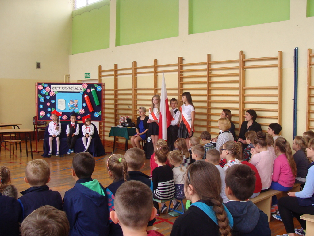 Po kilku tygodnia nauki pierwszoklasiści wykazali się wiedzą, umiejętnościami, znajomością ojczyzny i symboli narodowych, udowodnili, że poznali prawa i obowiązki ucznia, szkołę i jej otoczenie. Po wspaniale zdanym „egzaminie” uczniowie złożyli ślubowanie i zostali pasowani na uczniów przez dyrektora naszej szkoły panią Edytę Igras. Uczniowie klasy I otrzymali również pamiątkowe dyplomy, mundurki i pierwsze legitymacje. Ponadto pierwszoklasiści zostali obdarowani słodkim upominkiem przygotowanym przez rodziców. Kolejną niespodziankę dla pierwszaków przygotowali ich koledzy i koleżanki z klasy II, którzy przedstawili część artystyczną oraz wręczyli im misie – pluszaki. Uroczystość pasowania była niezwykłym przeżyciem dla wszystkich obecnych i pozostanie na długo w naszej pamięci.