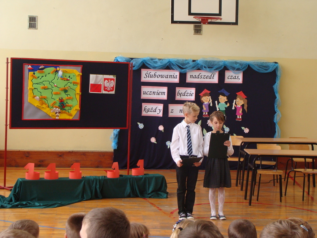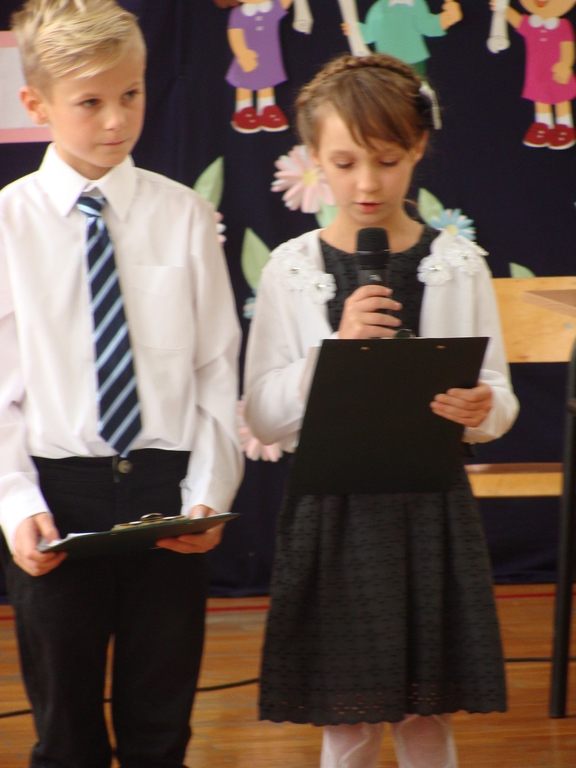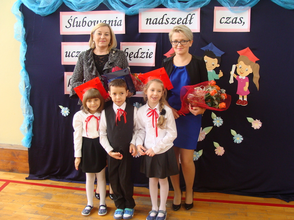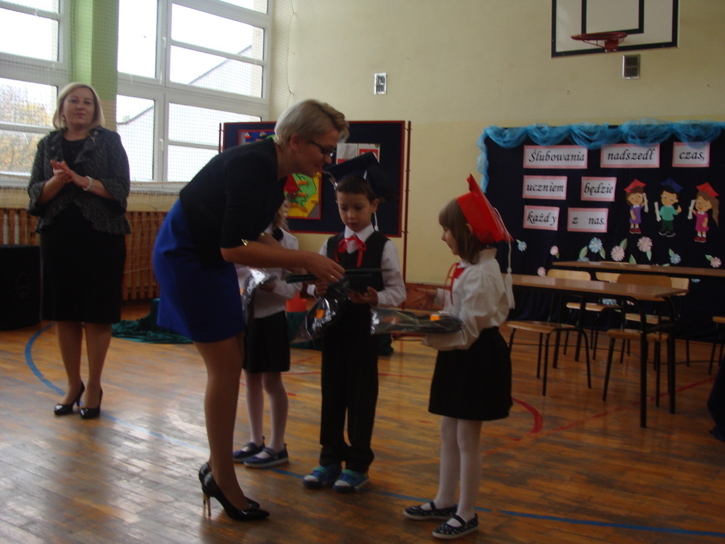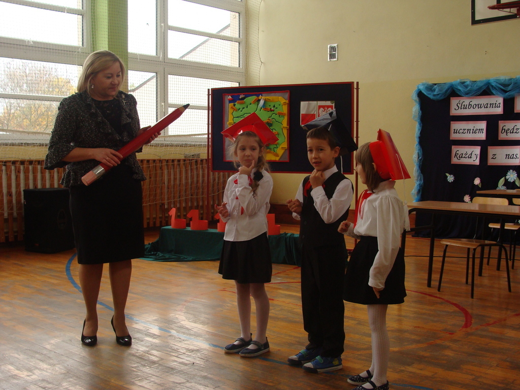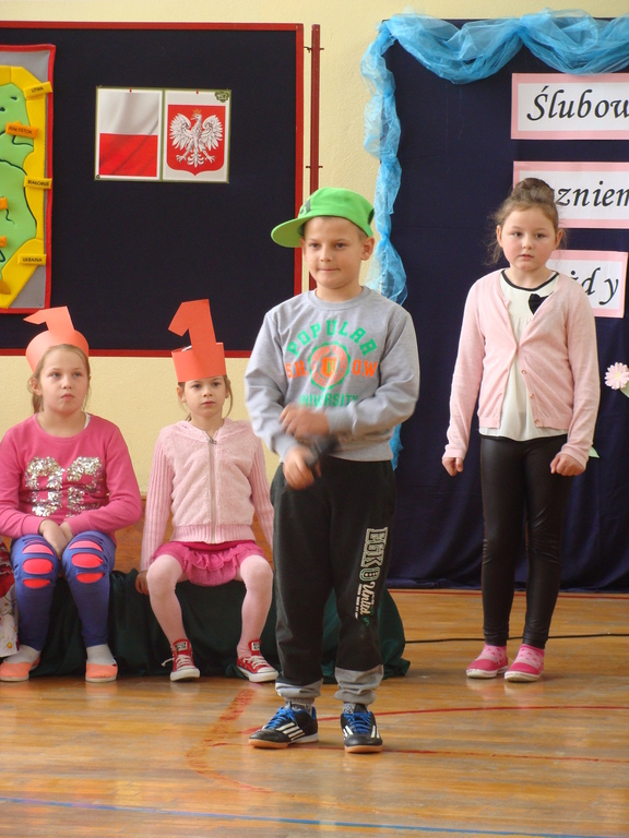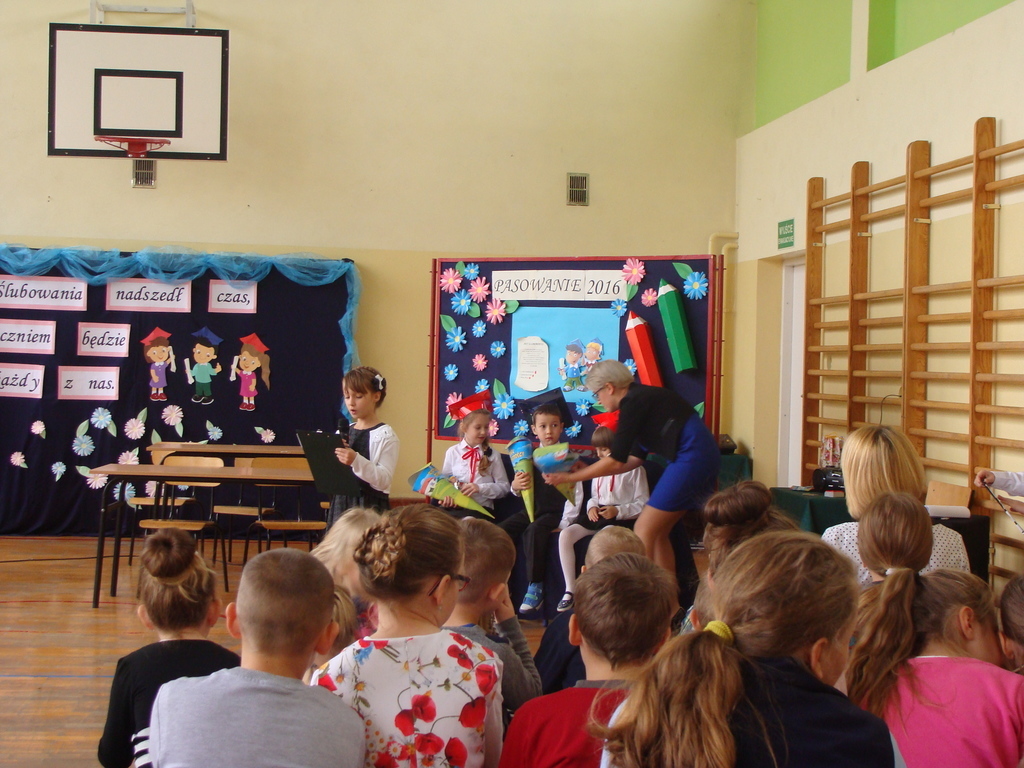 Po kilku tygodnia nauki pierwszoklasiści wykazali się wiedzą, umiejętnościami, znajomością ojczyzny i symboli narodowych, udowodnili, że poznali prawa i obowiązki ucznia, szkołę i jej otoczenie. Po wspaniale zdanym „egzaminie” uczniowie złożyli ślubowanie i zostali pasowani na uczniów przez dyrektora naszej szkoły panią Edytę Igras. Uczniowie klasy I otrzymali również pamiątkowe dyplomy, mundurki i pierwsze legitymacje. Ponadto pierwszoklasiści zostali obdarowani słodkim upominkiem przygotowanym przez rodziców. Kolejną niespodziankę dla pierwszaków przygotowali ich koledzy i koleżanki z klasy II, którzy przedstawili część artystyczną oraz wręczyli im misie – pluszaki. Uroczystość pasowania była niezwykłym przeżyciem dla wszystkich obecnych i pozostanie na długo w naszej pamięci.