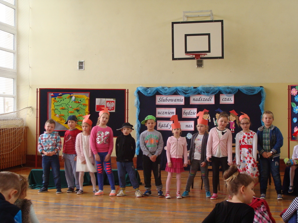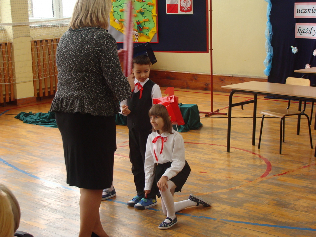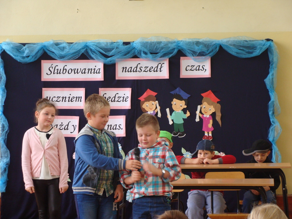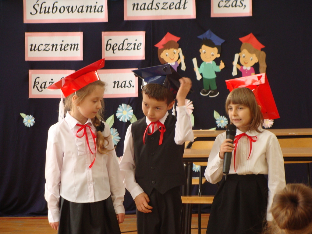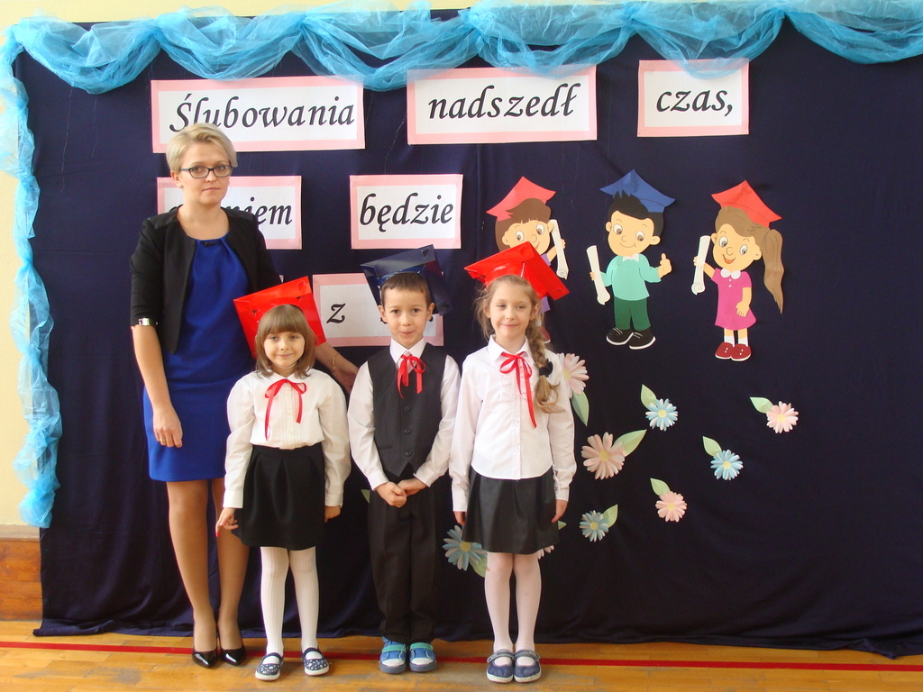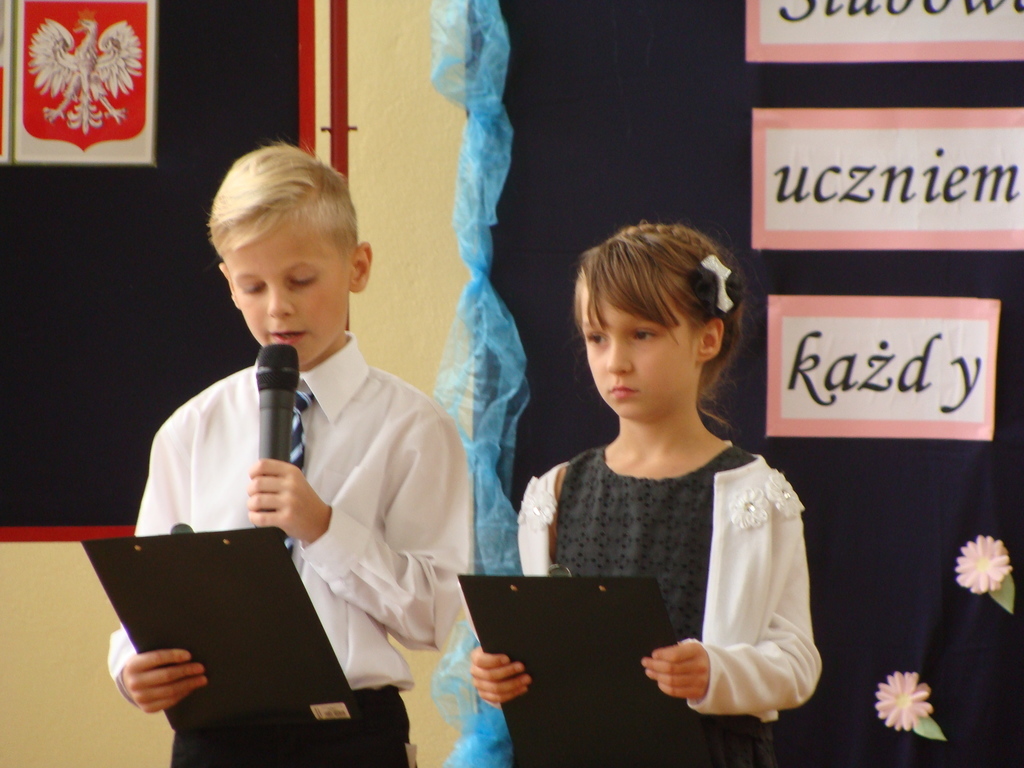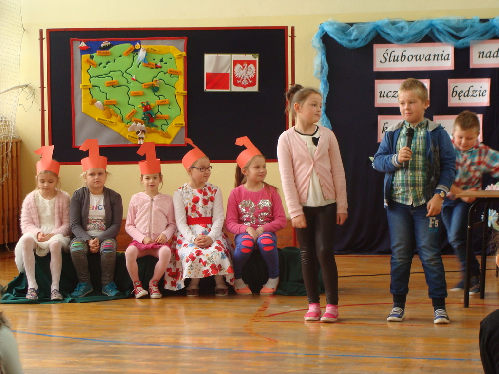 Po kilku tygodnia nauki pierwszoklasiści wykazali się wiedzą, umiejętnościami, znajomością ojczyzny i symboli narodowych, udowodnili, że poznali prawa i obowiązki ucznia, szkołę i jej otoczenie. Po wspaniale zdanym „egzaminie” uczniowie złożyli ślubowanie i zostali pasowani na uczniów przez dyrektora naszej szkoły panią Edytę Igras. Uczniowie klasy I otrzymali również pamiątkowe dyplomy, mundurki i pierwsze legitymacje. Ponadto pierwszoklasiści zostali obdarowani słodkim upominkiem przygotowanym przez rodziców. Kolejną niespodziankę dla pierwszaków przygotowali ich koledzy i koleżanki z klasy II, którzy przedstawili część artystyczną oraz wręczyli im misie – pluszaki. Uroczystość pasowania była niezwykłym przeżyciem dla wszystkich obecnych i pozostanie na długo w naszej pamięci.
