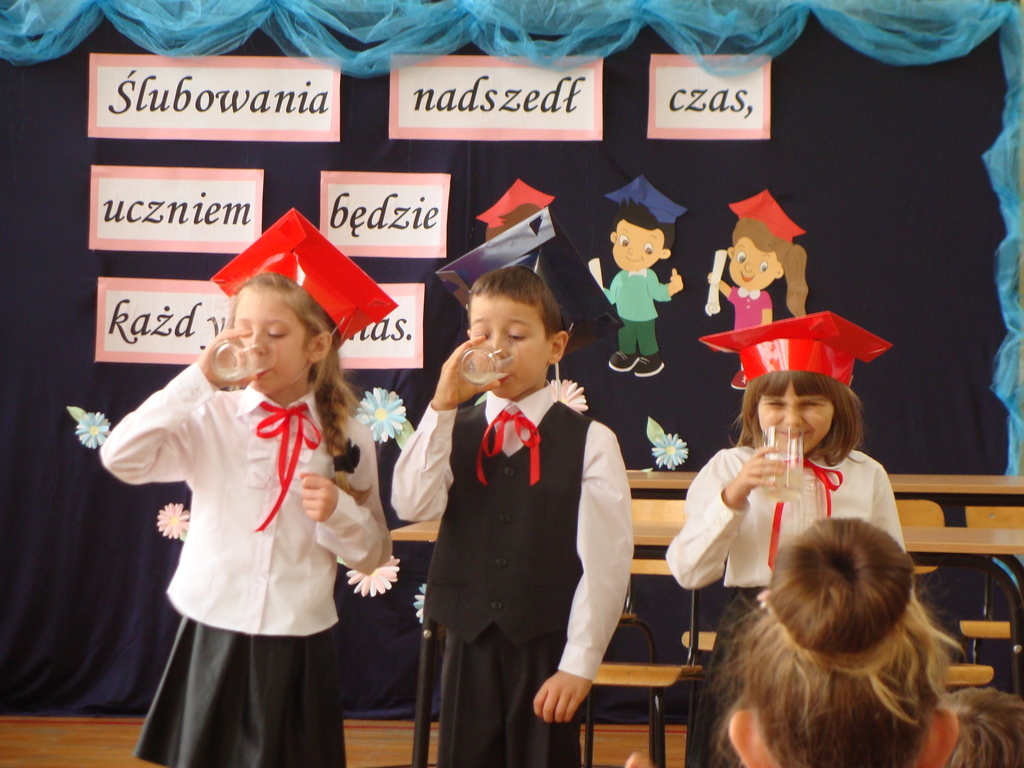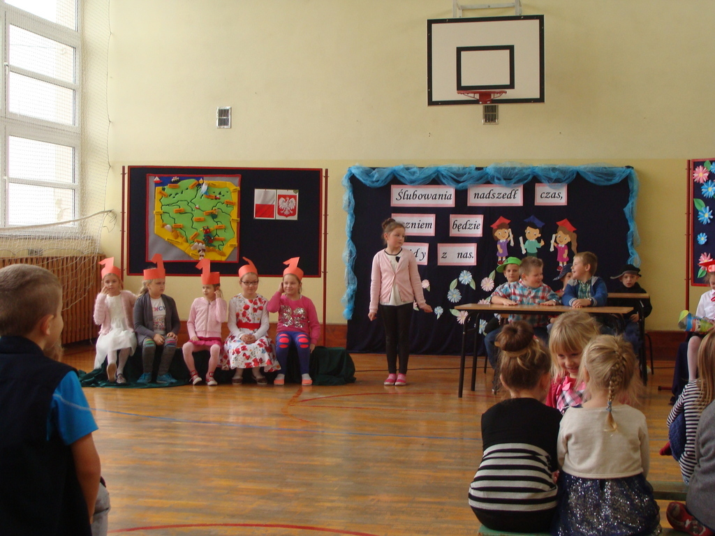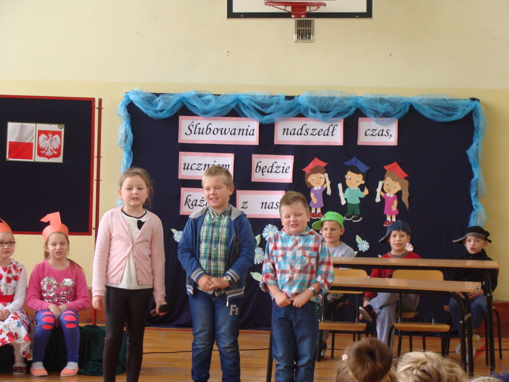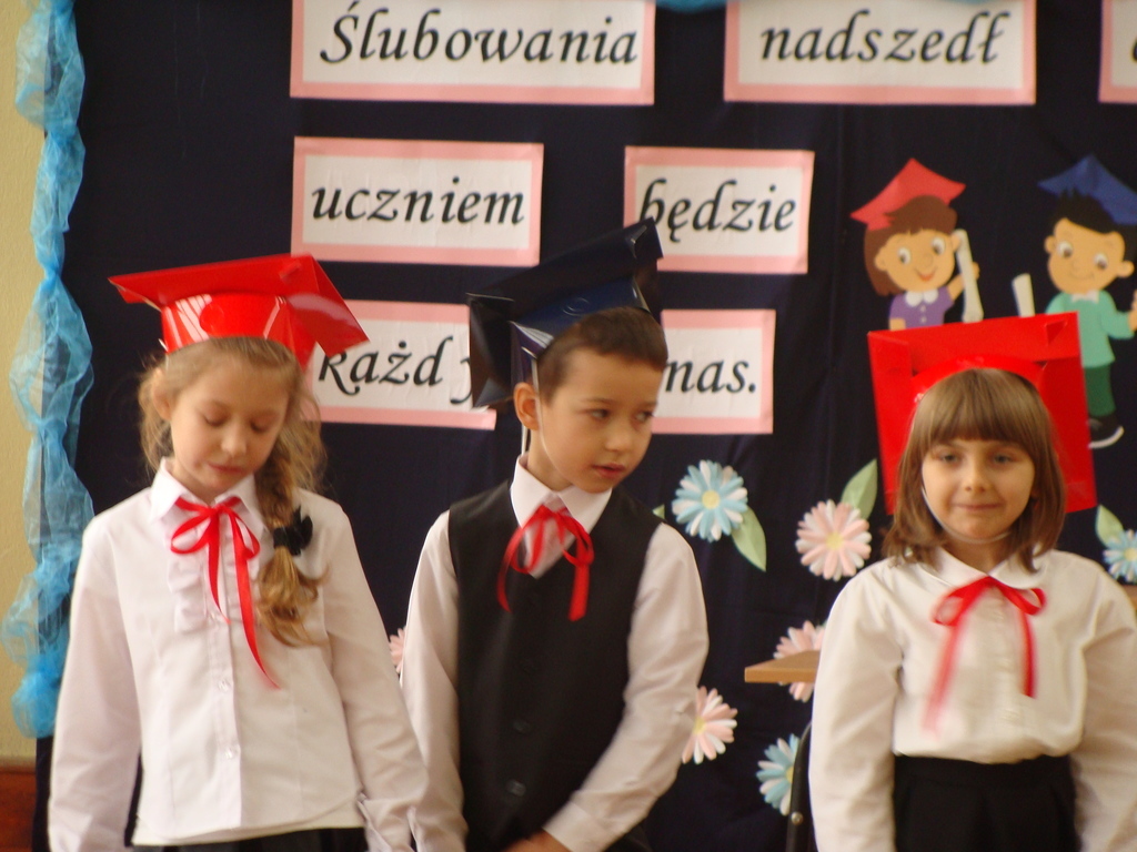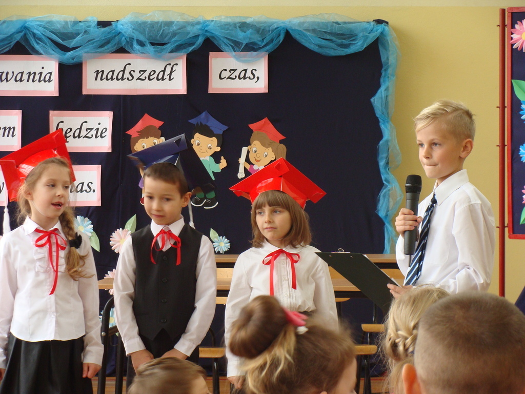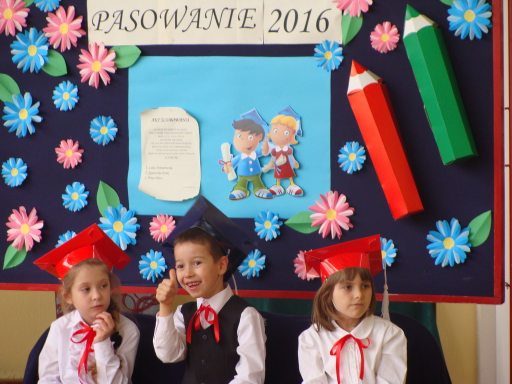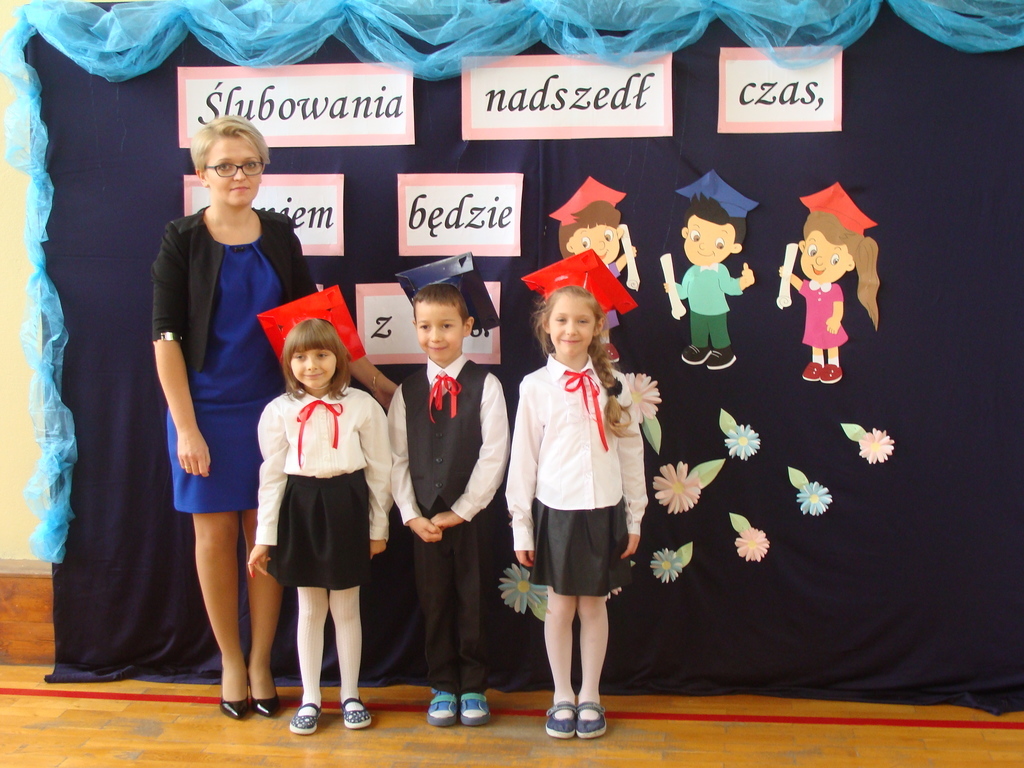 Po kilku tygodnia nauki pierwszoklasiści wykazali się wiedzą, umiejętnościami, znajomością ojczyzny i symboli narodowych, udowodnili, że poznali prawa i obowiązki ucznia, szkołę i jej otoczenie. Po wspaniale zdanym „egzaminie” uczniowie złożyli ślubowanie i zostali pasowani na uczniów przez dyrektora naszej szkoły panią Edytę Igras. Uczniowie klasy I otrzymali również pamiątkowe dyplomy, mundurki i pierwsze legitymacje. Ponadto pierwszoklasiści zostali obdarowani słodkim upominkiem przygotowanym przez rodziców. Kolejną niespodziankę dla pierwszaków przygotowali ich koledzy i koleżanki z klasy II, którzy przedstawili część artystyczną oraz wręczyli im misie – pluszaki. Uroczystość pasowania była niezwykłym przeżyciem dla wszystkich obecnych i pozostanie na długo w naszej pamięci.