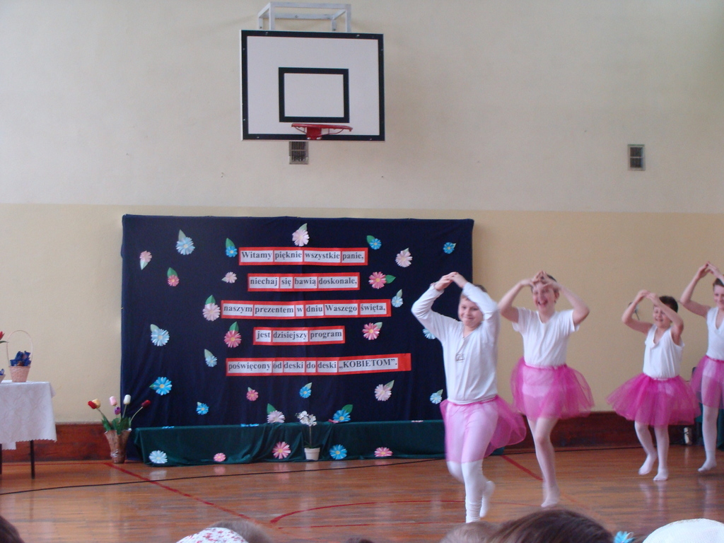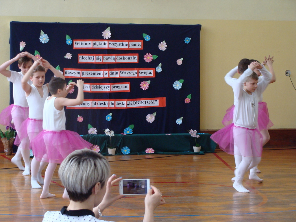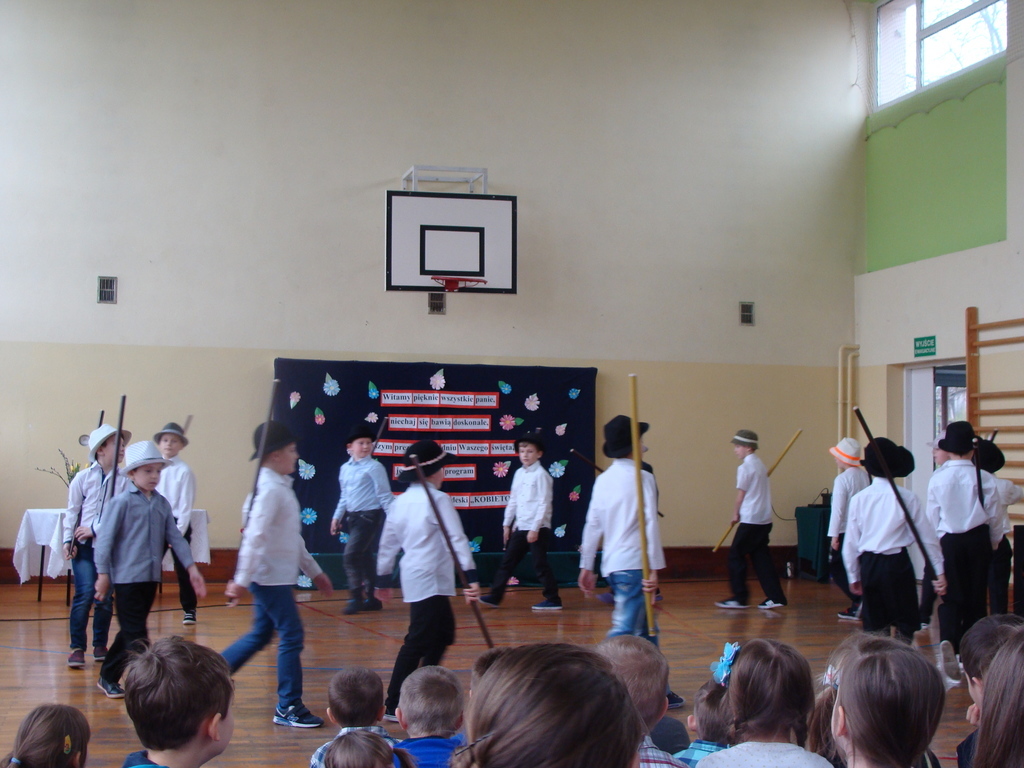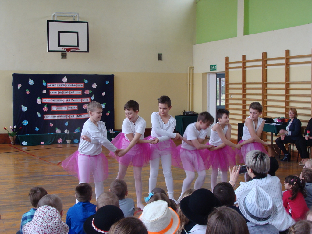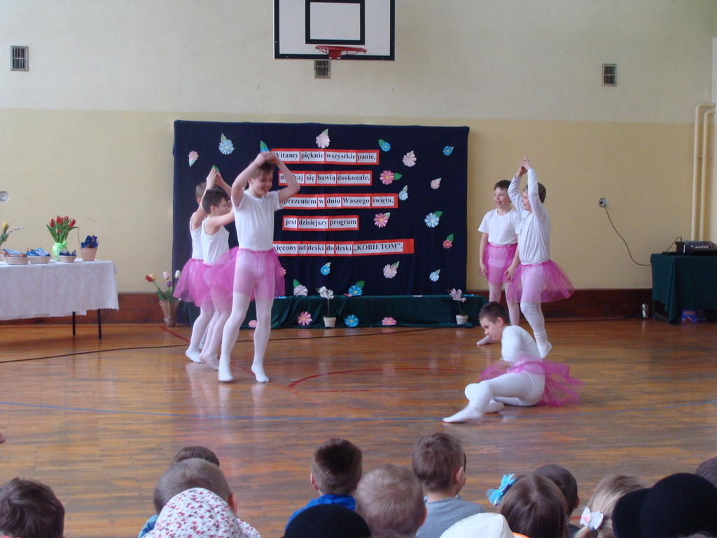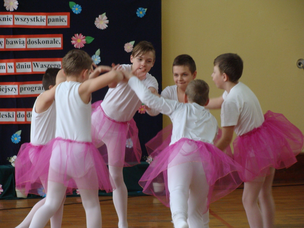 Największe wrażenie na małych i dużych kobietach zrobiły tańce przygotowane przez chłopców. Wcielili się oni w baletnice z baletu "Jezioro łabędzie" oraz dżentelmenów tańczących w kapeluszach. Występy uświetniła piosenka w wykonaniu dziewczynek z klasy II i III.