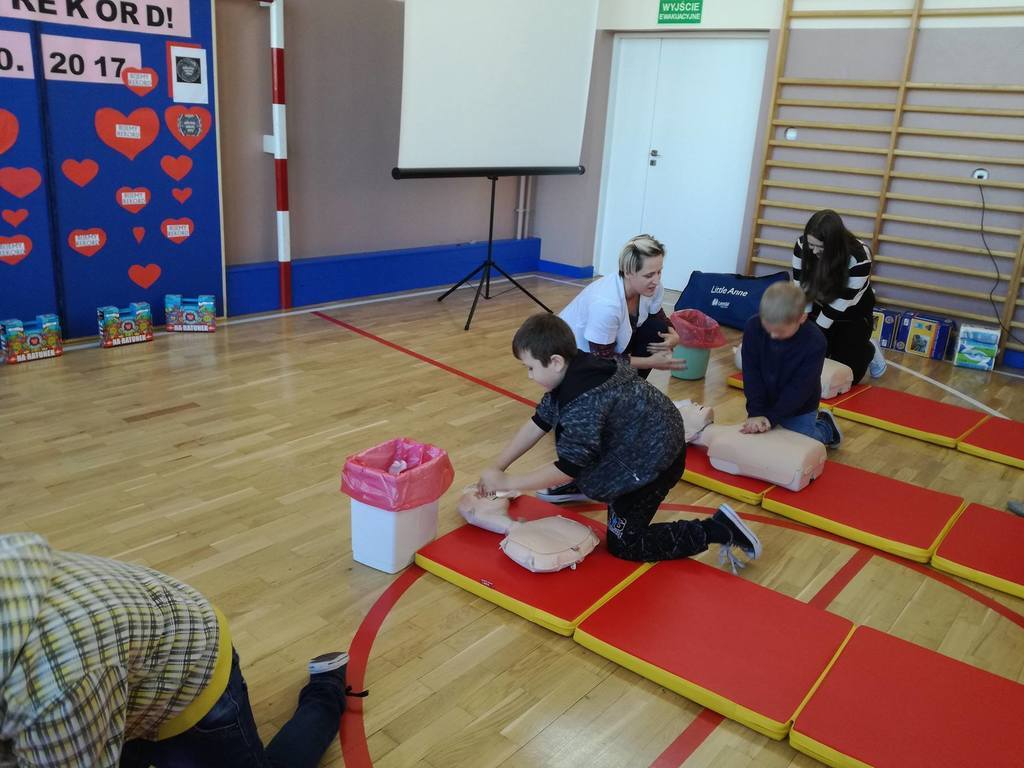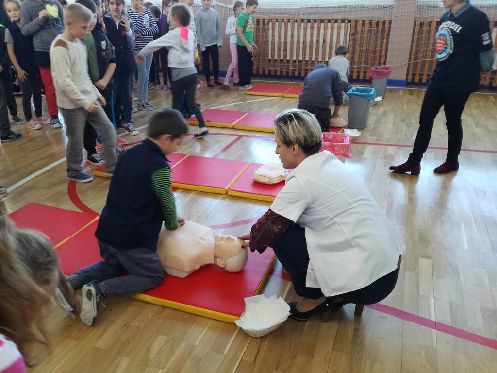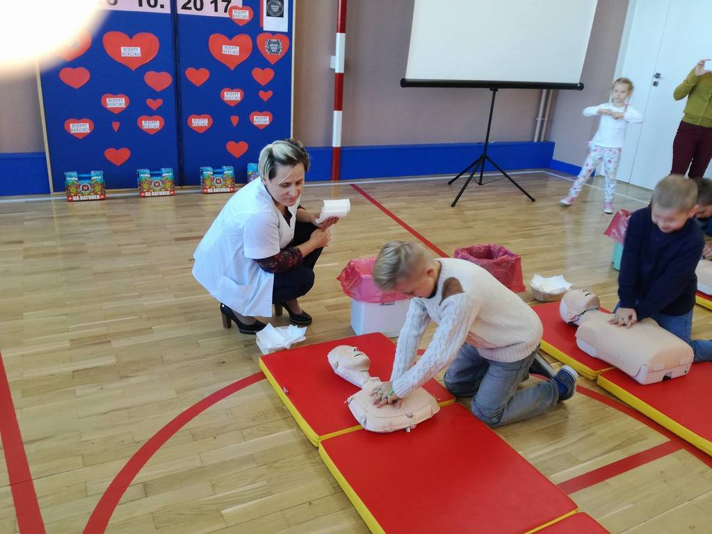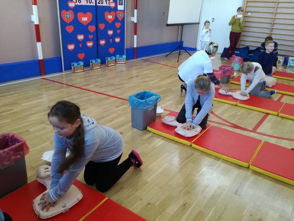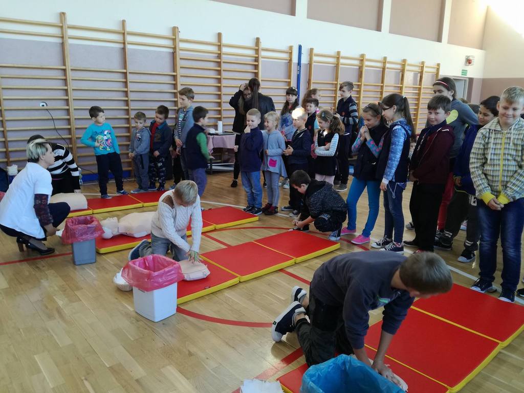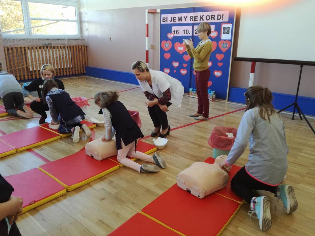 Dnia 16 października 2017r. nasza szkoła- jak co roku- dołączyła do akcji Ratujemy i Uczymy Ratować (bicie rakordu), organizowanej przez Wielką Orkiestrę Świątecznej Pomocy. W udzielaniu pierwszej pomocy wzięło udział 58 uczniów, którzy przez pół godziny ćwiczyli resyscytację krążeniowo- oddechową na pięciu fantomach.