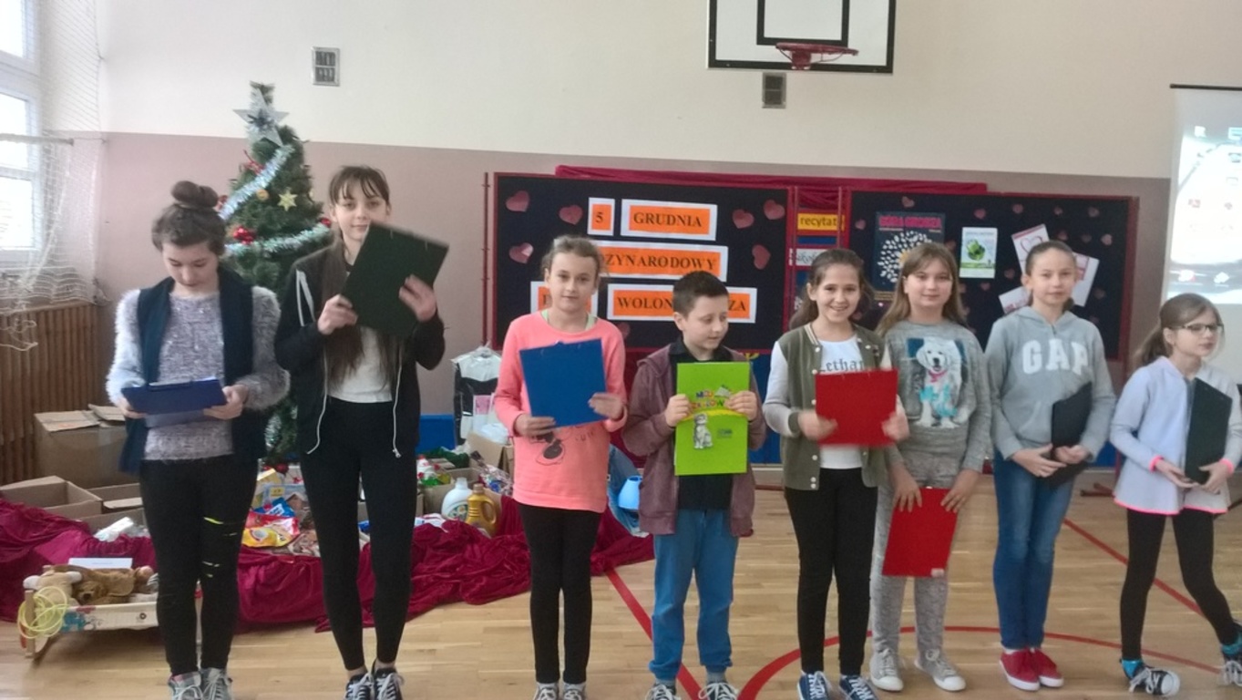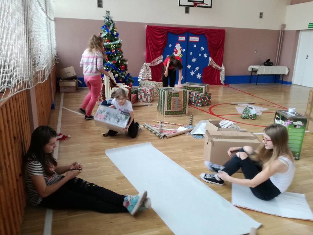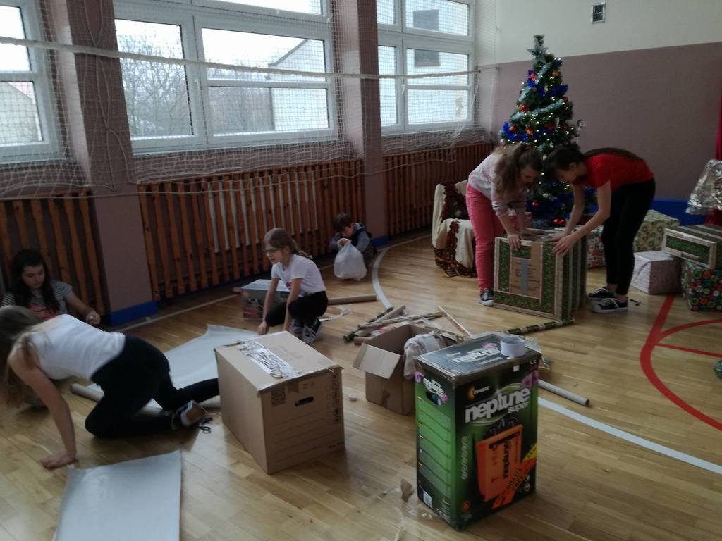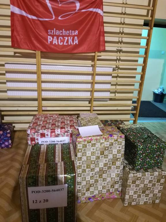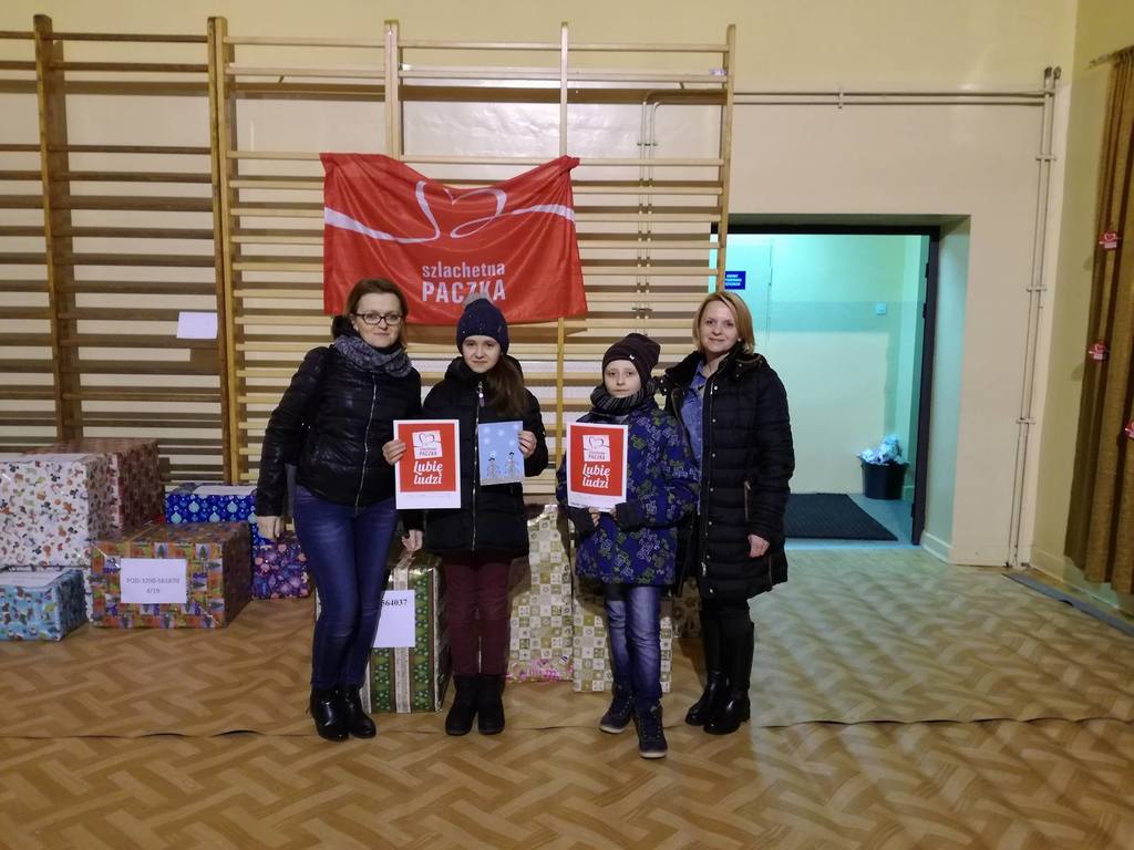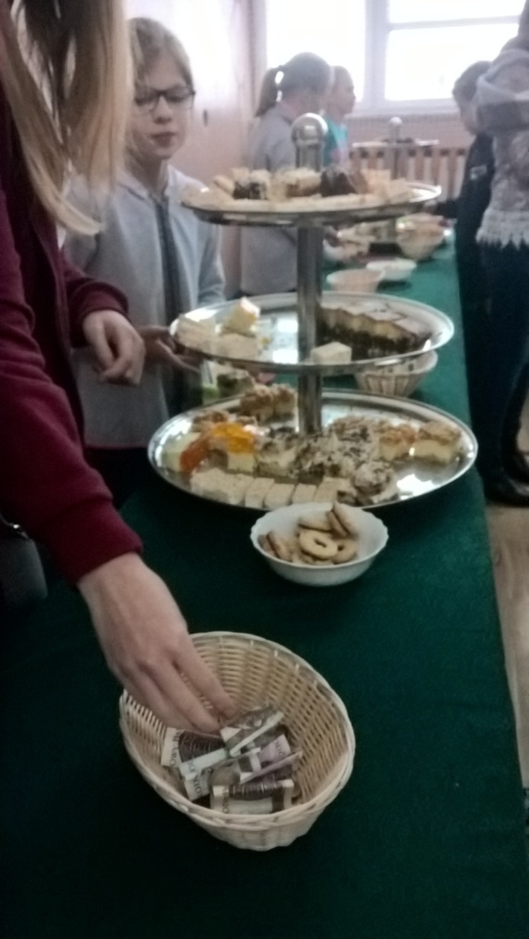 Dzięki hojności oraz dobremu sercu uczniów, rodziców, pracowników szkoły, udało nam się zgromadzić wiele artykułów spożywczych, środków czystości, przyborów szkolnych a także kołdrę, poduszkę, ubrania, garnki, buty, zabawki. Aby zakupić brakujące rzeczy, zorganizowaliśmy kiermasz ciast upieczonych przez rodziców, który został zorganizowany 5 grudnia- w Międzynarodowy Dzień Wolontariusza. Wszystkie zgromadzone artykuły wspólnie spakowaliśmy, opisaliśmy i 9 grudnia zawieźliśmy do magazynu, z którego wolontariusze dostarczyli je do wybranej przez nas rodziny. Serdecznie dziękujemy panu Stanisławowi Ryczko za to, że poświęcił swój czas i nieodpłatnie zawiózł spakowane produkty do Niska.