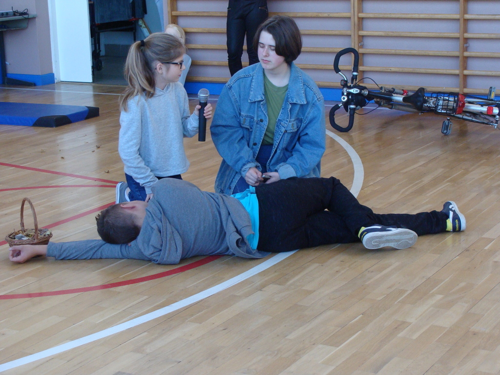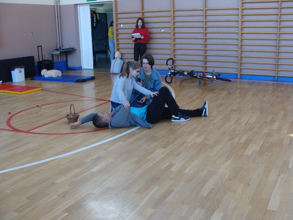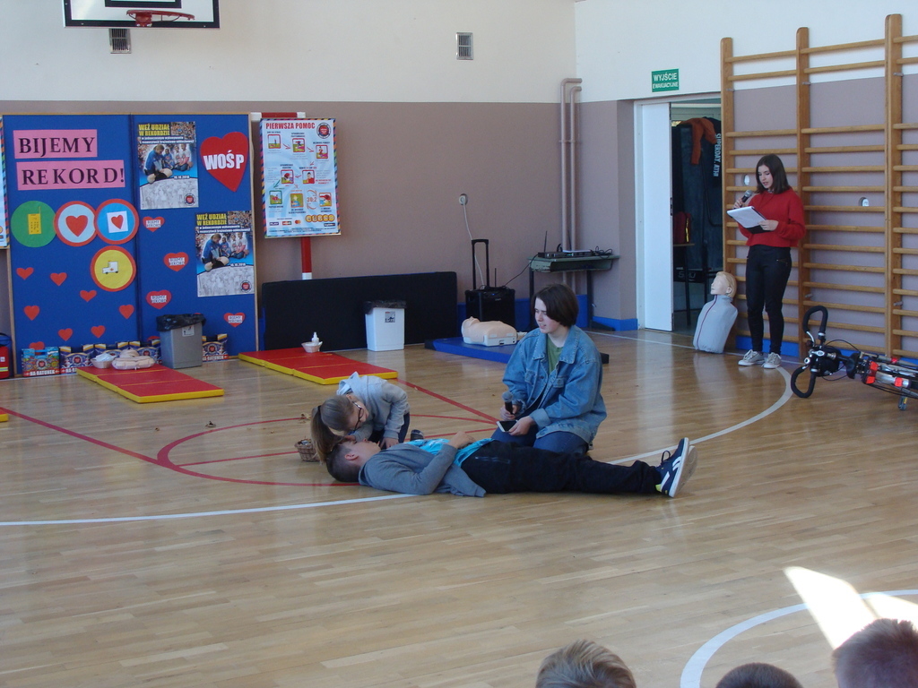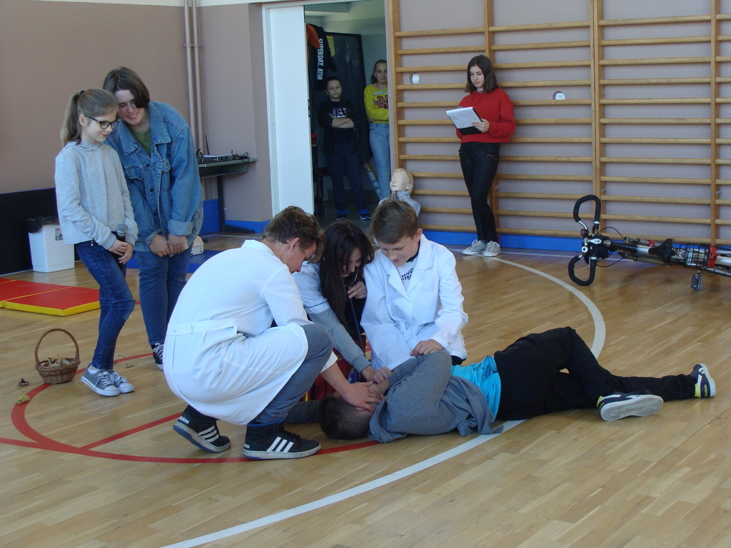 Przed przystąpieniem do akcji, wszyscy uczestnicy akcji, obejrzeli scenkę przygotowaną przez uczniów klasy ósmej, w której zaprezentowali jak krok po kroku udzielać pierwszej pomocy.