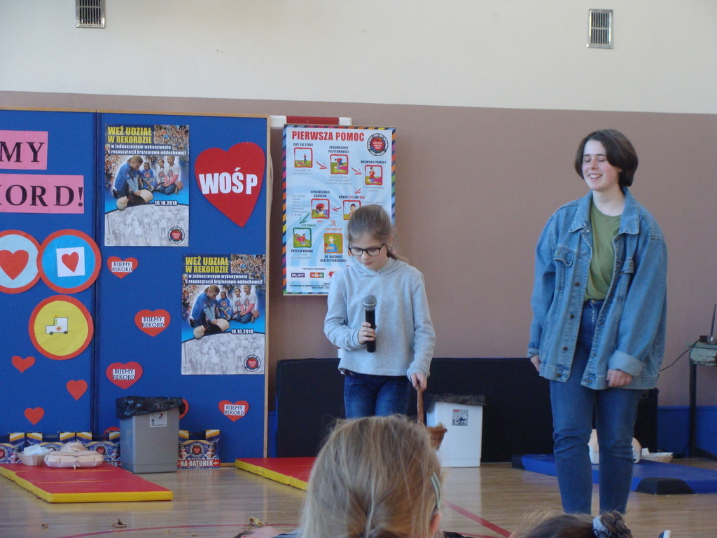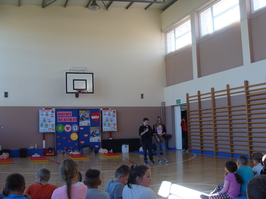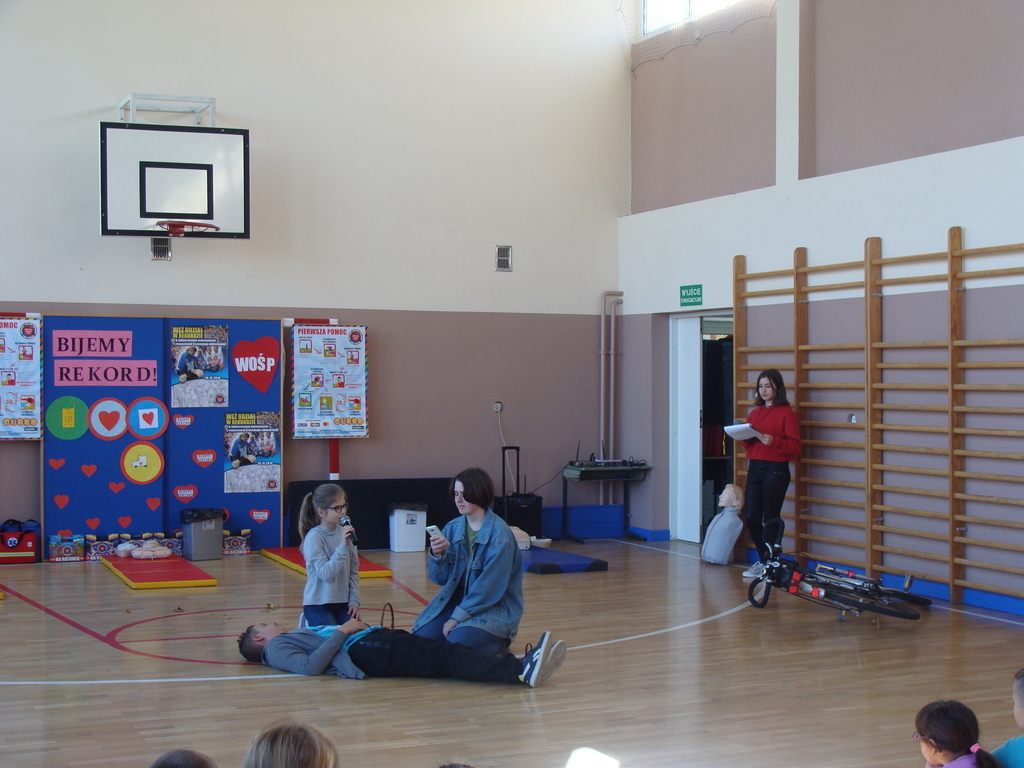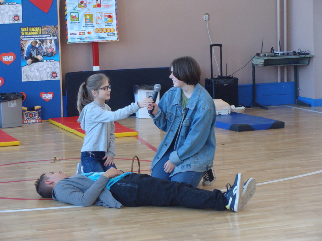 Przed przystąpieniem do akcji, wszyscy uczestnicy akcji, obejrzeli scenkę przygotowaną przez uczniów klasy ósmej, w której zaprezentowali jak krok po kroku udzielać pierwszej pomocy.