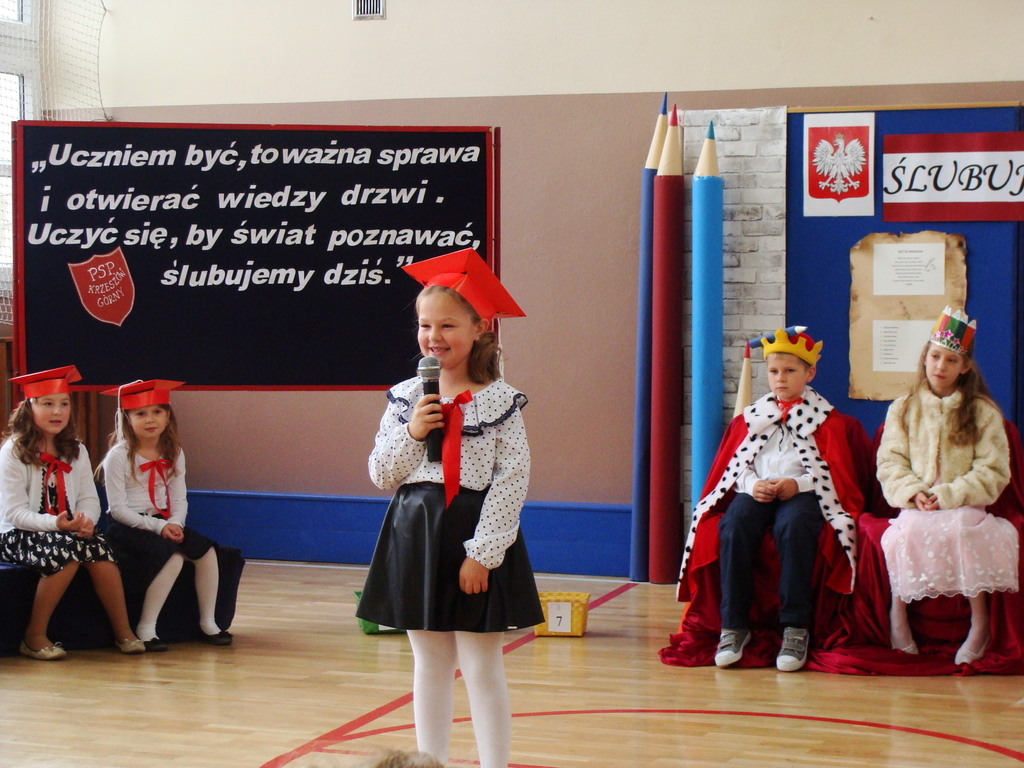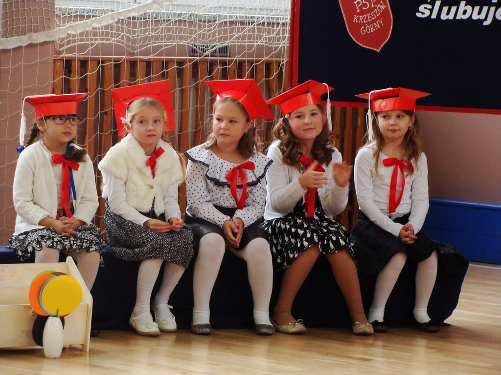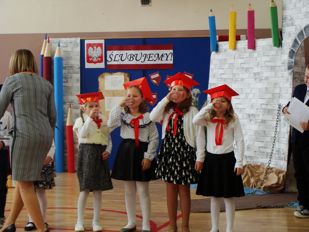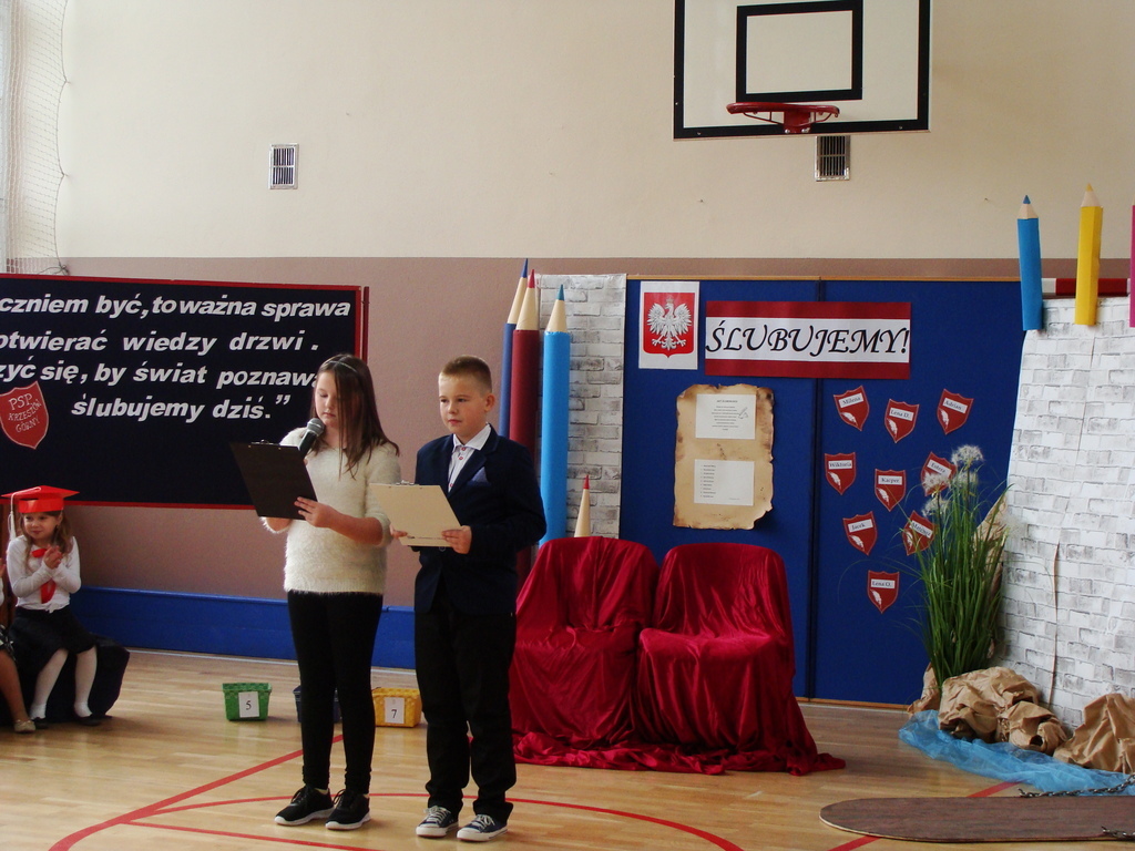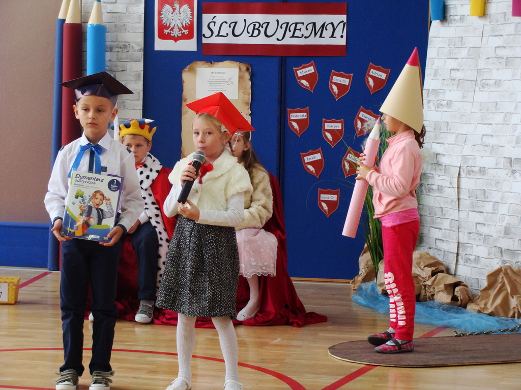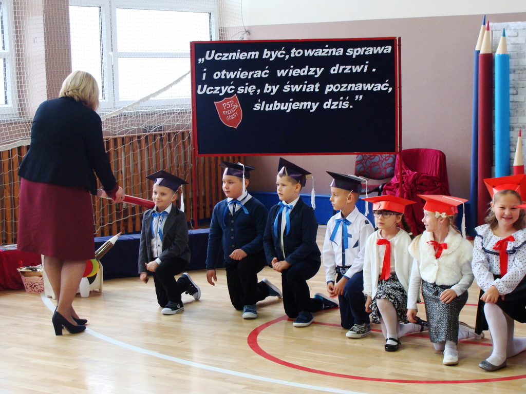 Na szczęście nasze „pierwszaki” wykazały się ogromną wiedzą i umiejętnościami, zadziwiając nie tylko króla i królową, ale również zebraną na Pasowaniu publiczność. Ponadto uczniowie wykazali się niezwykłym męstwem i bez wahania wypili przygotowany na tę okazję napój mądrości. To, co nastąpiło potem, okazało się więc tylko przyjemną formalnością. Pierwszoklasiści złożyli uroczyste ślubowanie, a pani dyrektor pasowała naszych bohaterów na uczniów Publicznej Szkoły Podstawowej w Krzeszowie Górnym. Rodziców również nie mogło tego dnia zabraknąć- dziękujemy im za ciepłe słowa oraz za pomoc w przygotowaniu upominków i poczęstunku.