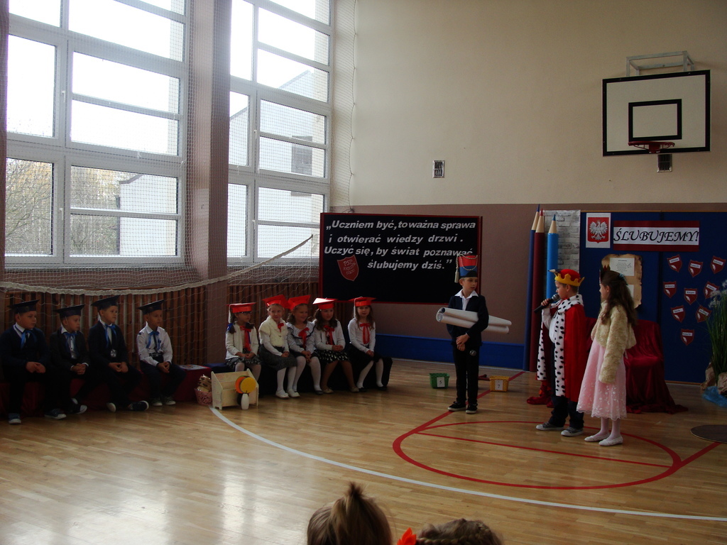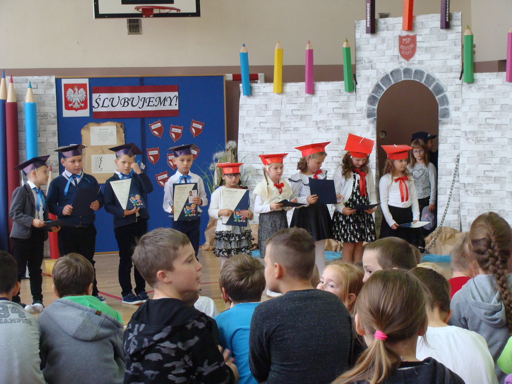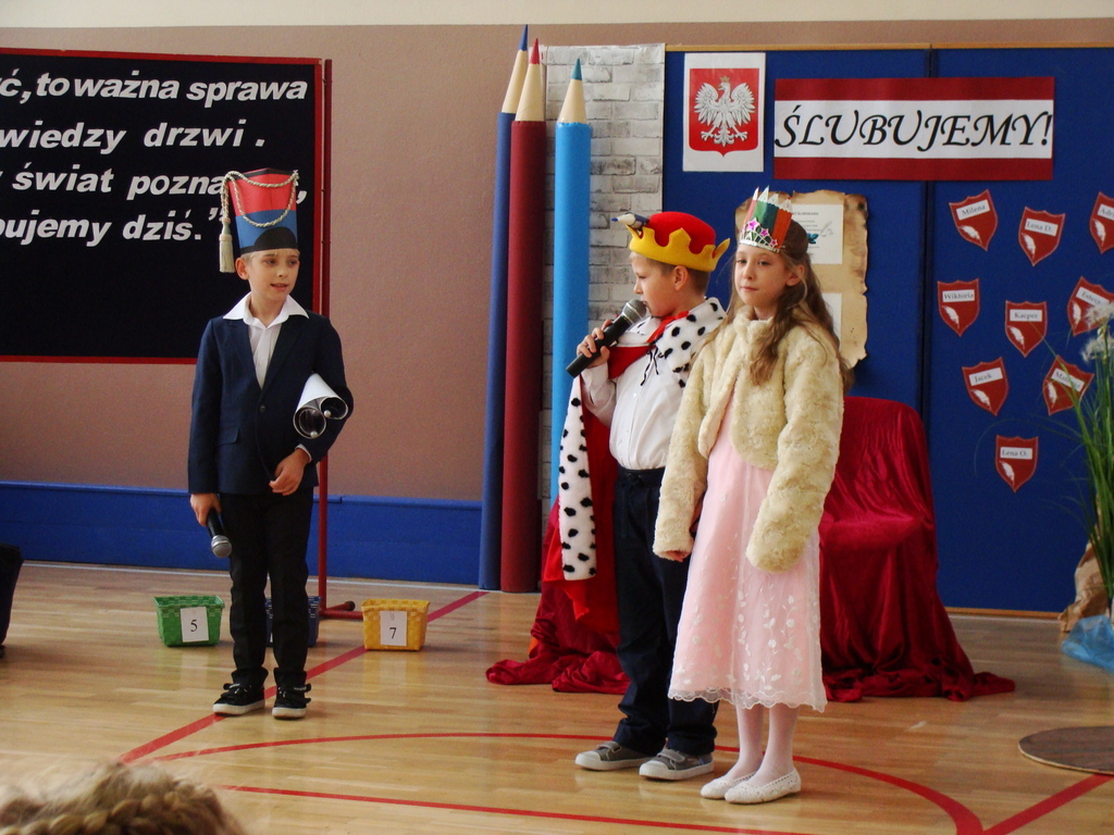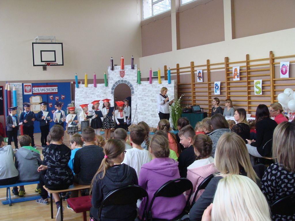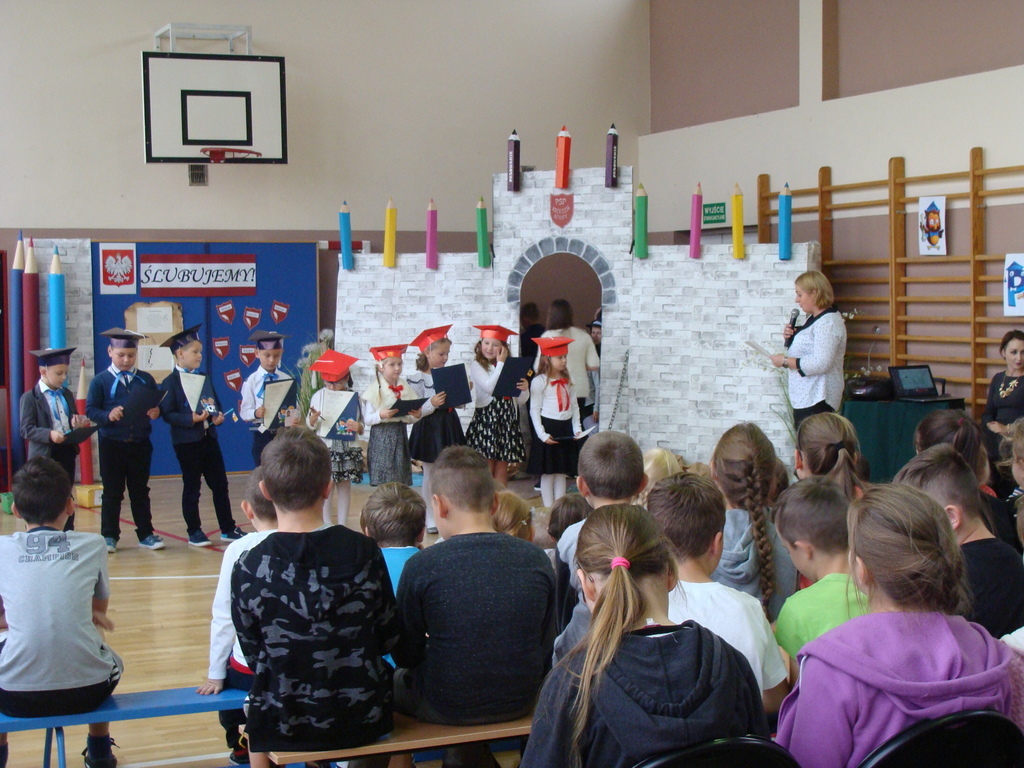 Na szczęście nasze „pierwszaki” wykazały się ogromną wiedzą i umiejętnościami, zadziwiając nie tylko króla i królową, ale również zebraną na Pasowaniu publiczność. Ponadto uczniowie wykazali się niezwykłym męstwem i bez wahania wypili przygotowany na tę okazję napój mądrości. To, co nastąpiło potem, okazało się więc tylko przyjemną formalnością. Pierwszoklasiści złożyli uroczyste ślubowanie, a pani dyrektor pasowała naszych bohaterów na uczniów Publicznej Szkoły Podstawowej w Krzeszowie Górnym. Rodziców również nie mogło tego dnia zabraknąć- dziękujemy im za ciepłe słowa oraz za pomoc w przygotowaniu upominków i poczęstunku.