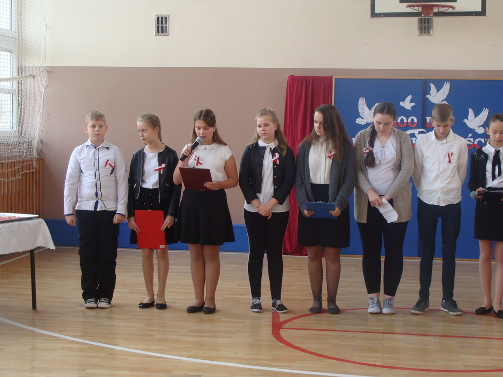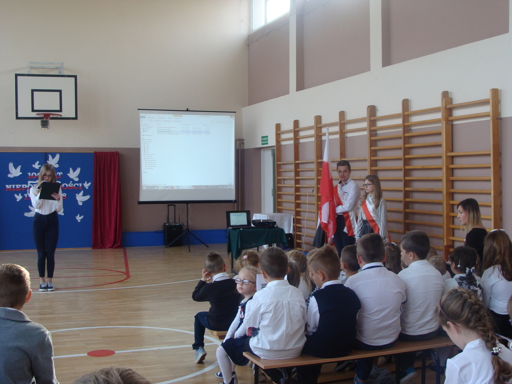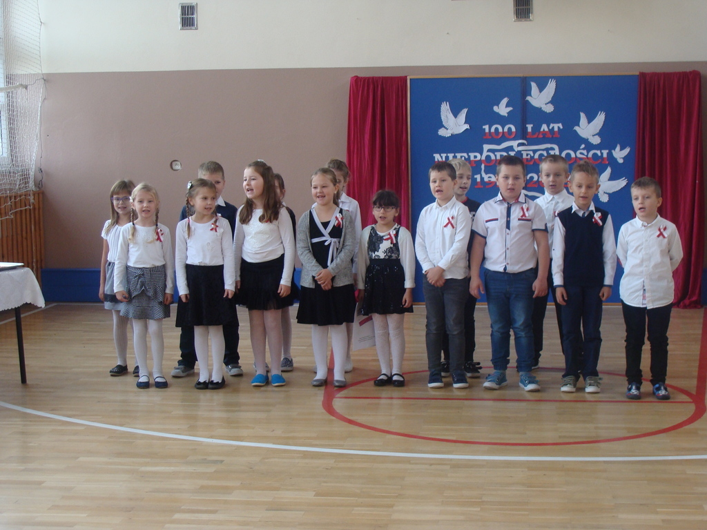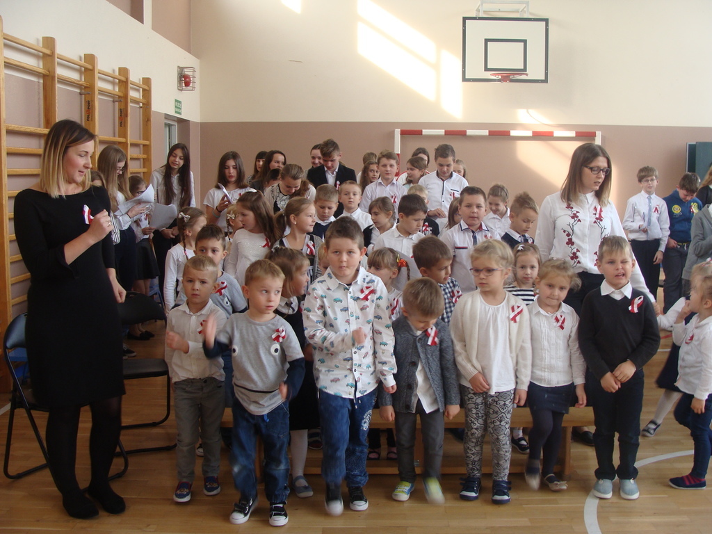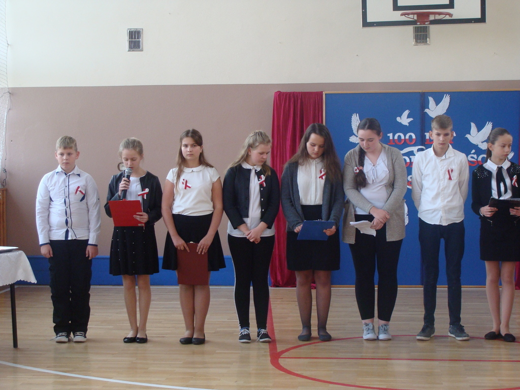 13 listopada odbyło się uroczyste świętowanie 100. rocznicy odzyskania niepodległości przez Polskę. Młodzi aktorzy z klasy siódmej przybliżyli wszystkim uczestnikom historię naszego kraju - czasów, gdy Polska straciła niepodległość i zniknęła na 123 lata z map świata. Przypomnieli zgromadzonym trudną i długą drogę Polaków do niepodległości oraz okoliczności jej wywalczenia. Wykonawcy recytowali wiersze, a uczniowie z klasy pierwszej, drugiej, trzeciej i ósmej uświetnili akademię piosenkami. Montaż słowno-muzyczny wzbogacony był o materiały filmowe.