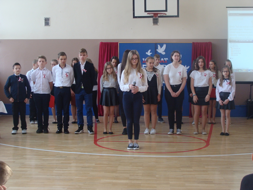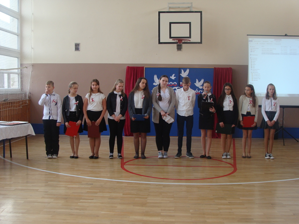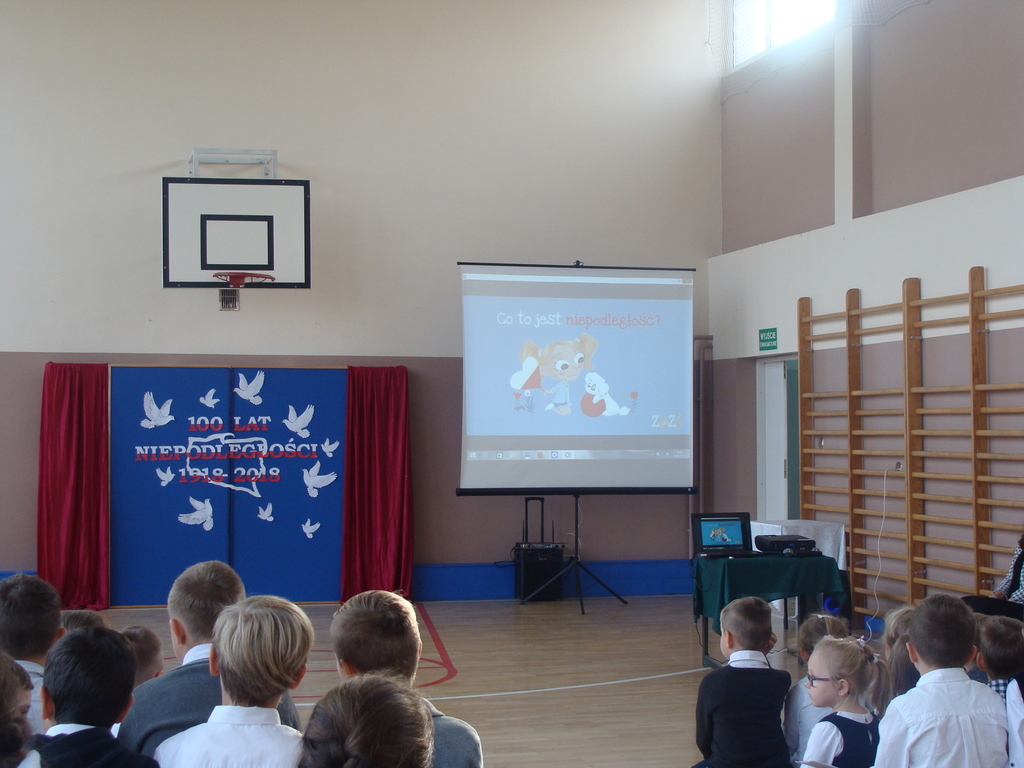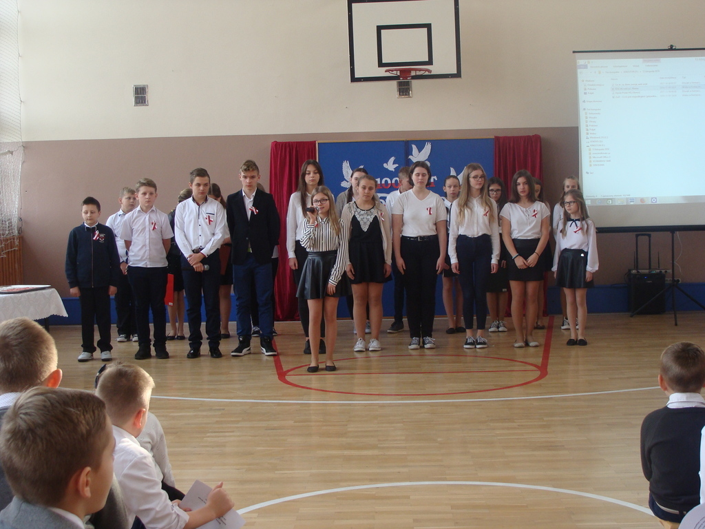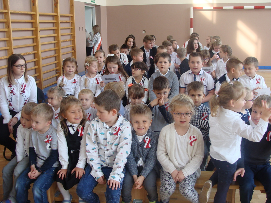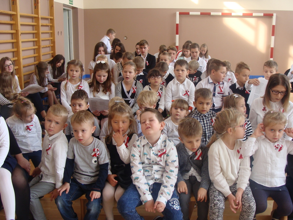 13 listopada odbyło się uroczyste świętowanie 100. rocznicy odzyskania niepodległości przez Polskę. Młodzi aktorzy z klasy siódmej przybliżyli wszystkim uczestnikom historię naszego kraju - czasów, gdy Polska straciła niepodległość i zniknęła na 123 lata z map świata. Przypomnieli zgromadzonym trudną i długą drogę Polaków do niepodległości oraz okoliczności jej wywalczenia. Wykonawcy recytowali wiersze, a uczniowie z klasy pierwszej, drugiej, trzeciej i ósmej uświetnili akademię piosenkami. Montaż słowno-muzyczny wzbogacony był o materiały filmowe.