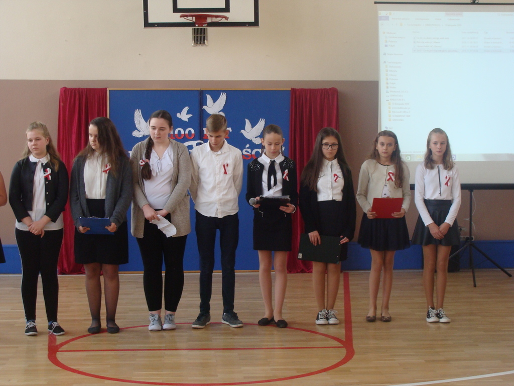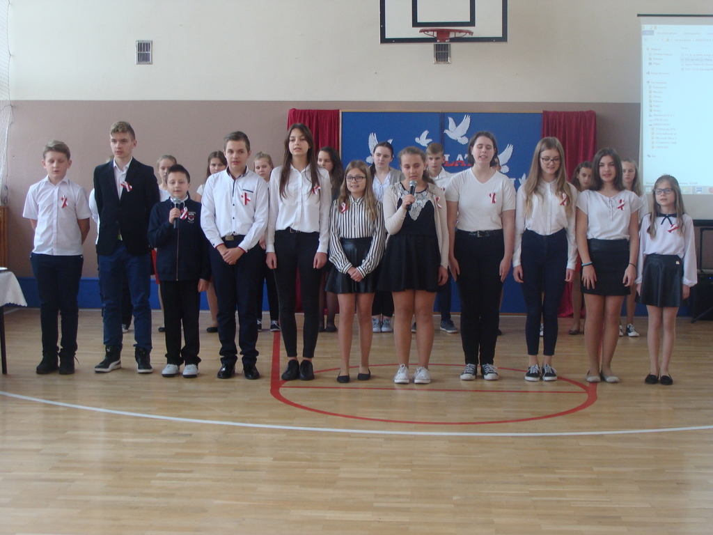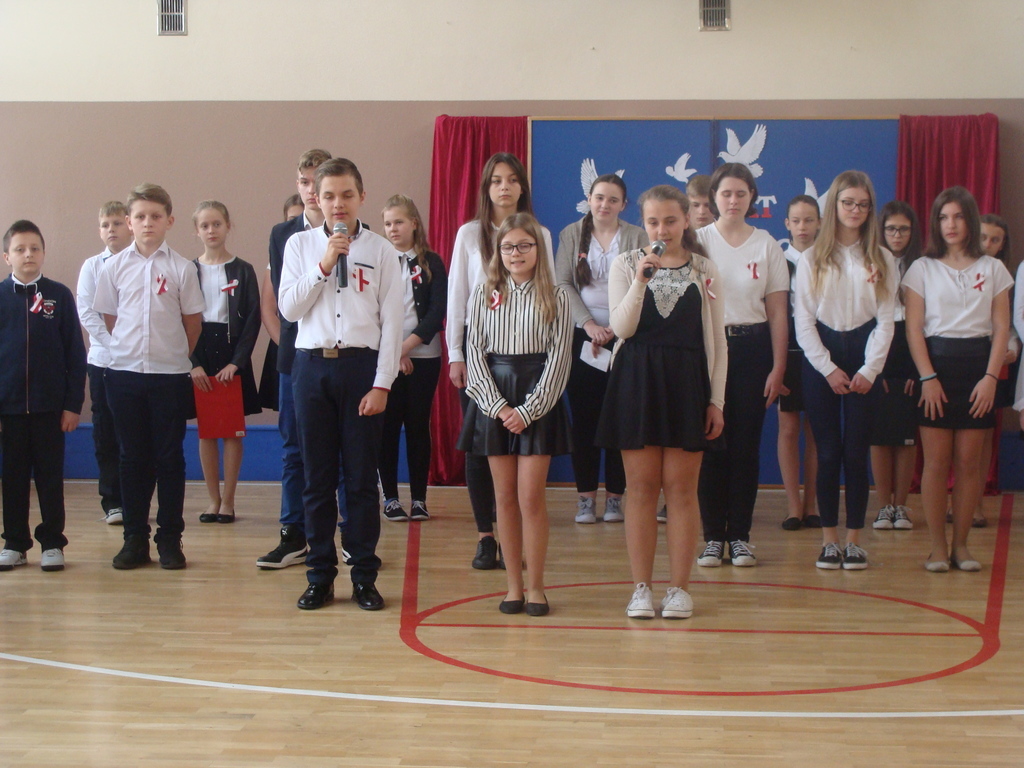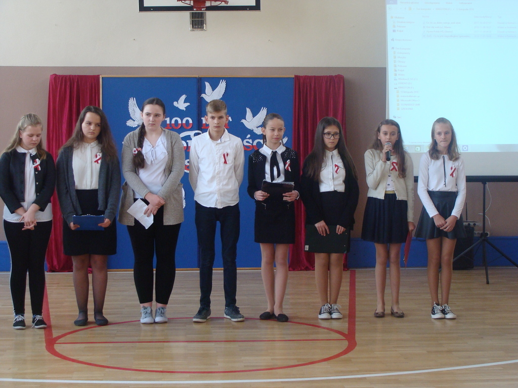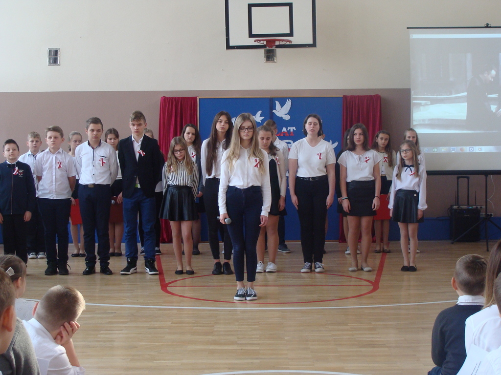 13 listopada odbyło się uroczyste świętowanie 100. rocznicy odzyskania niepodległości przez Polskę. Młodzi aktorzy z klasy siódmej przybliżyli wszystkim uczestnikom historię naszego kraju - czasów, gdy Polska straciła niepodległość i zniknęła na 123 lata z map świata. Przypomnieli zgromadzonym trudną i długą drogę Polaków do niepodległości oraz okoliczności jej wywalczenia. Wykonawcy recytowali wiersze, a uczniowie z klasy pierwszej, drugiej, trzeciej i ósmej uświetnili akademię piosenkami. Montaż słowno-muzyczny wzbogacony był o materiały filmowe.
