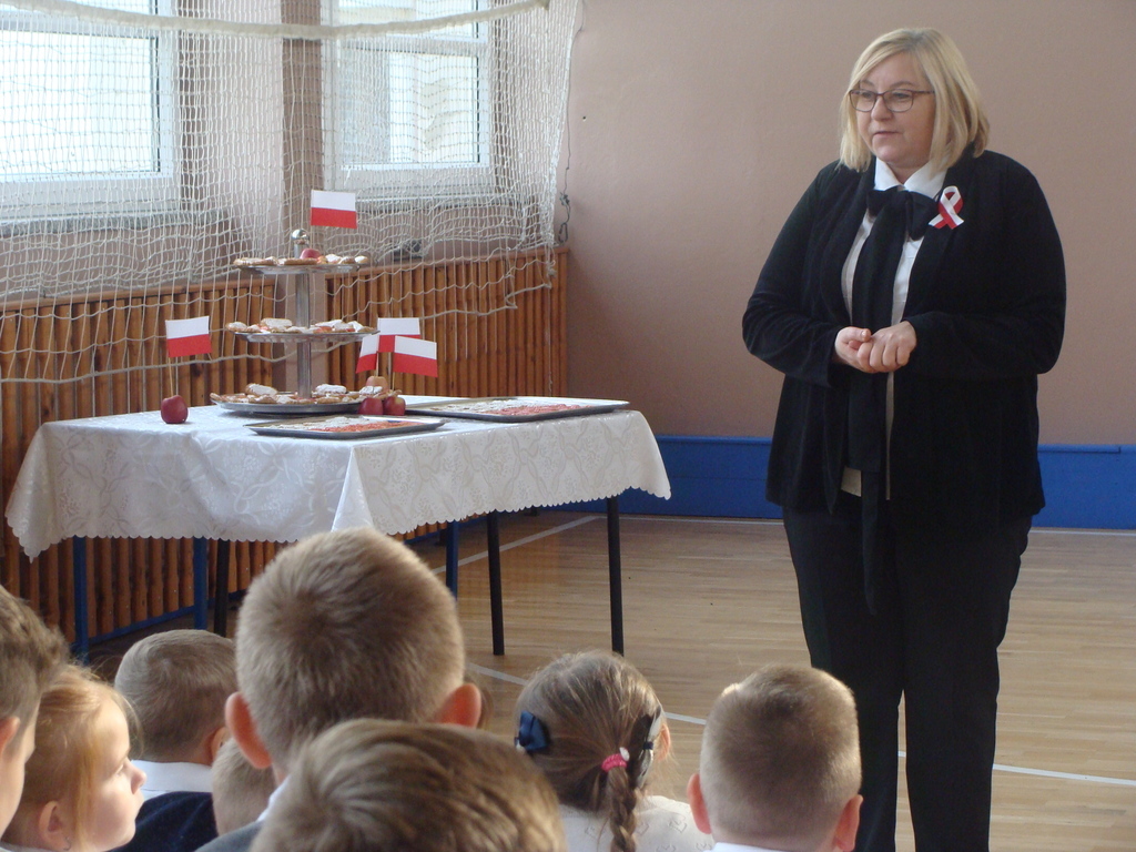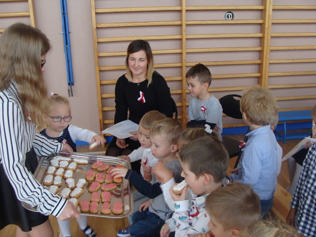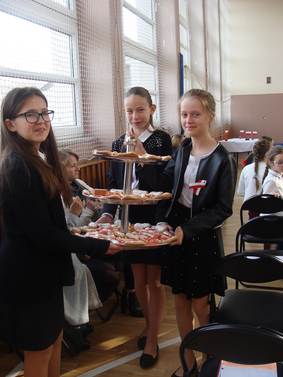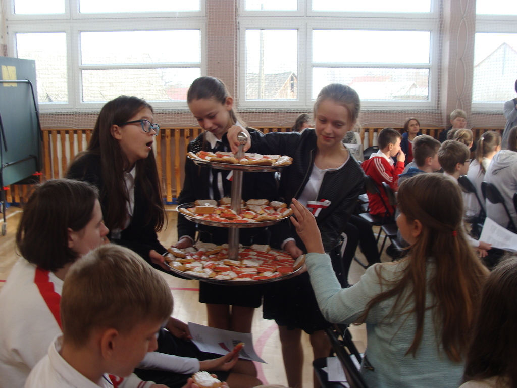 Wszyscy poczęstowani zostali pysznymi ciastkami z motywami biało-czerwonymi, wykonanymi przez uczniów na świetlicy szkolnej.