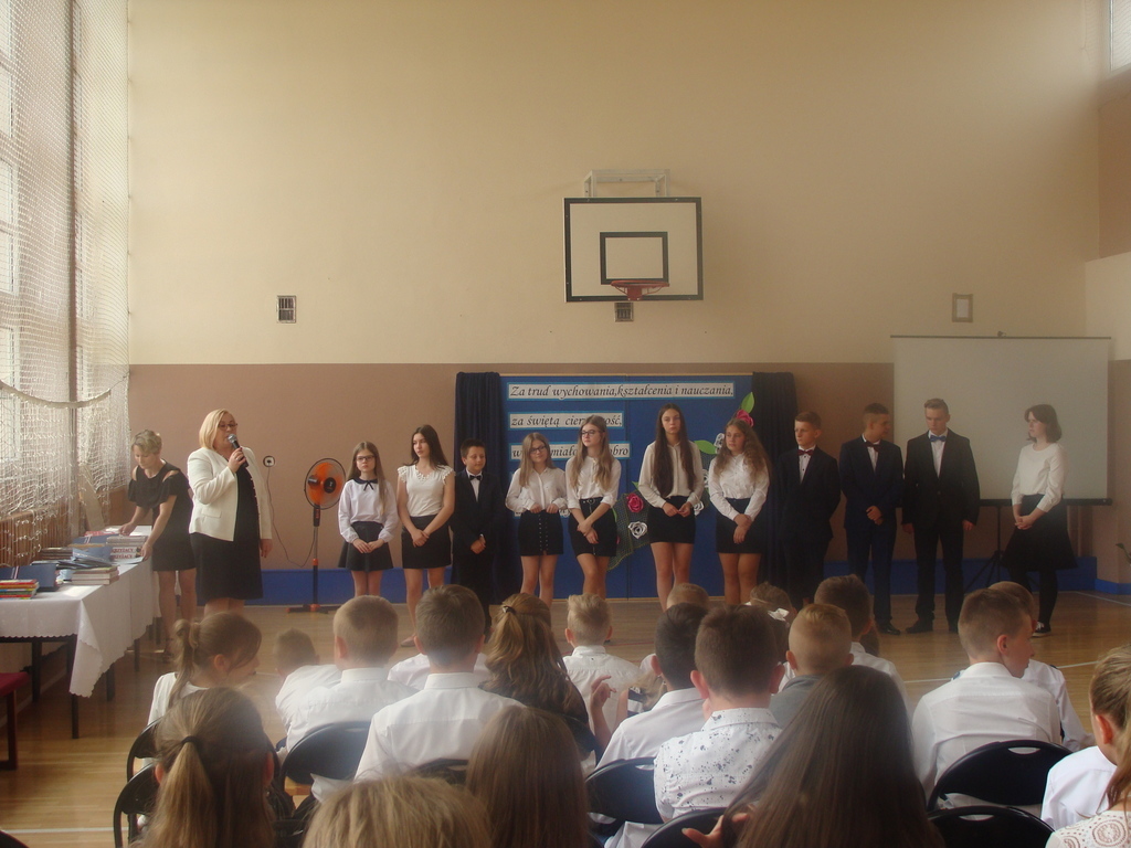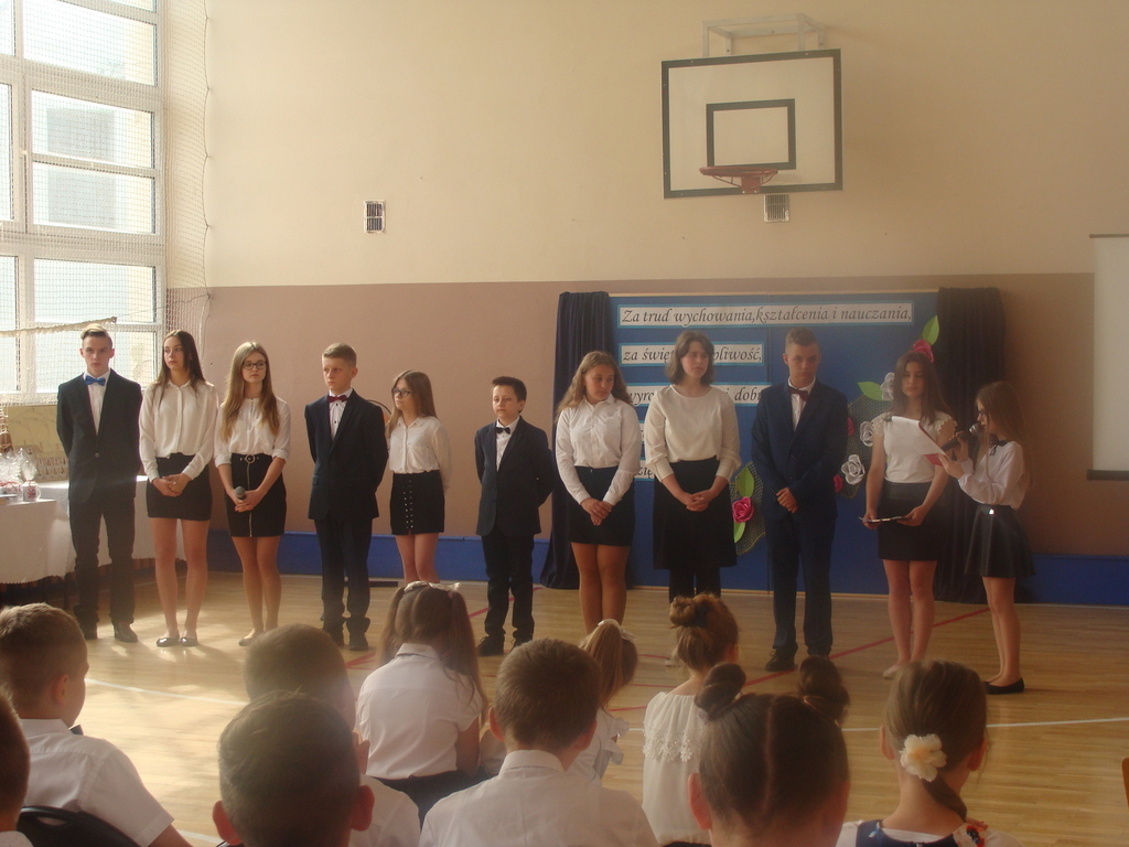 Był to również bardzo ważny dzień dla uczniów klasy VIII, którzy pożegnali się ze szkołą podstawową. Zatańczyli pięknego poloneza. Absolwenci podziękowali pani dyrektor, wychowawcy, nauczycielom, pracownikom i rodzicom za kilka lat nauki w szkole.