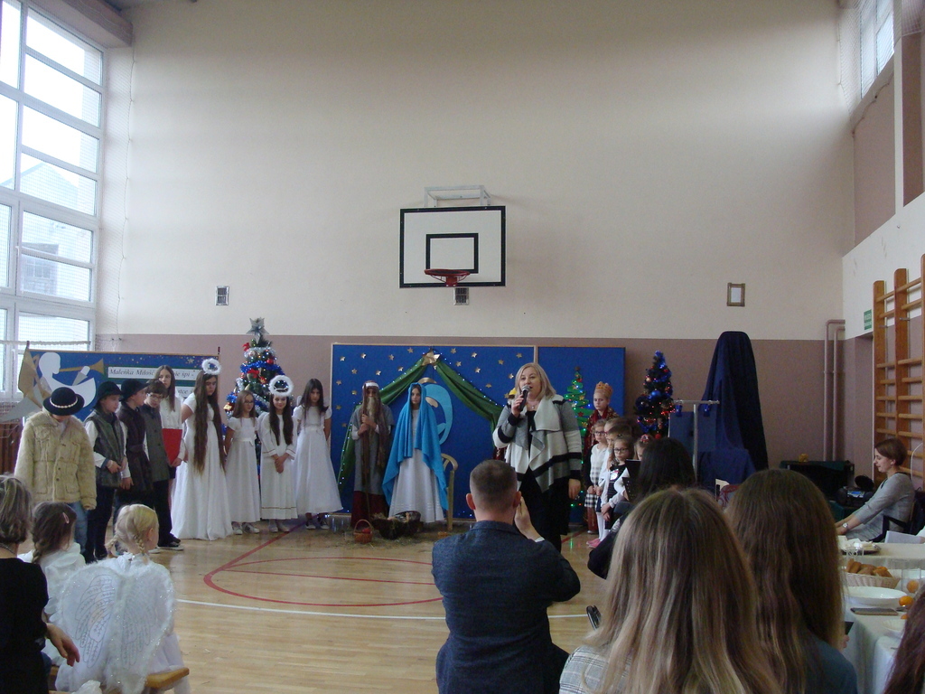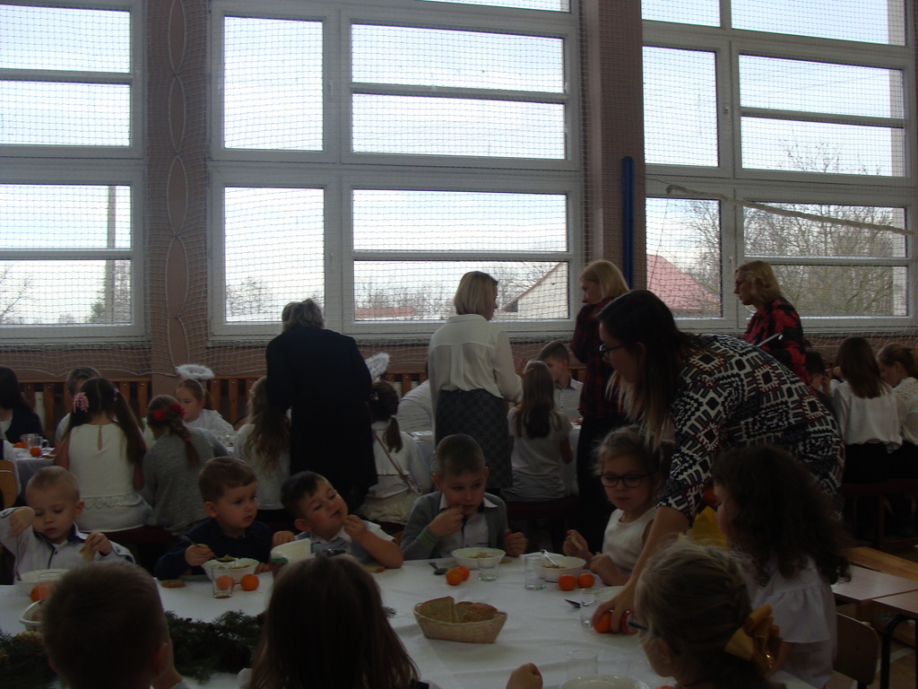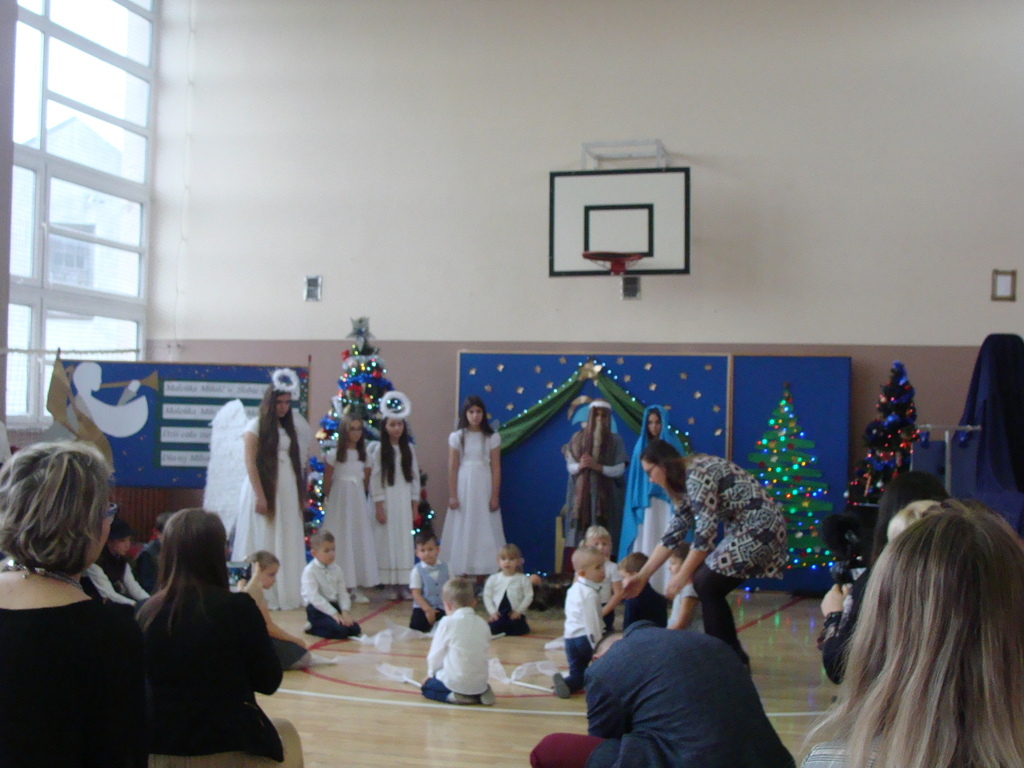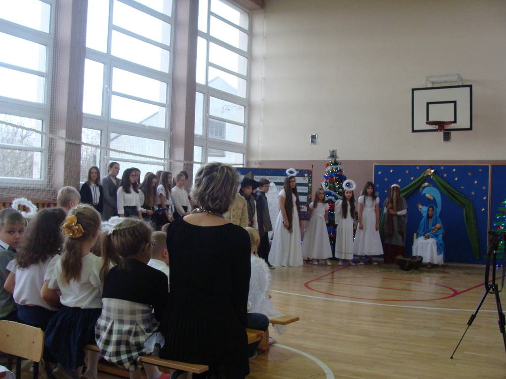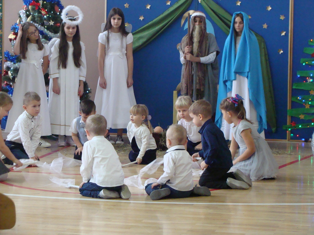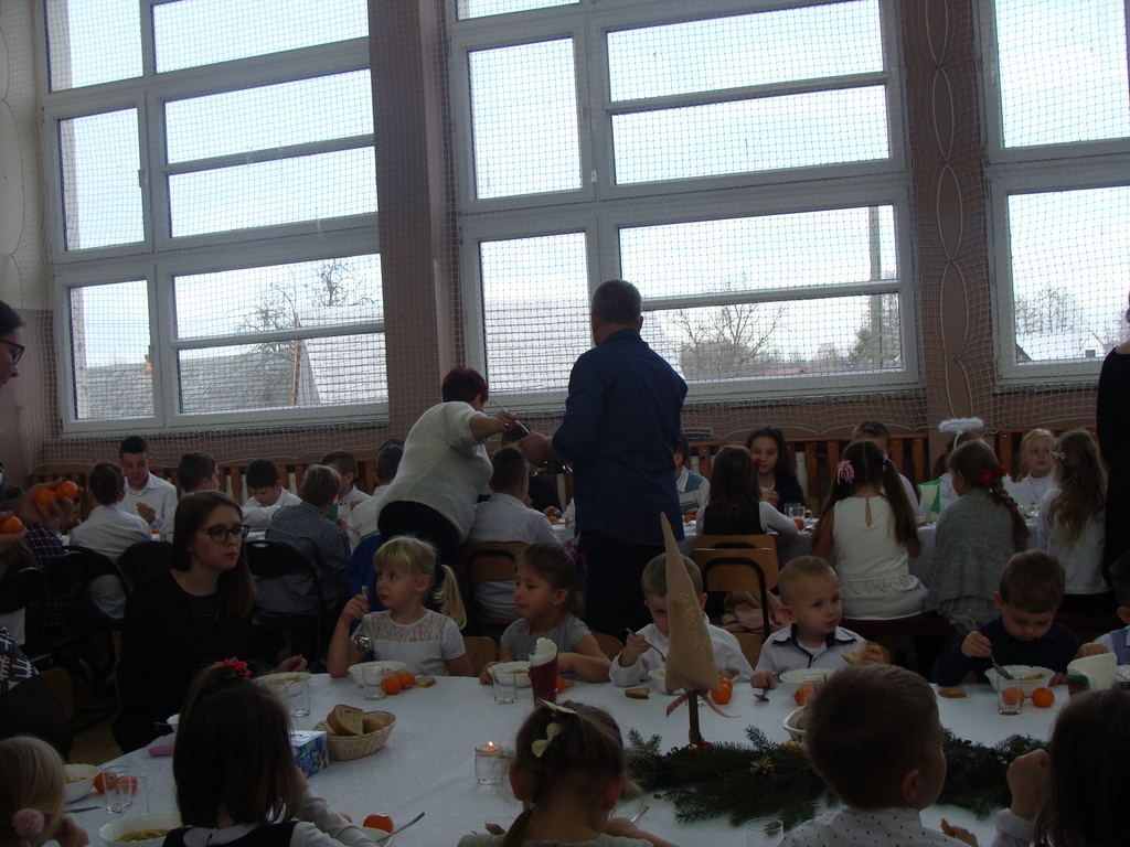 Oprawą uroczystości były występy dzieci z różnych klas oraz wspólne kolędowanie zakończone dzieleniem się opłatkiem i wigilią.