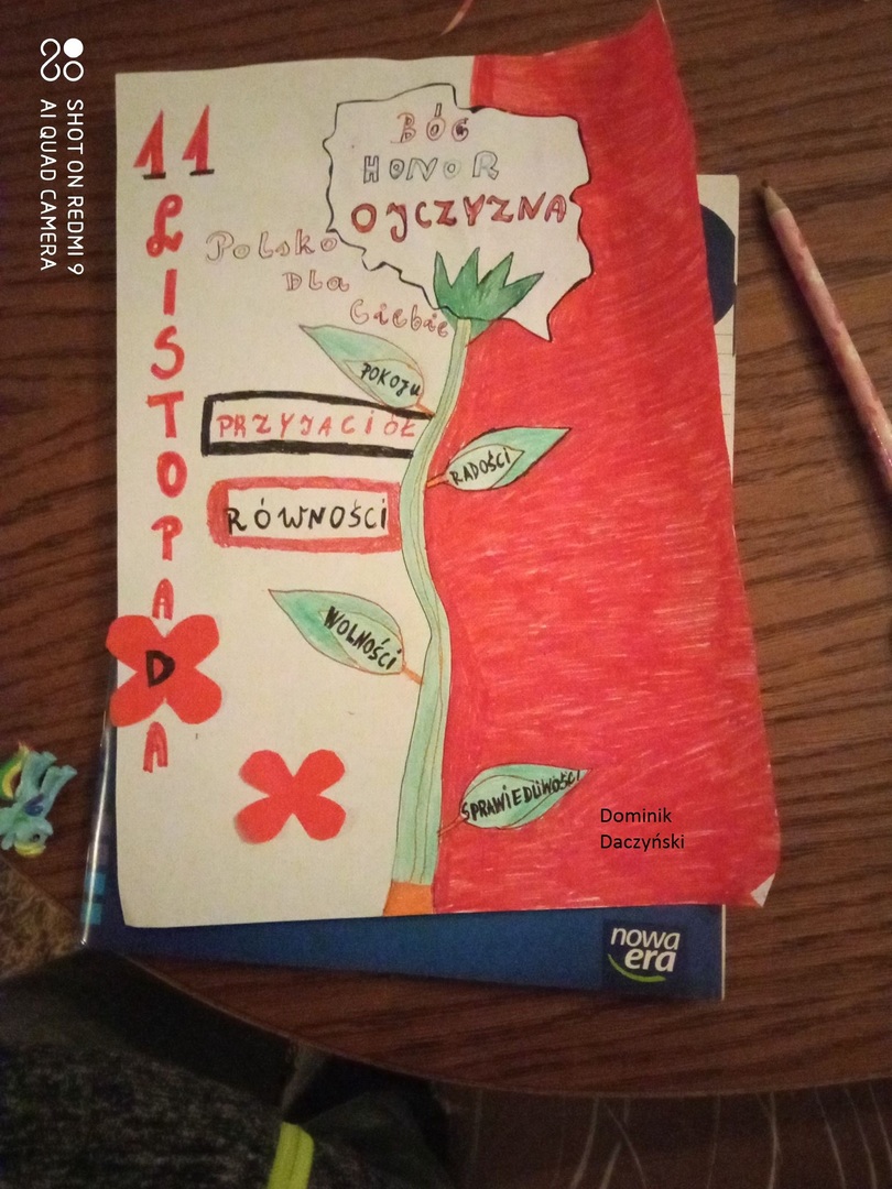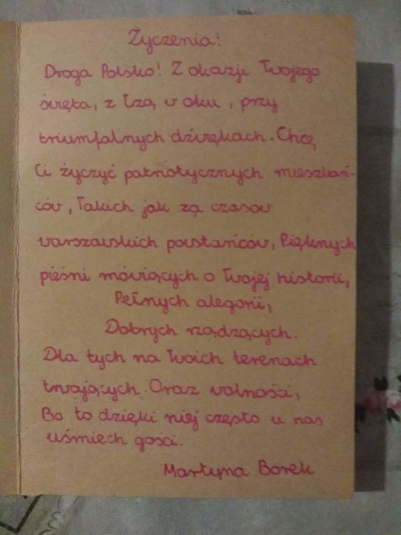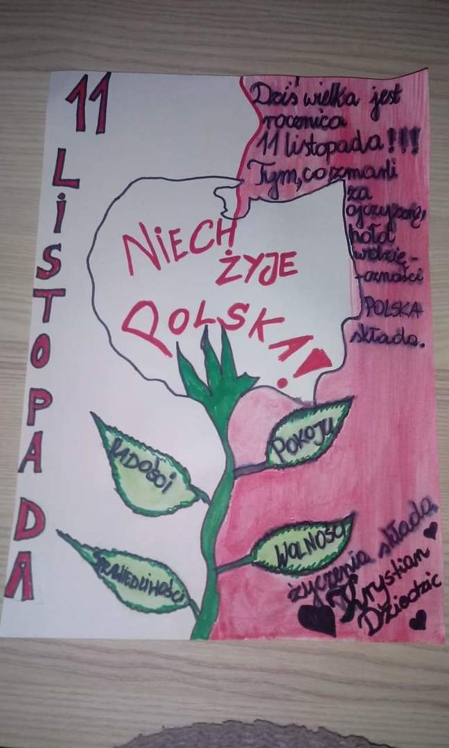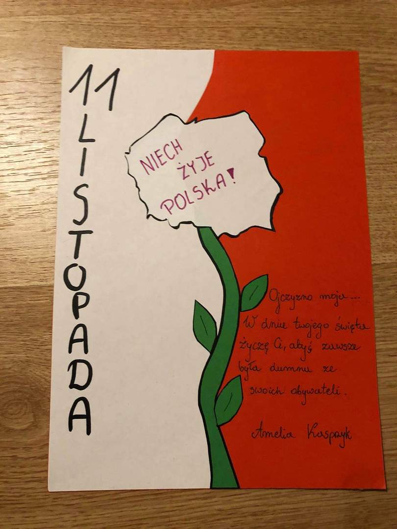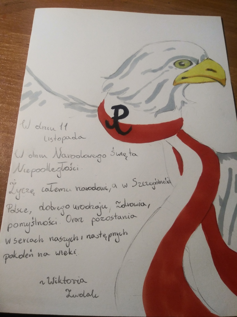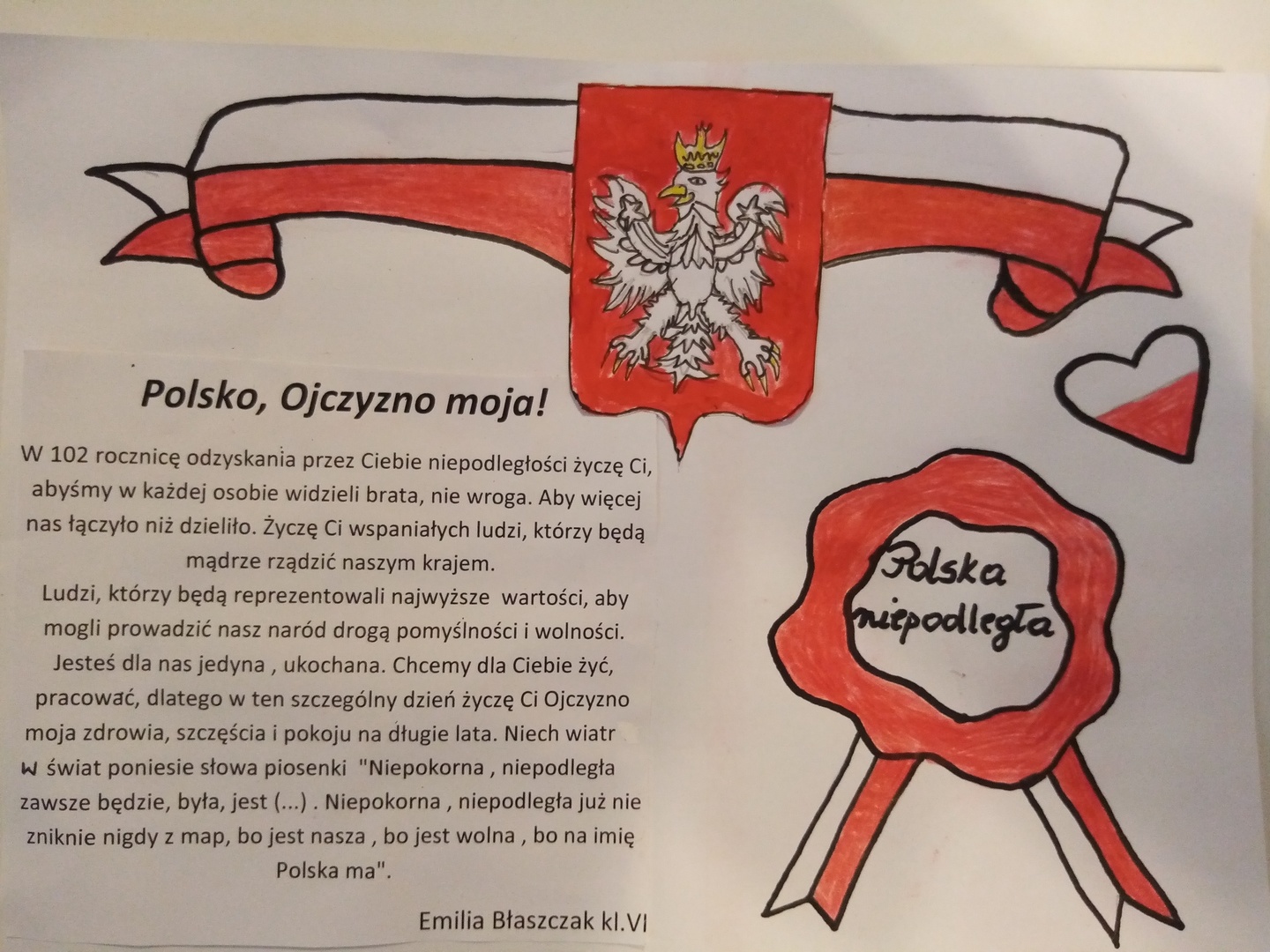 W tym roku nie mogliśmy wspólnie w szkole uroczyście upamiętnić 102. rocznicy odzyskania niepodległości przez Polskę. Obchody Święta Niepodległości zyskały w tym roku plastyczną oprawę. Chętni uczniowie wyrazili swój patriotyzm poprzez wykonanie pięknych kartek z życzeniami dla Ojczyzny. Każde życzenia to ogromny ładunek emocji i uczuć do Polski.