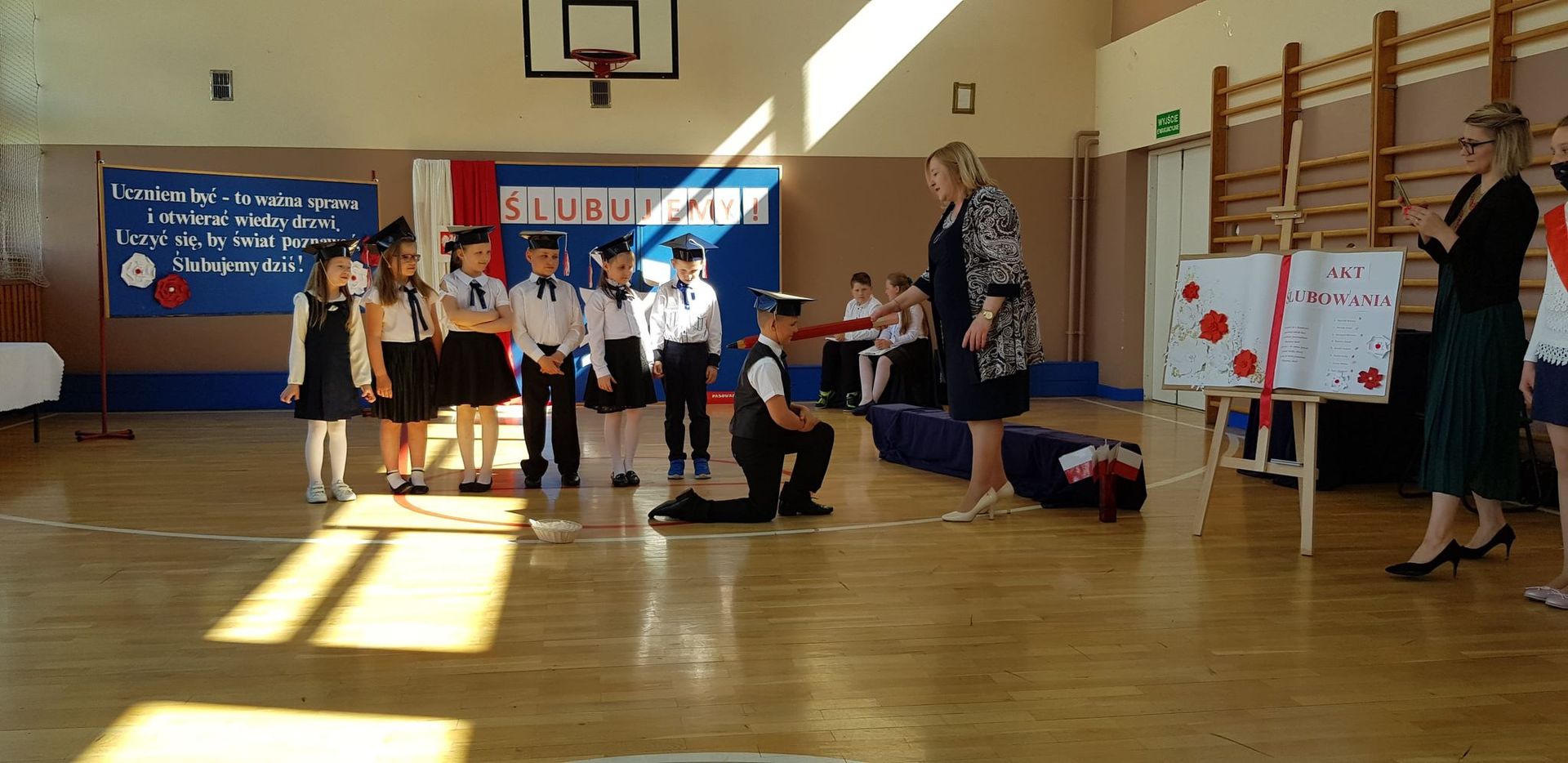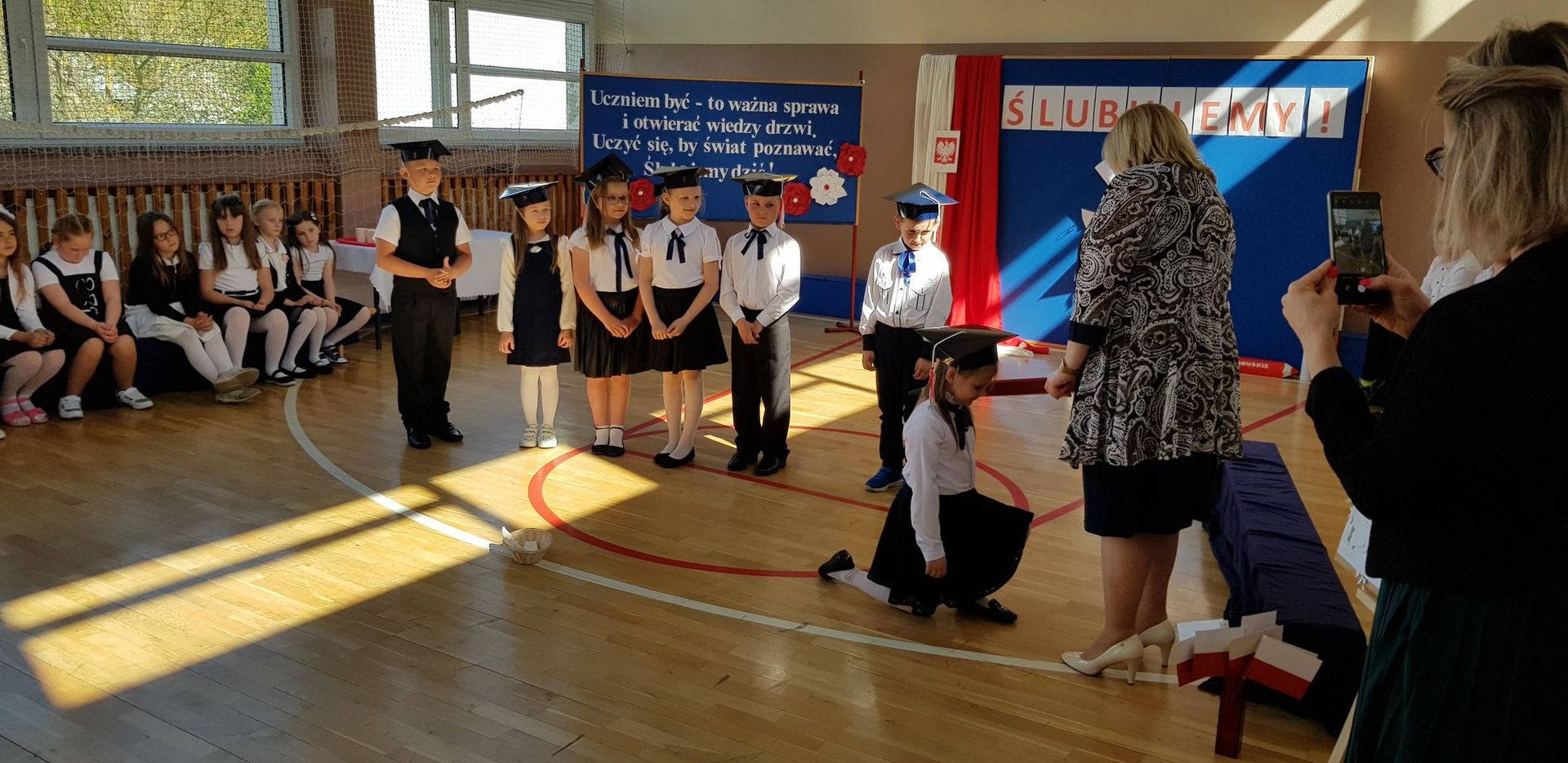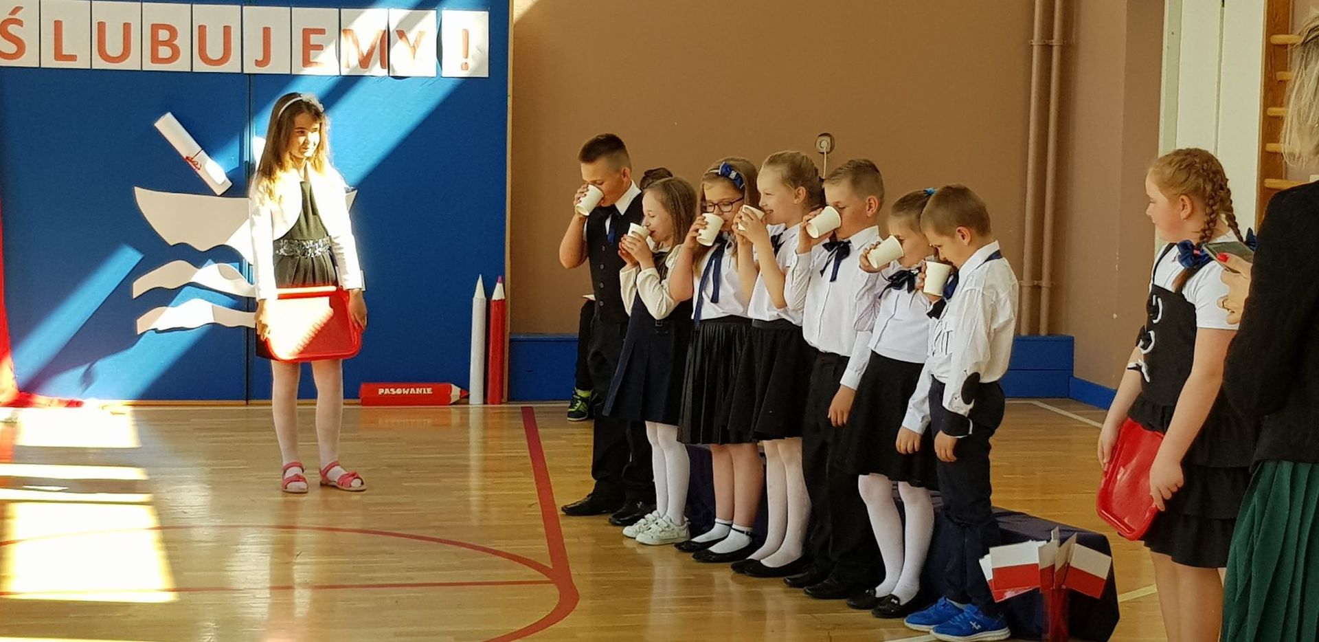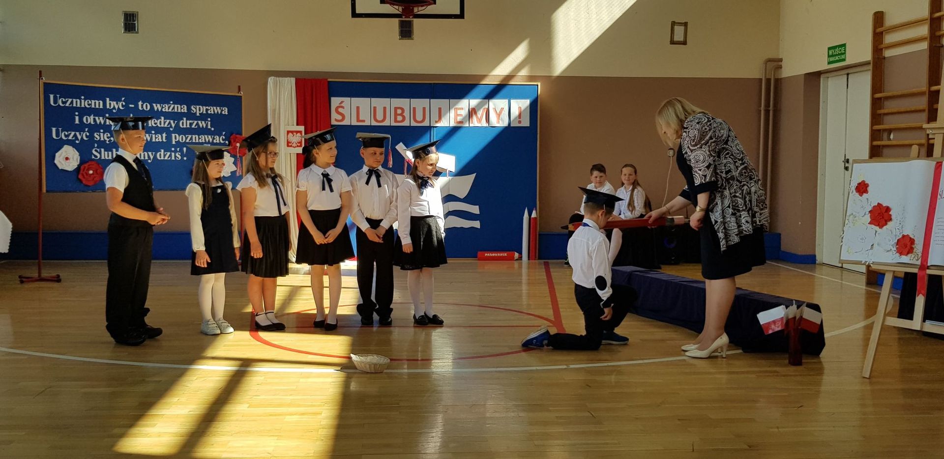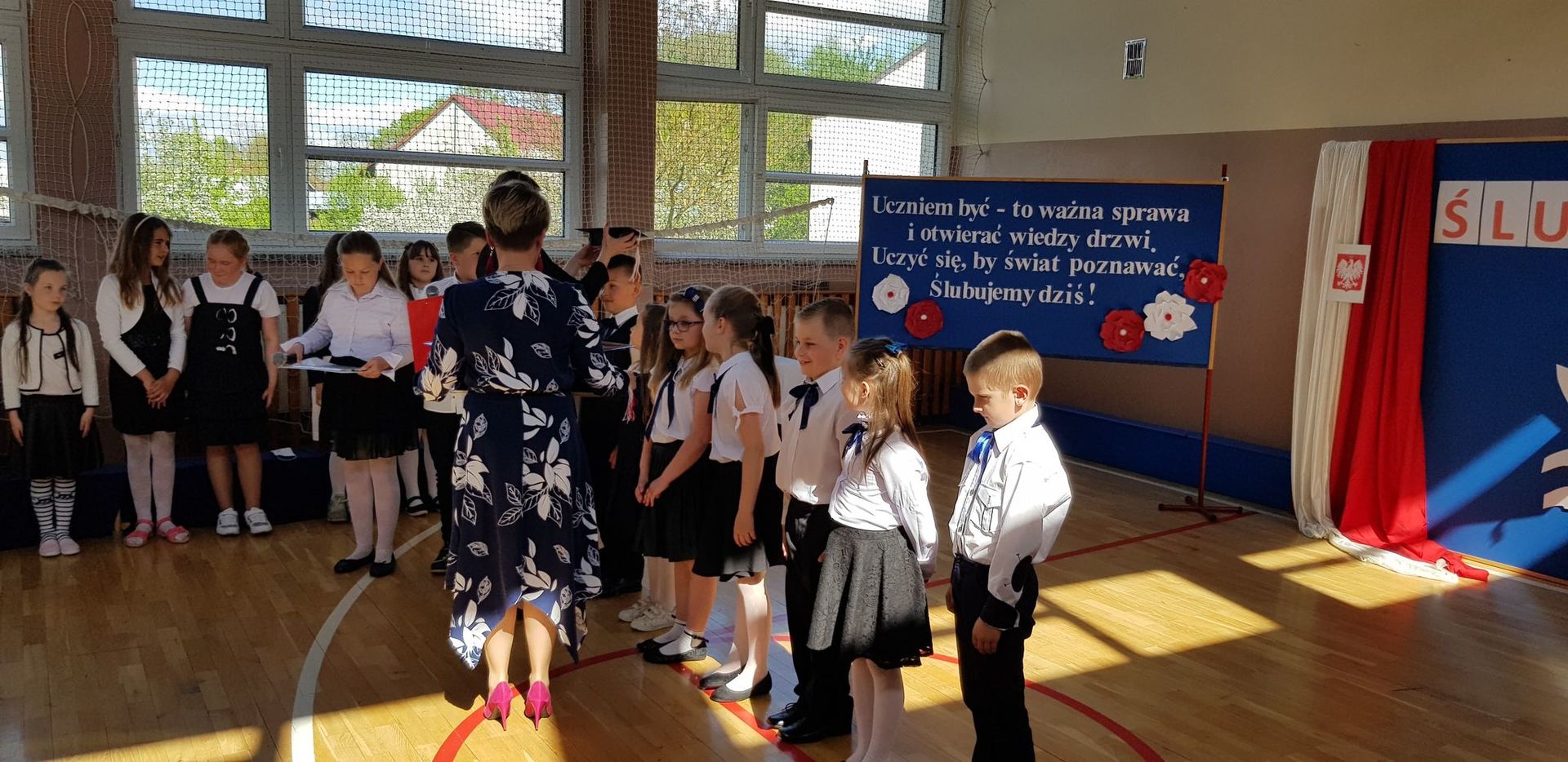 Jak mówi słynne powiedzenie: „Co ma wisieć, nie utonie”, tak też i przyszedł odpowiedni czas, aby uczniowie klasy pierwszej zostali pasowani na ucznia. Otóż, 17 maja 2021r. pierwszoklasiści przystąpili do uroczystego ślubowania. Zanim złożyli przyrzeczenia, w których mówili o dołożeniu wszelkich starań, aby godnie reprezentować swoją klasę i szkołę, pokazali swoją wiedzę i umiejętności. W sprawdzeniu ich wiedzy pomagali drugoklasiści, którzy dokładnie wiedzieli, co przeegzaminować. Następnie pani dyrektor Edyta Igras dokonała pasowania każdego pierwszoklasisty na prawdziwego ucznia.