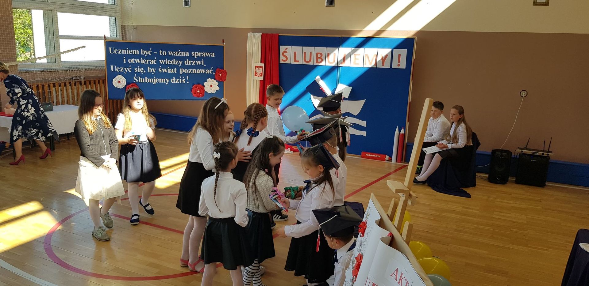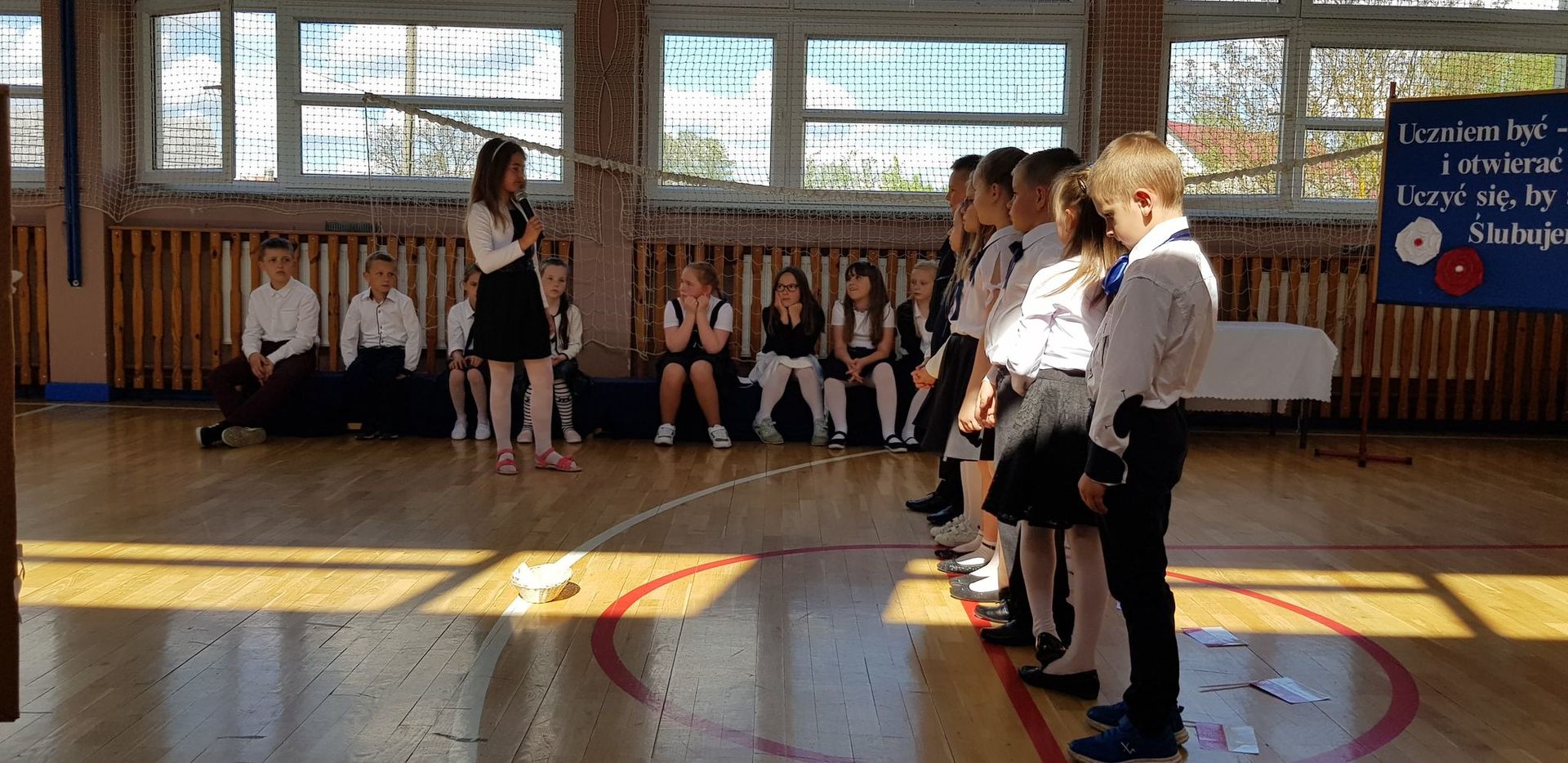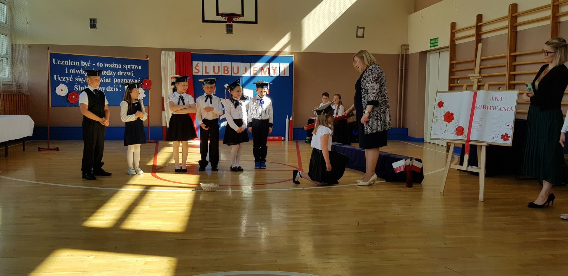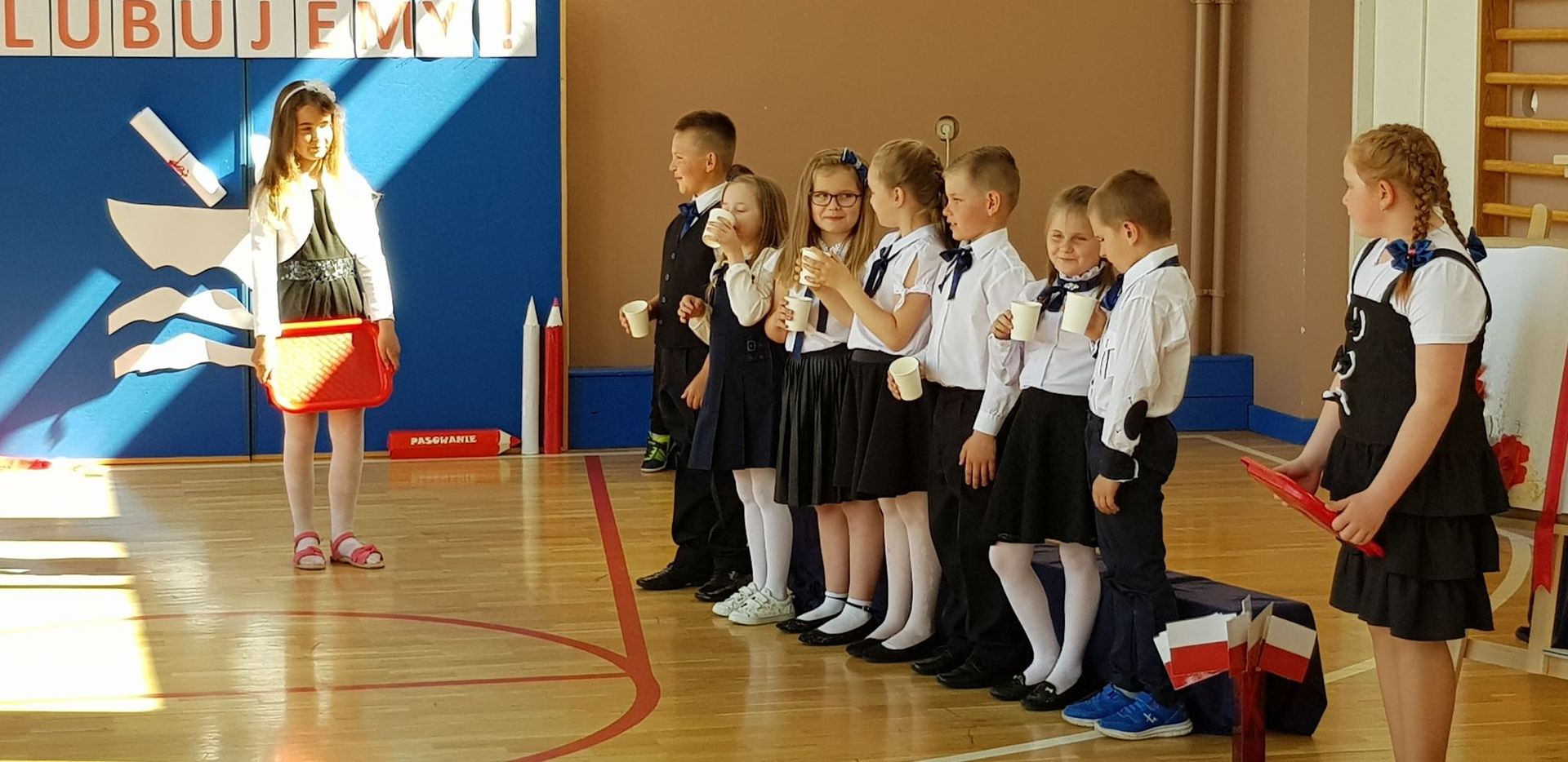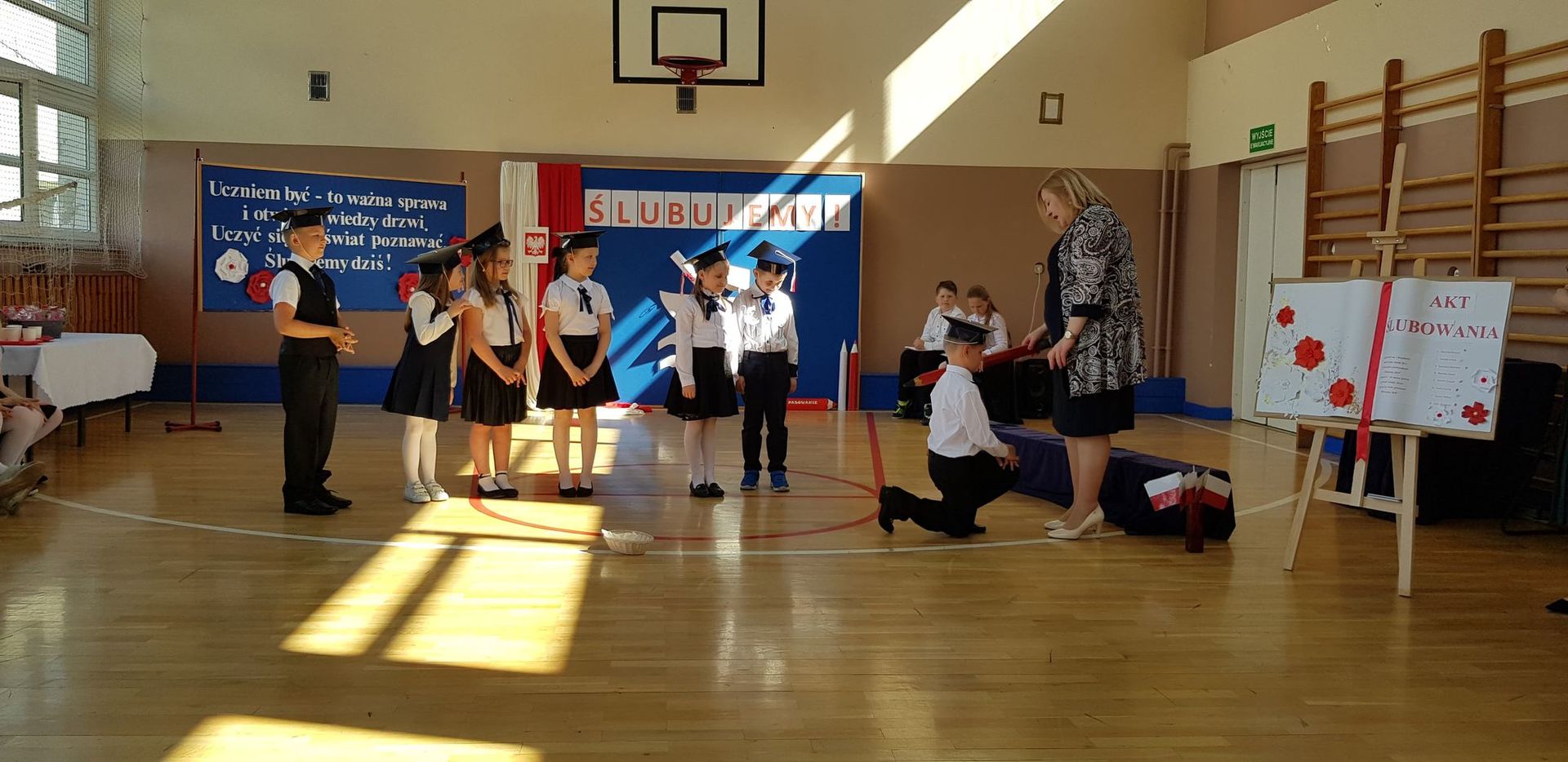 Jak mówi słynne powiedzenie: „Co ma wisieć, nie utonie”, tak też i przyszedł odpowiedni czas, aby uczniowie klasy pierwszej zostali pasowani na ucznia. Otóż, 17 maja 2021r. pierwszoklasiści przystąpili do uroczystego ślubowania. Zanim złożyli przyrzeczenia, w których mówili o dołożeniu wszelkich starań, aby godnie reprezentować swoją klasę i szkołę, pokazali swoją wiedzę i umiejętności. W sprawdzeniu ich wiedzy pomagali drugoklasiści, którzy dokładnie wiedzieli, co przeegzaminować. Następnie pani dyrektor Edyta Igras dokonała pasowania każdego pierwszoklasisty na prawdziwego ucznia.