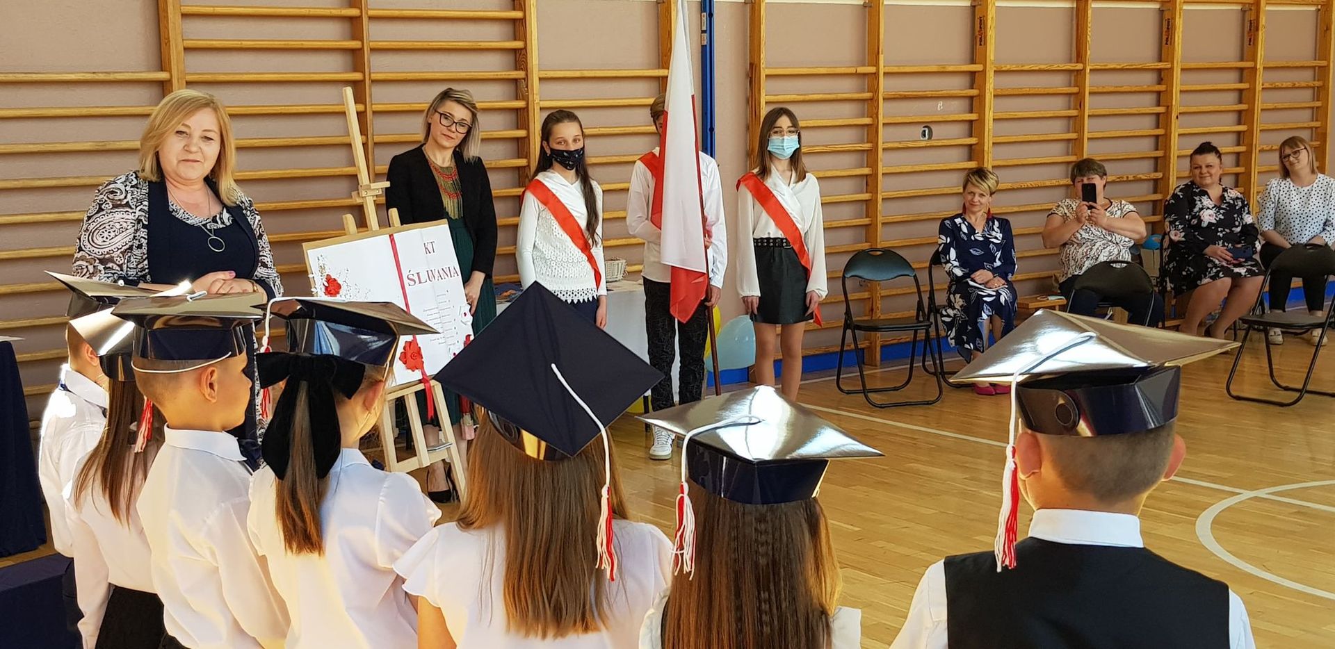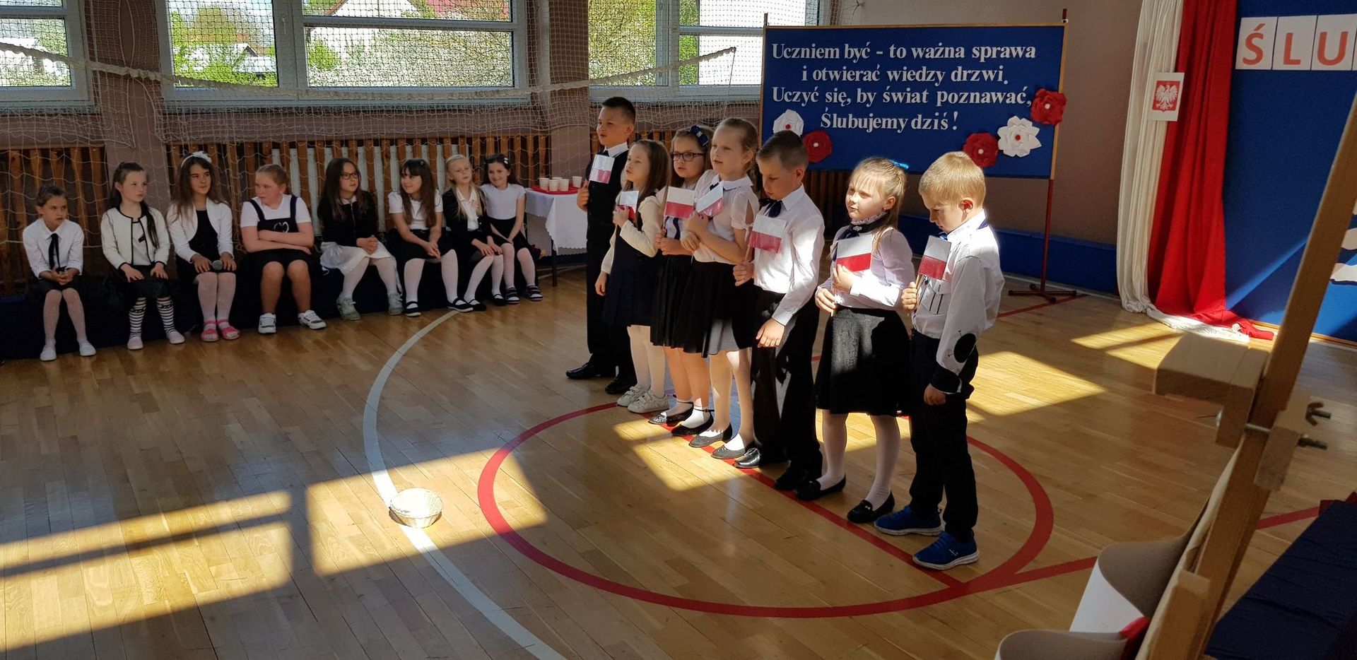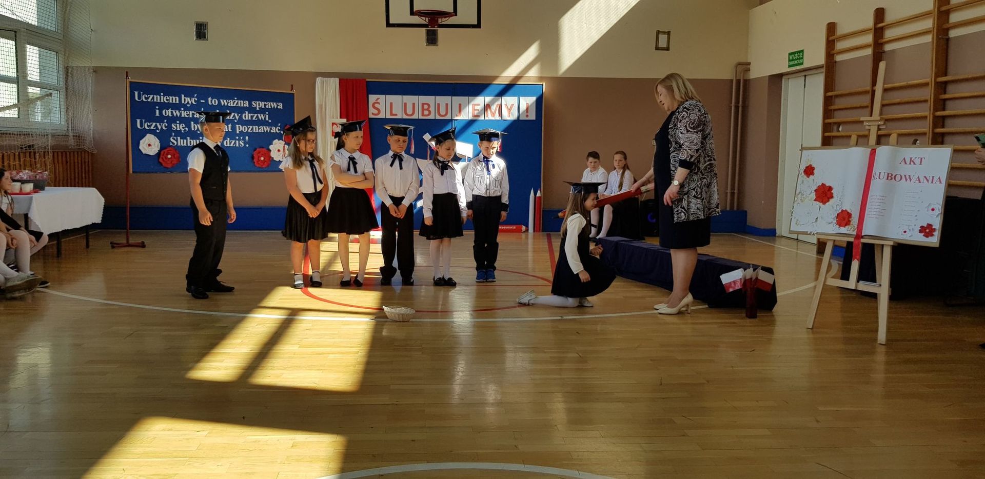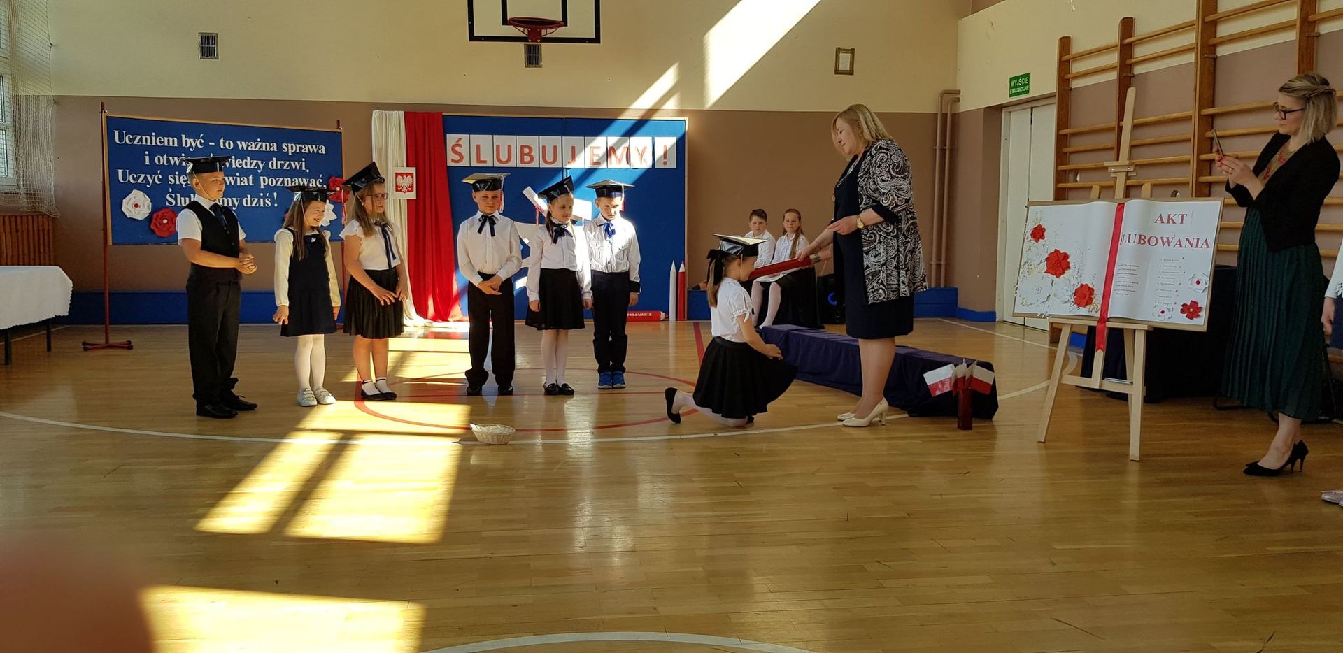 Jak mówi słynne powiedzenie: „Co ma wisieć, nie utonie”, tak też i przyszedł odpowiedni czas, aby uczniowie klasy pierwszej zostali pasowani na ucznia. Otóż, 17 maja 2021r. pierwszoklasiści przystąpili do uroczystego ślubowania. Zanim złożyli przyrzeczenia, w których mówili o dołożeniu wszelkich starań, aby godnie reprezentować swoją klasę i szkołę, pokazali swoją wiedzę i umiejętności. W sprawdzeniu ich wiedzy pomagali drugoklasiści, którzy dokładnie wiedzieli, co przeegzaminować. Następnie pani dyrektor Edyta Igras dokonała pasowania każdego pierwszoklasisty na prawdziwego ucznia.