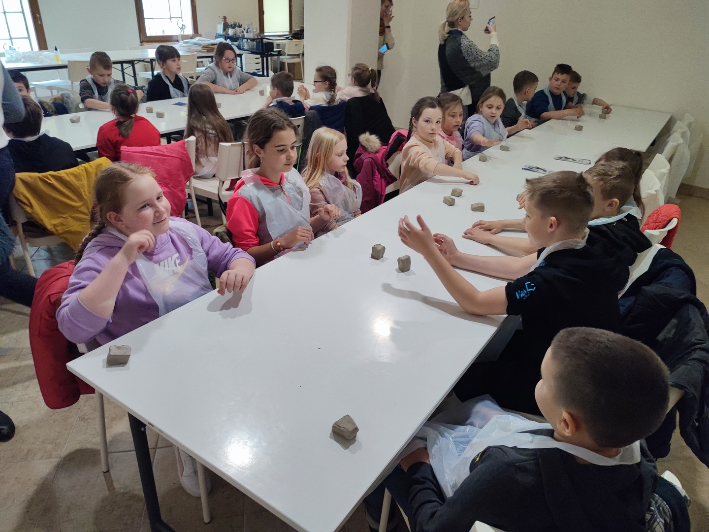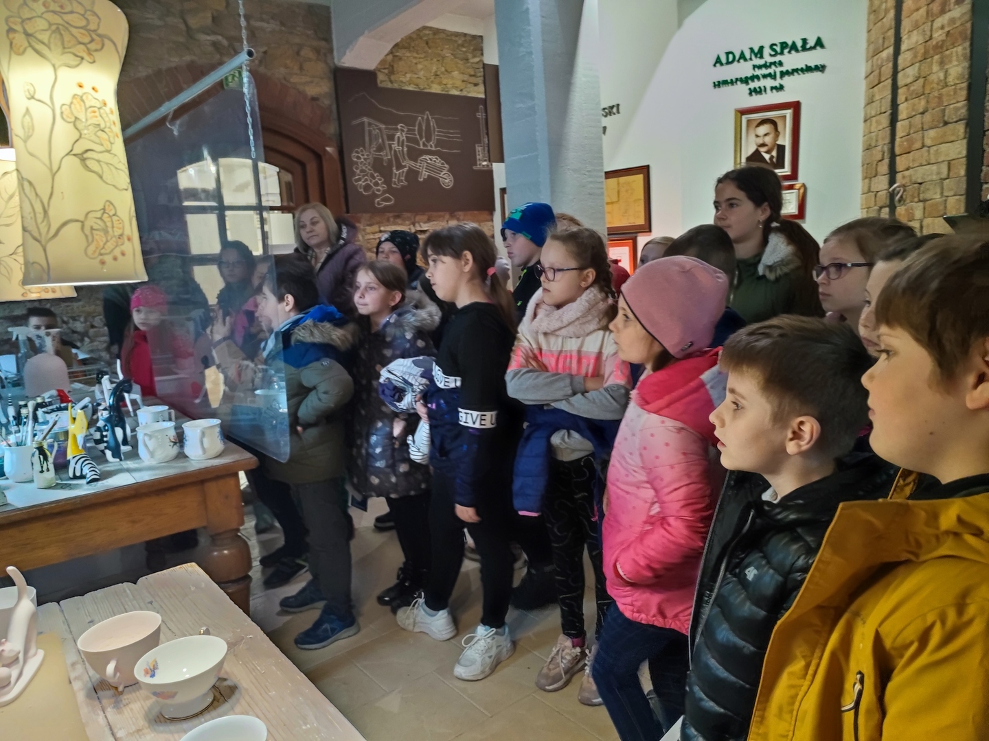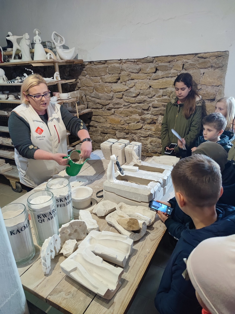Pierwszym przystankiem na wycieczkowej trasie była wizyta w Żywym Muzeum Porcelany w Ćmielowie. Tutaj uczniowie wraz z przewodnikiem odbyli podróż po muzeum, poznając proces produkcji porcelanowych figurek. Wielką atrakcją było wejście do wnętrza starego, oryginalnego pieca, który służył do wypału porcelany, a który obecnie jest wyjątkową salą multimedialną, w której przybliżany jest proces produkcji porcelany. Następnie uczniowie mieli możliwość spróbowania swoich sił w pracy z porcelaną, uczestnicząc w warsztatach, podczas których wykonali róże z masy porcelanowej.