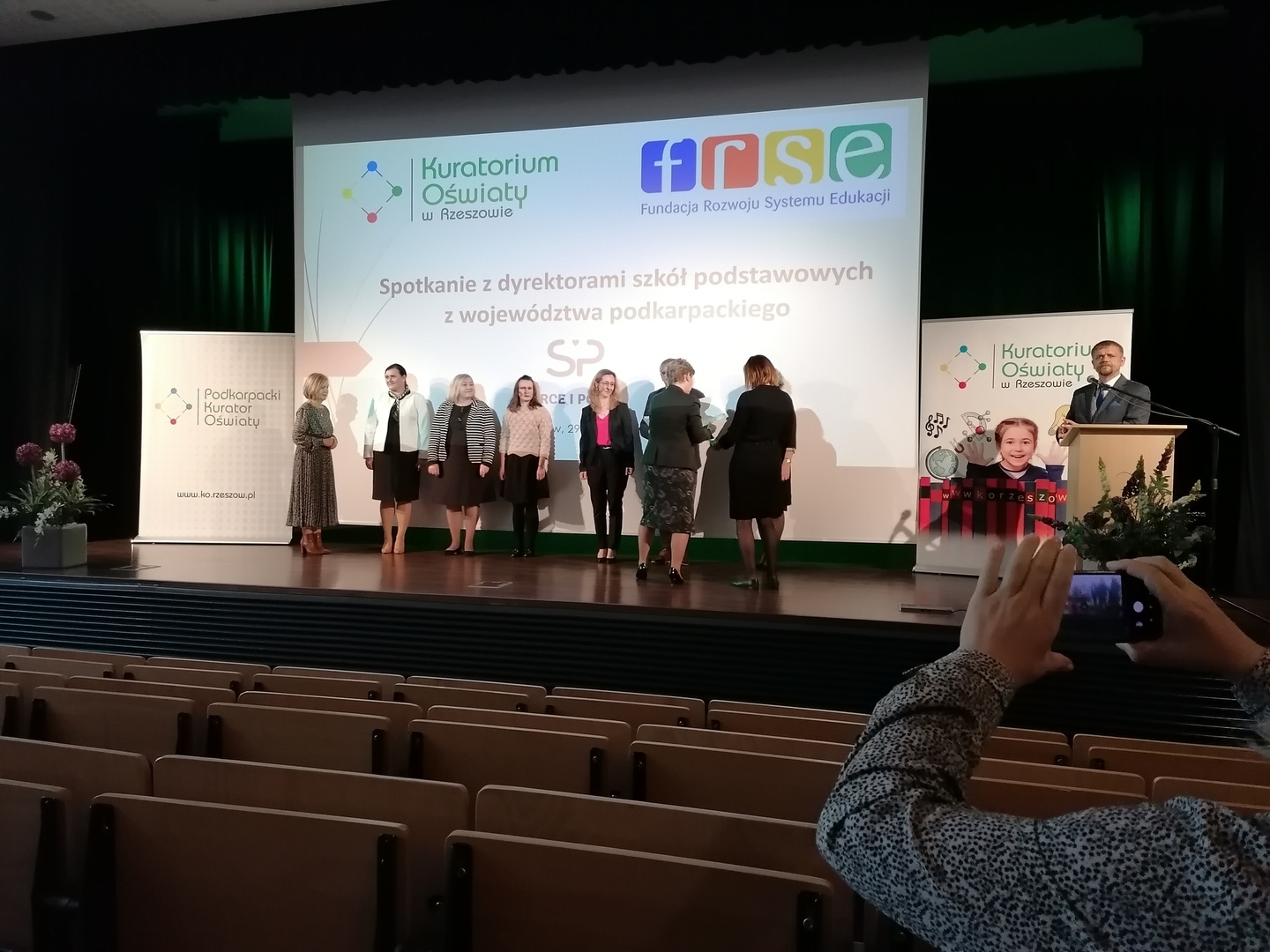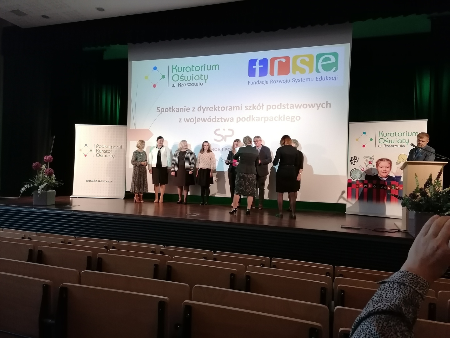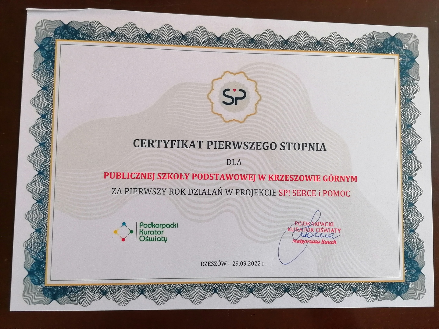 Pani Edyta Igras - dyrektor szkoły odebrała od pani Małgorzaty Rauch - Podkarpackiego Kuratora Oświaty Certyfikat Pierwszego Stopnia dla Publicznej Szkoły Podstawowej w Krzeszowie Górnym za pierwszy rok działań w projekcie SP! SERCE I POMOC.