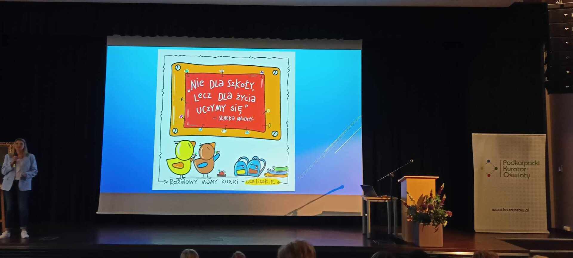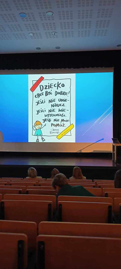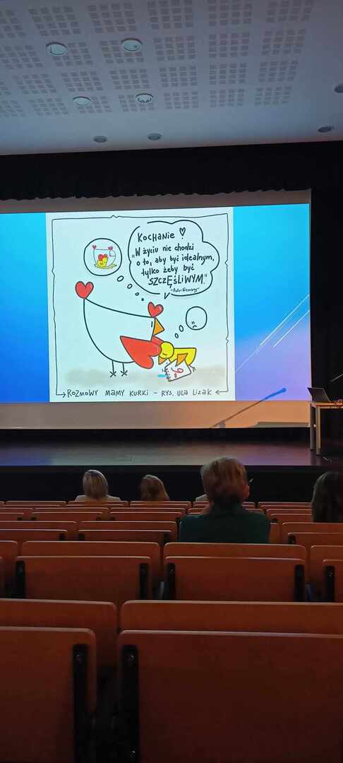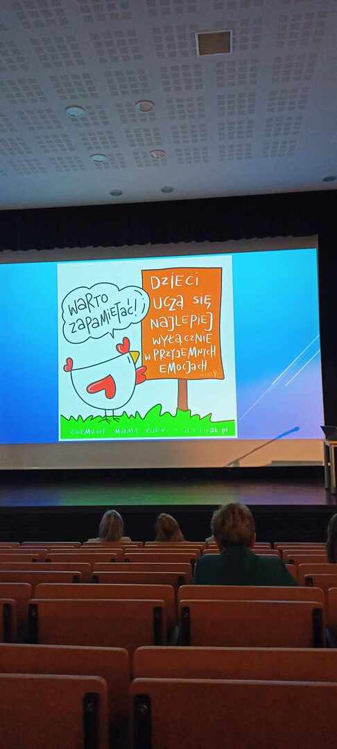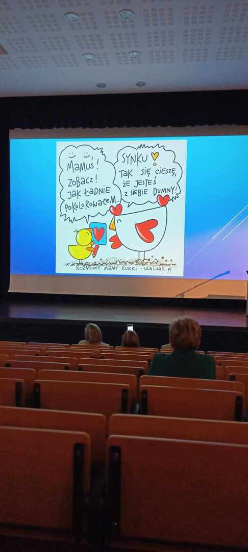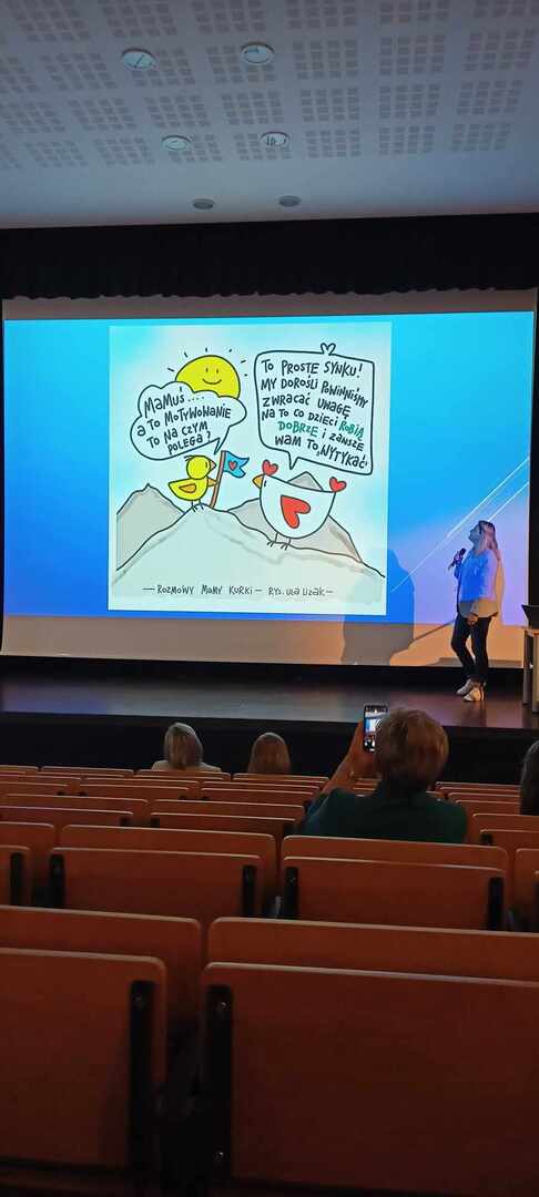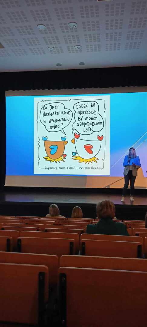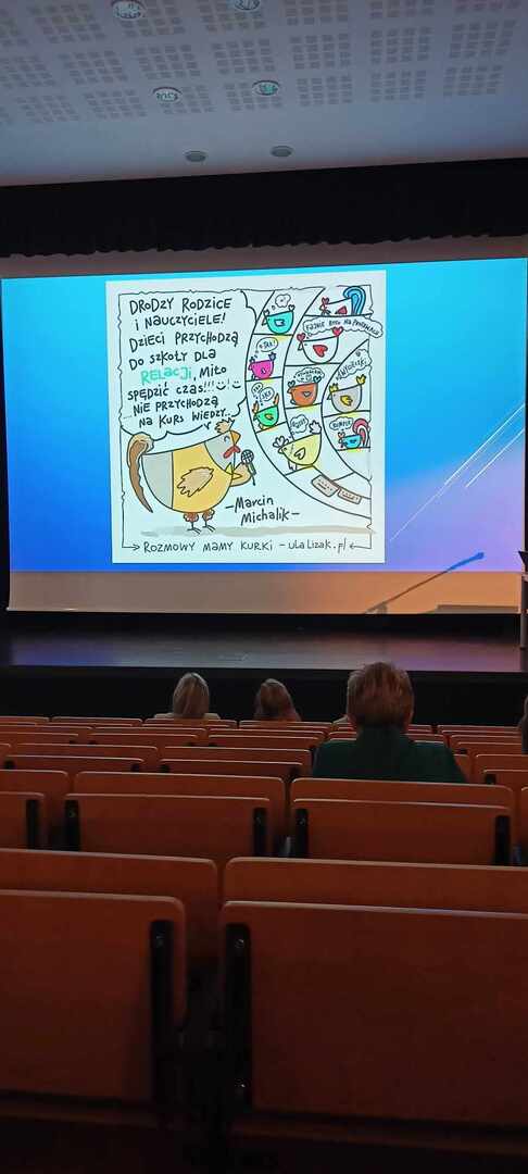 Podczas spotkania dyrektorzy i nauczyciele zaproszonych szkół wzięli udział w wykładzie pani Uli Lizak "Rozmowy mamy kurki" - uczeń klasy czwartej.