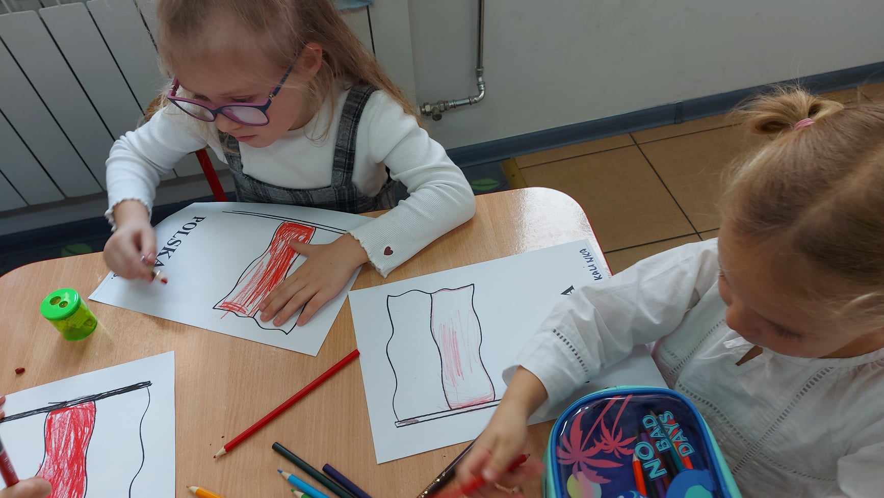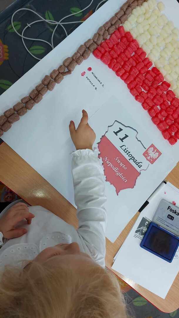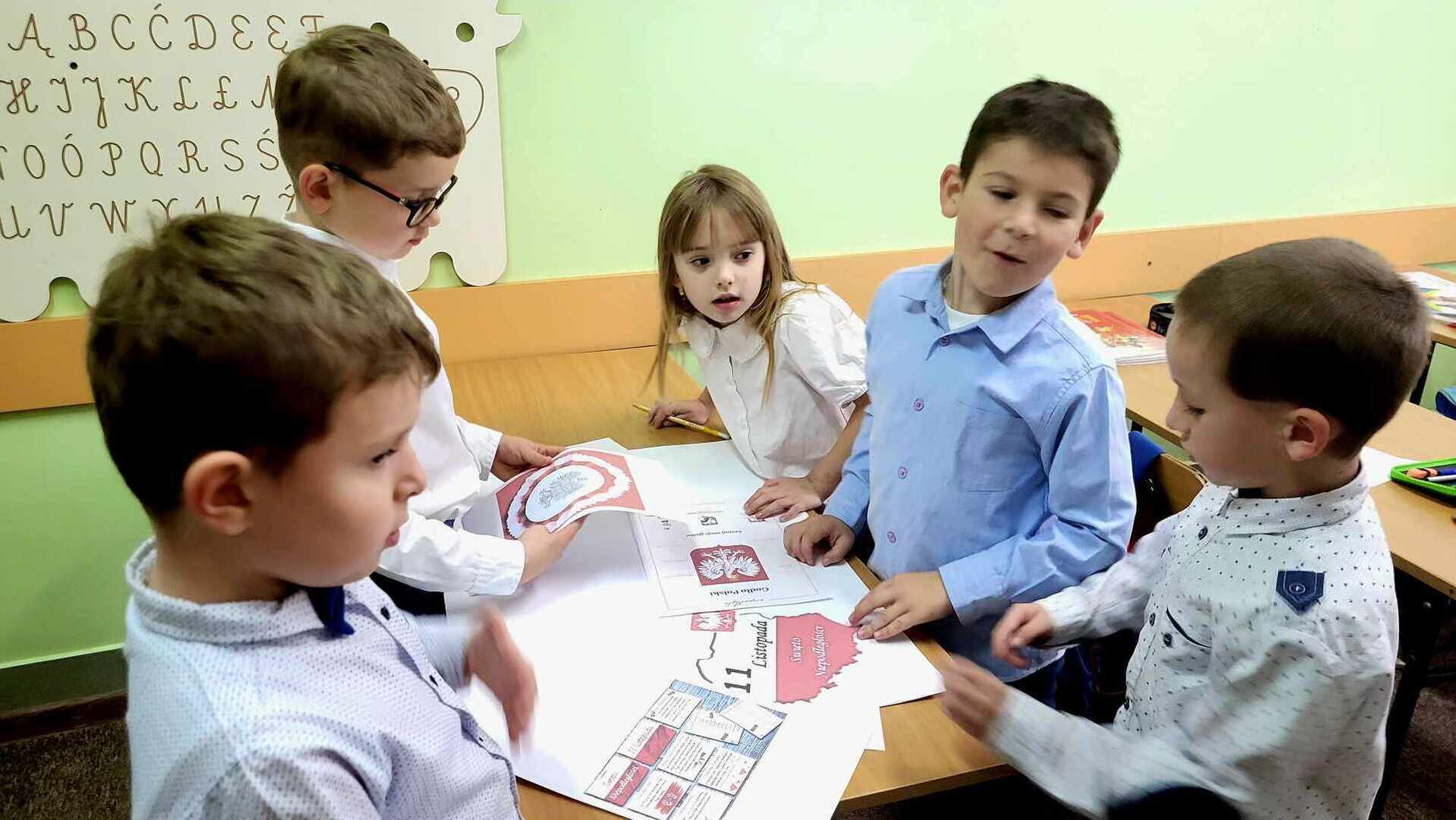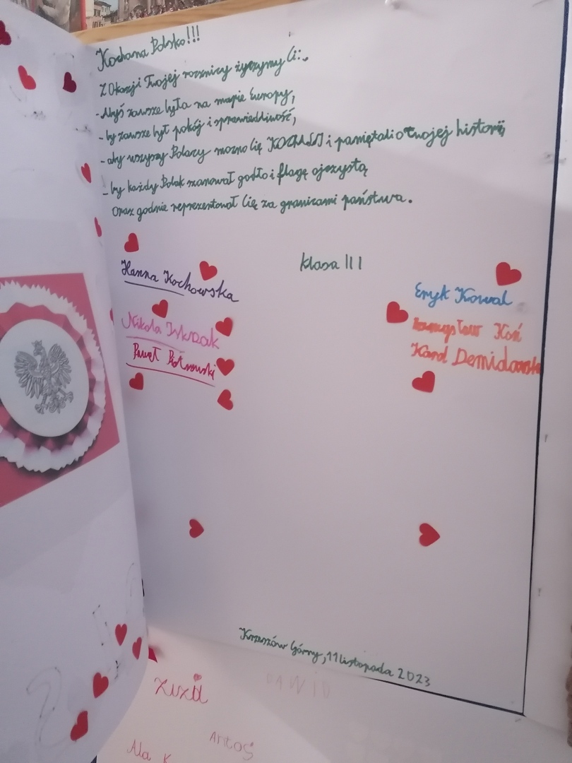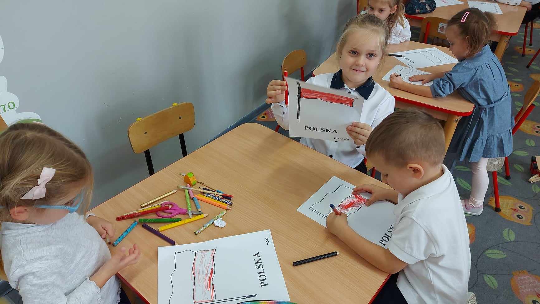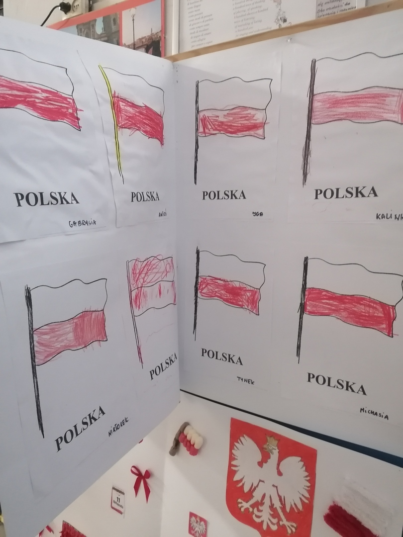 Po części oficjalnej wychowankowie oddziałów przedszkolnych oraz uczniowie klas 1-3 rozeszli się z wychowawcami do sal lekcyjnych, gdzie z przygotowanych materiałów wykonywali laurki dla Ojczyzny.