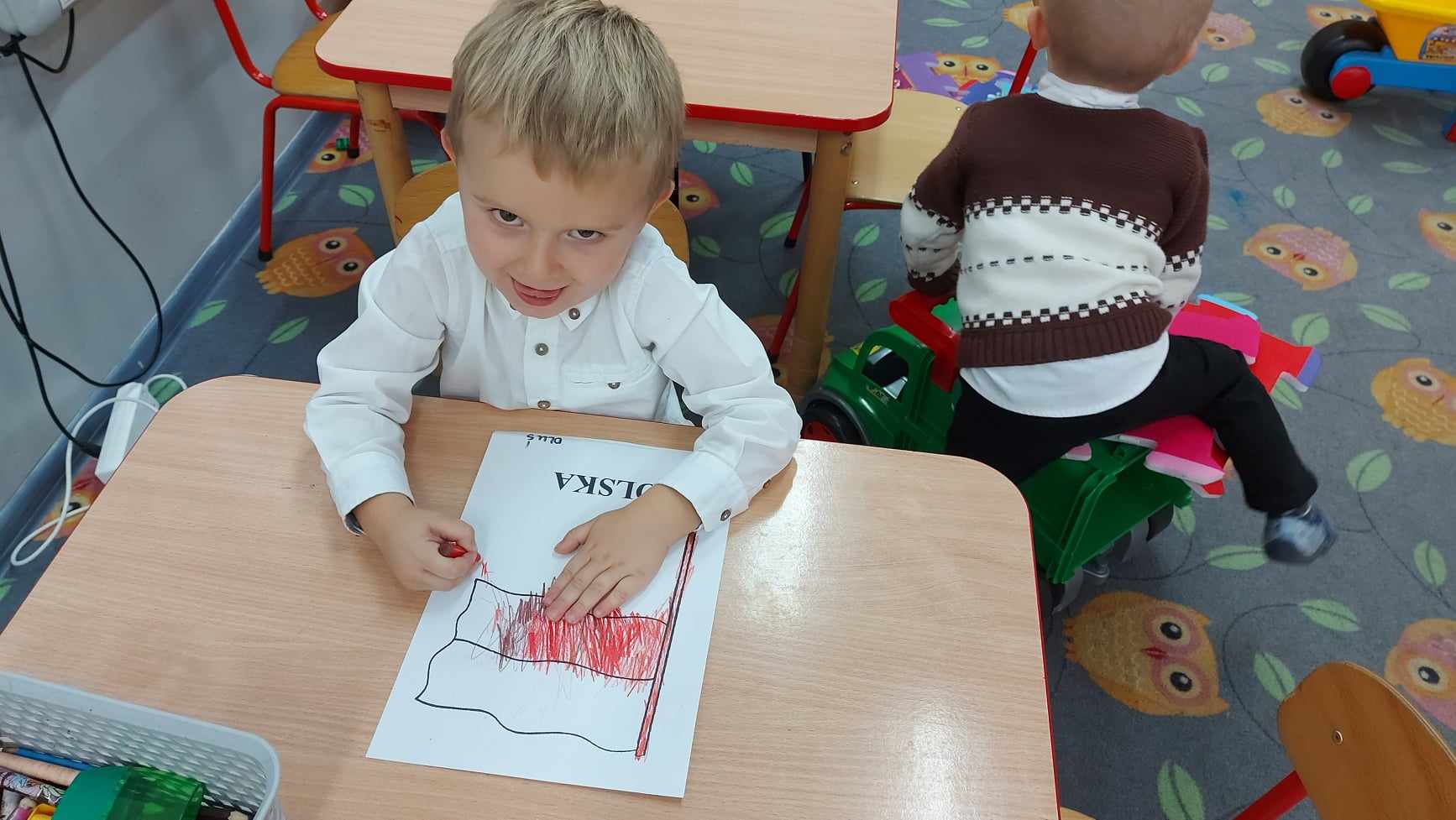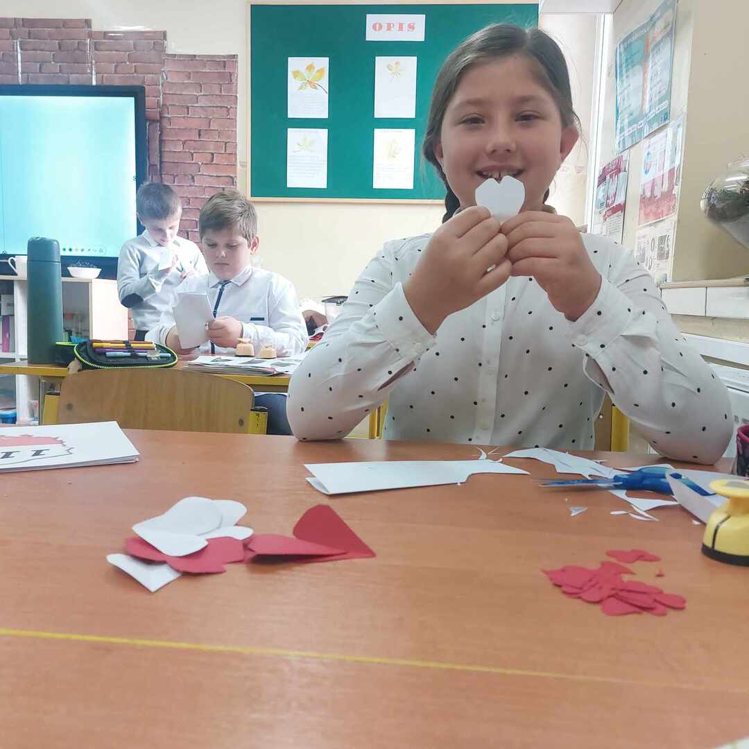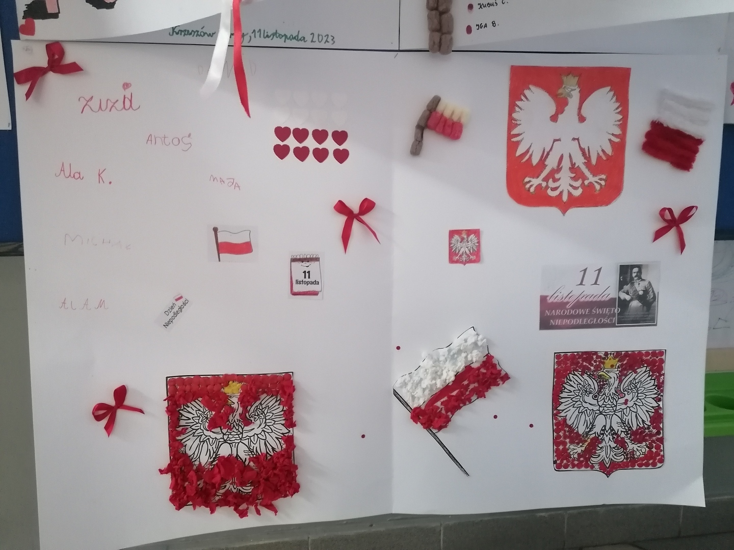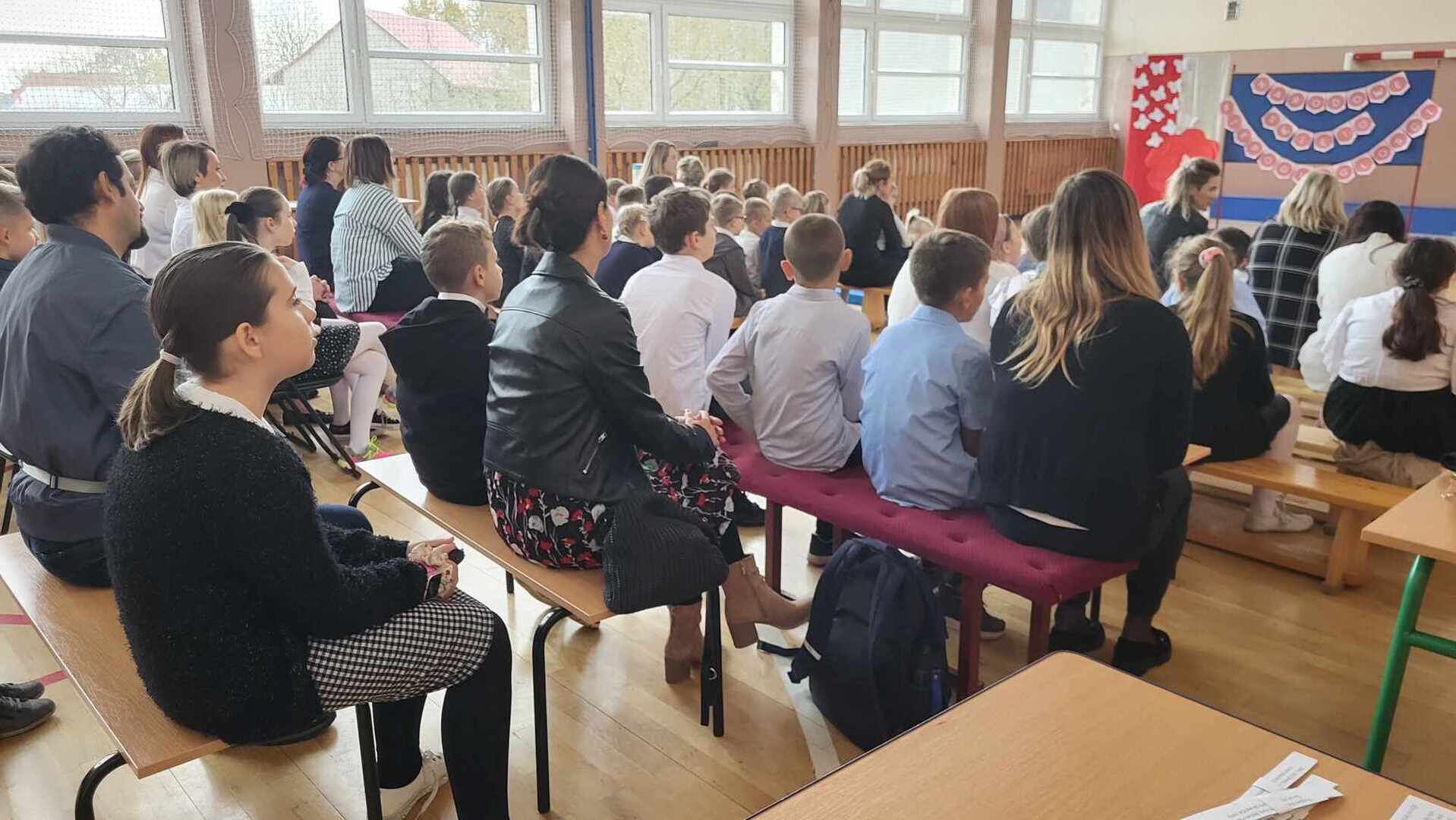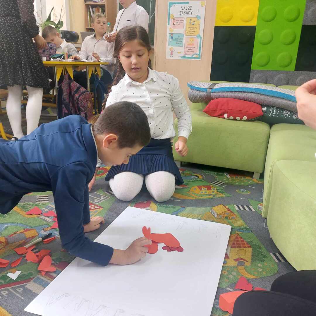 Po części oficjalnej wychowankowie oddziałów przedszkolnych oraz uczniowie klas 1-3 rozeszli się z wychowawcami do sal lekcyjnych, gdzie z przygotowanych materiałów wykonywali laurki dla Ojczyzny.