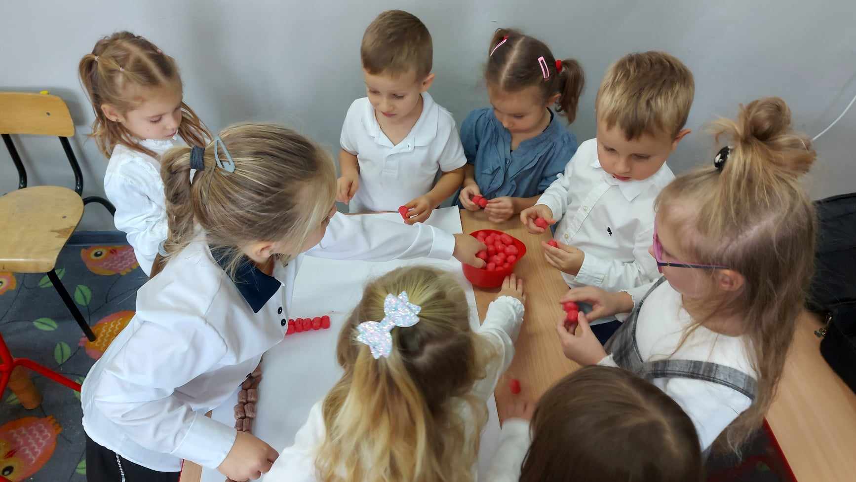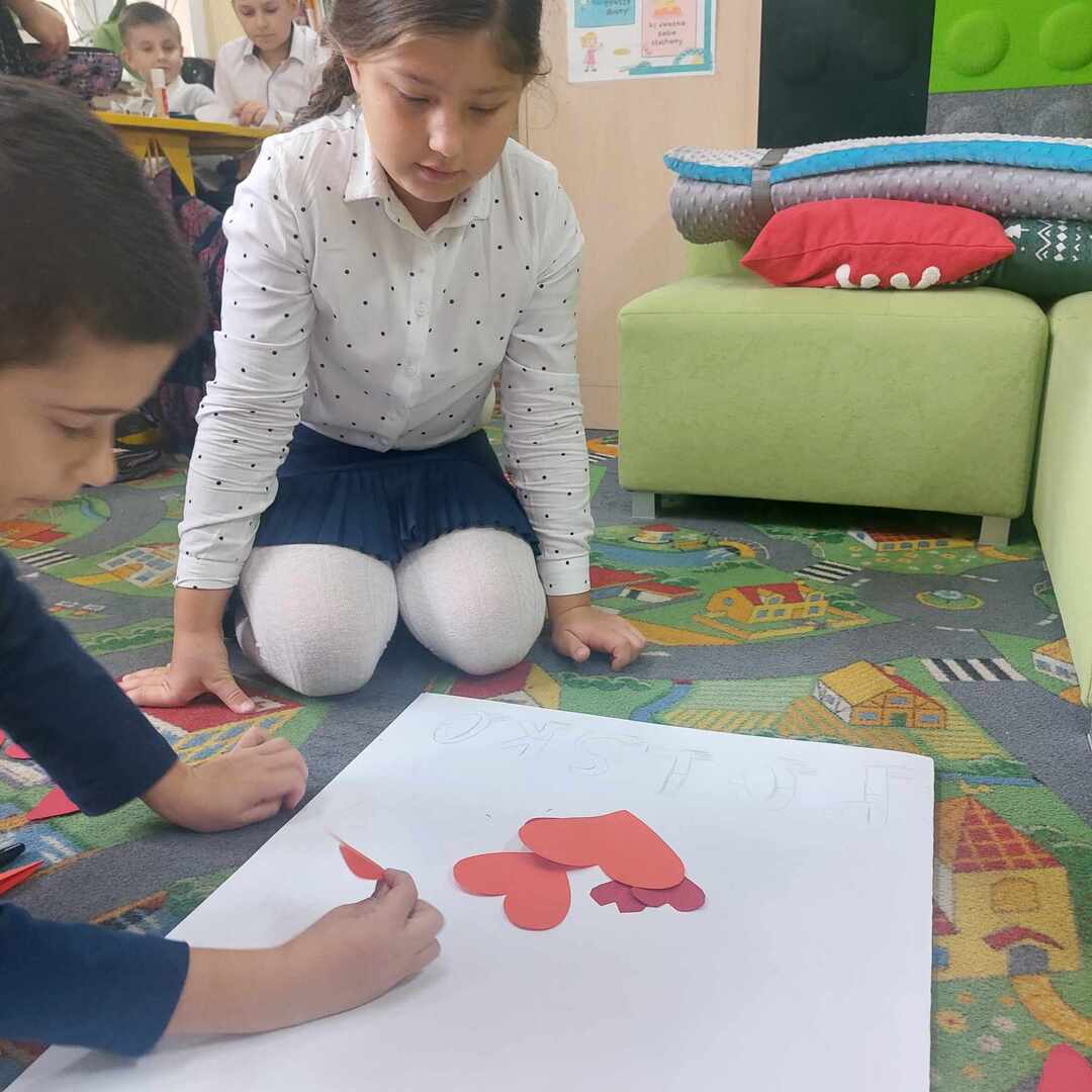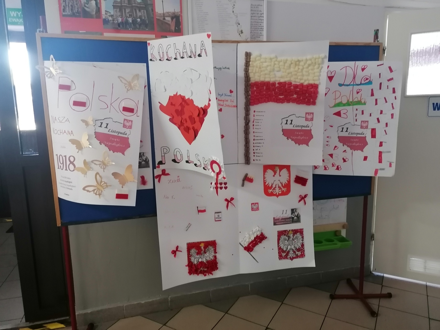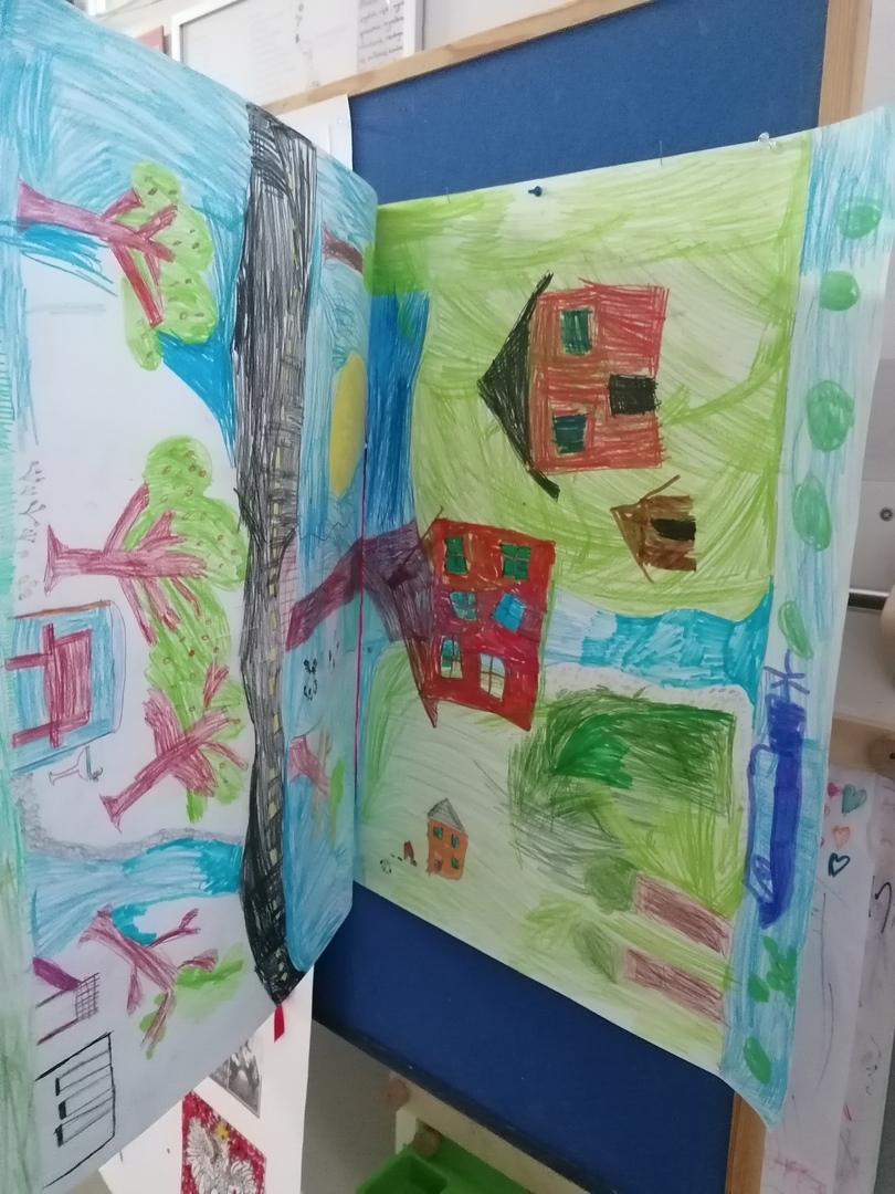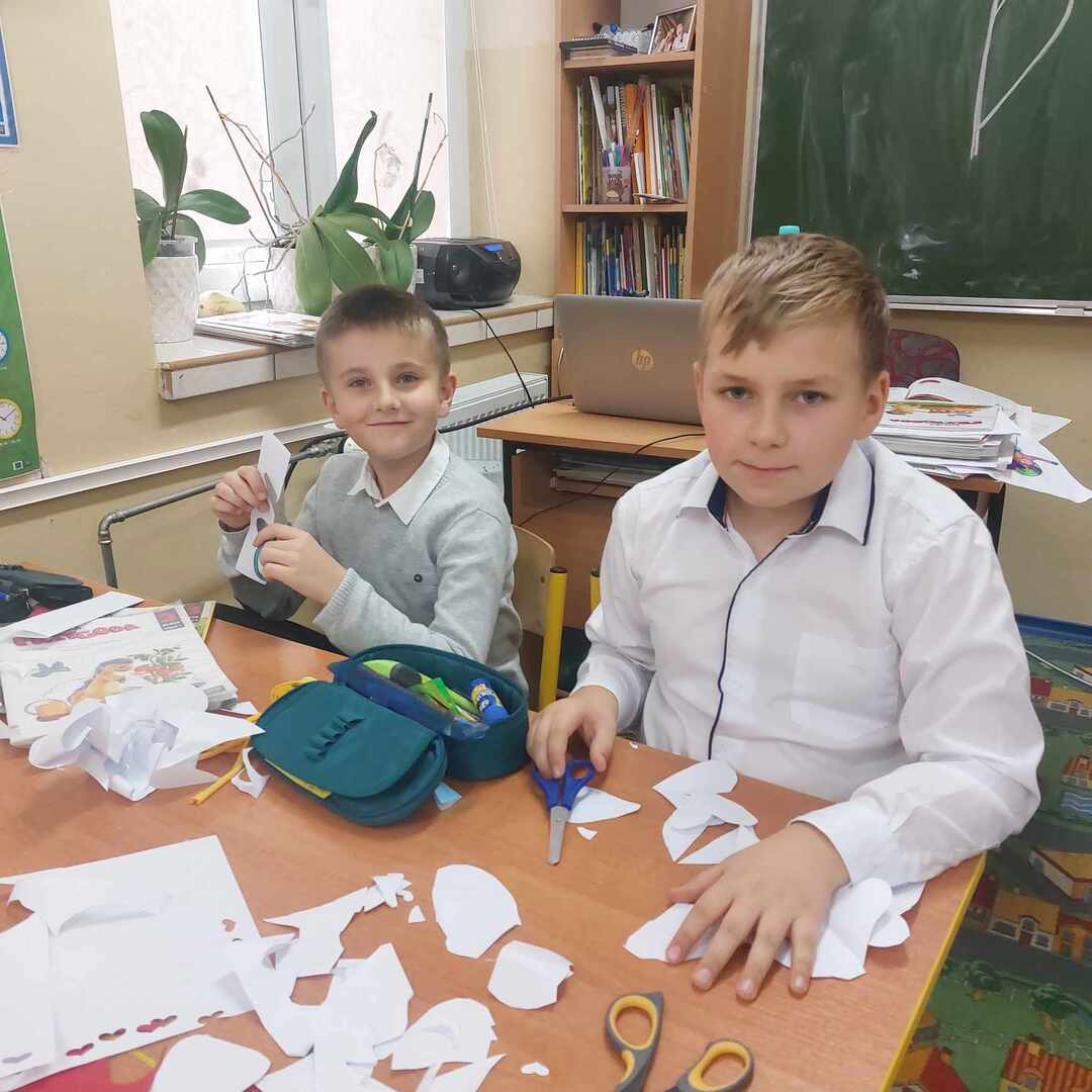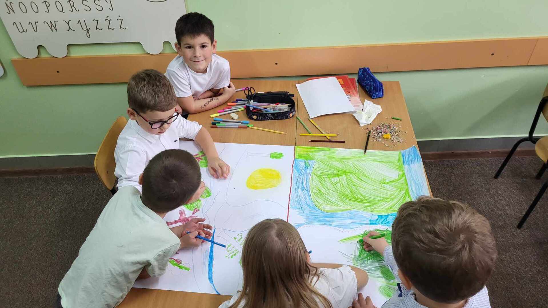 Po części oficjalnej wychowankowie oddziałów przedszkolnych oraz uczniowie klas 1-3 rozeszli się z wychowawcami do sal lekcyjnych, gdzie z przygotowanych materiałów wykonywali laurki dla Ojczyzny.
