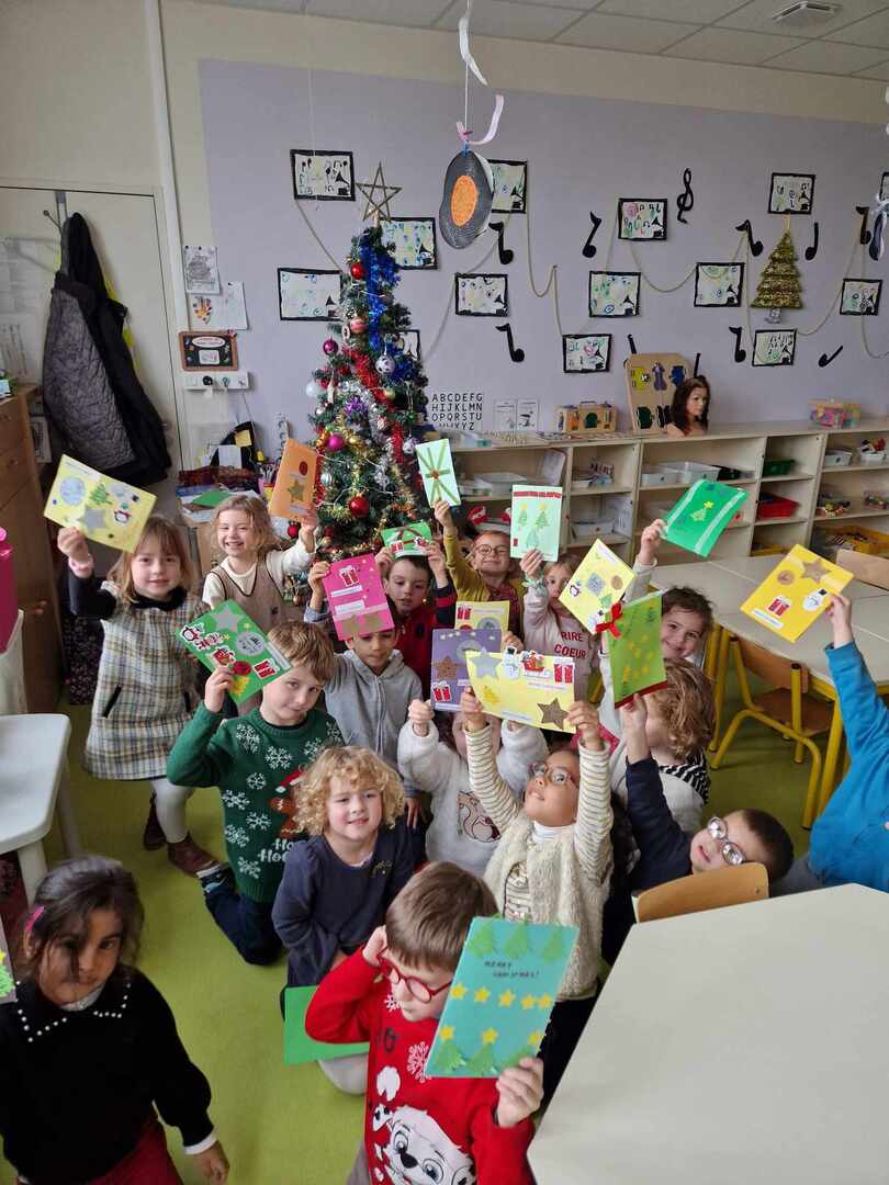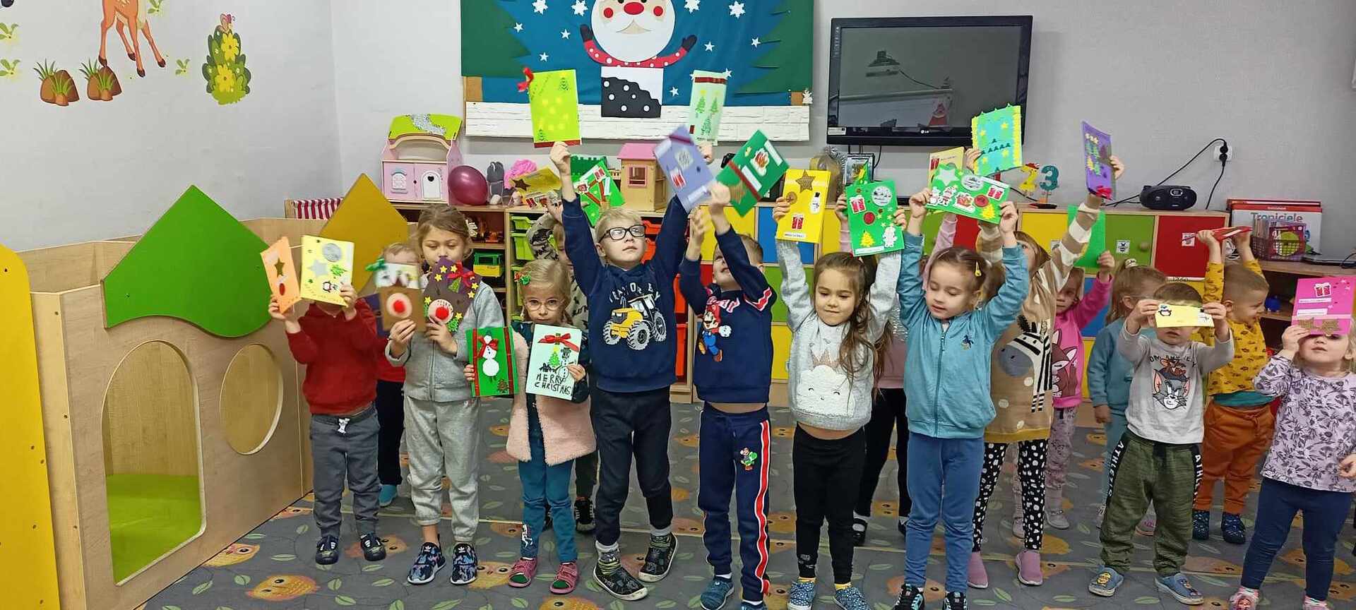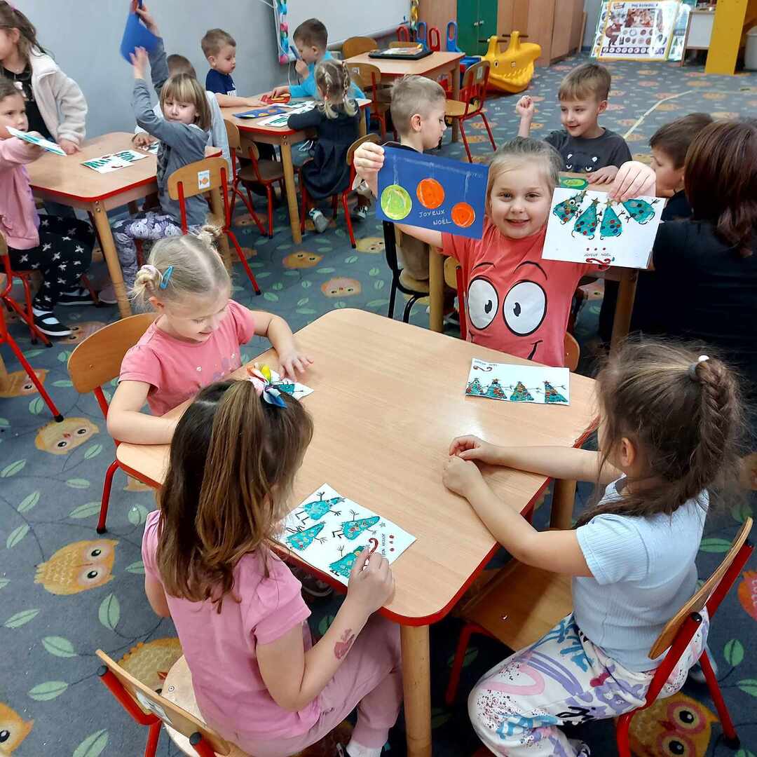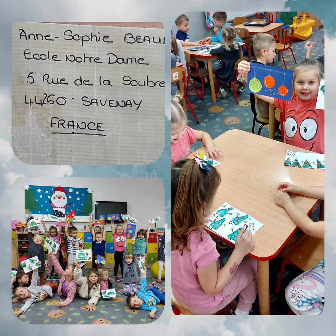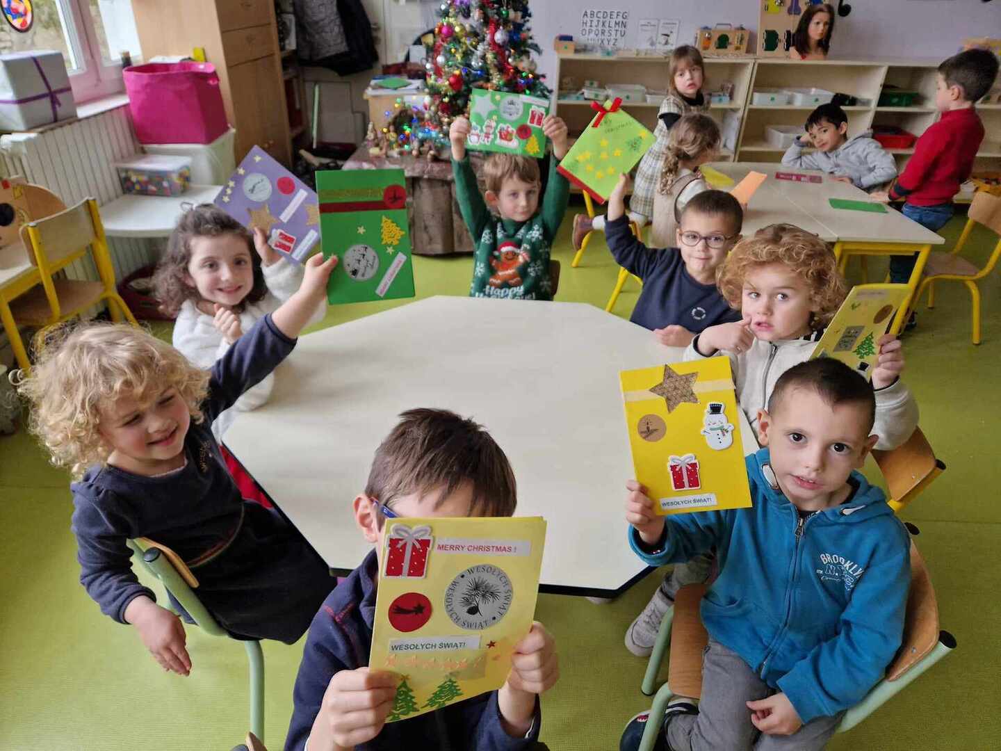 Zadaniem dzieci było własnoręczne przygotowanie kartek bożonarodzeniowych dla rówieśników z przedszkola z Francji.