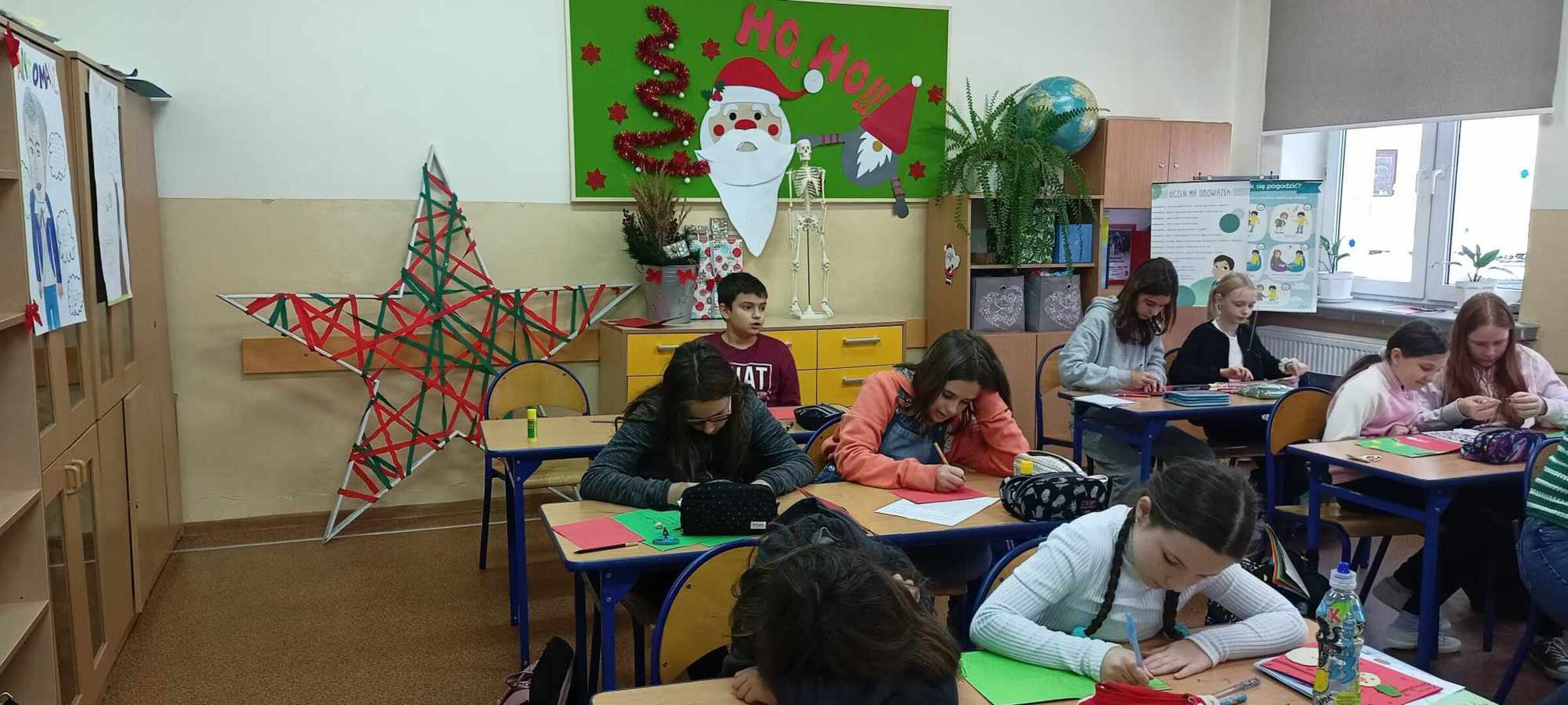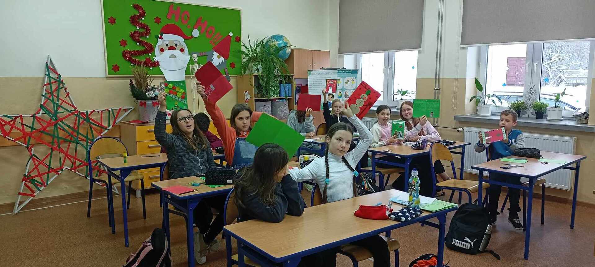 Uczniowie klasy piątej korespondowali z uczniami ze szkoły w Hiszpanii. Ich zadaniem było wykonanie kartki świątecznej, napisanie życzeń w języku angielskim oraz opisanie siebie i swoich zainteresowań.