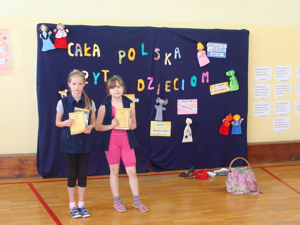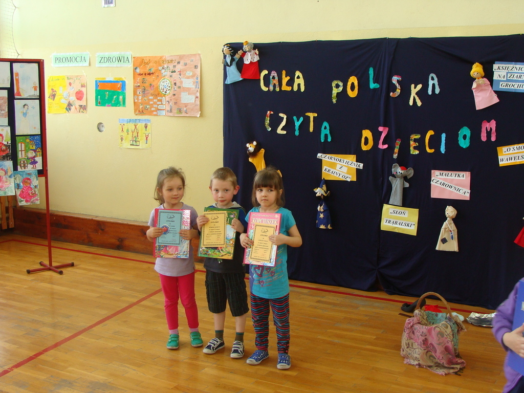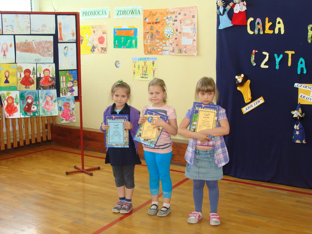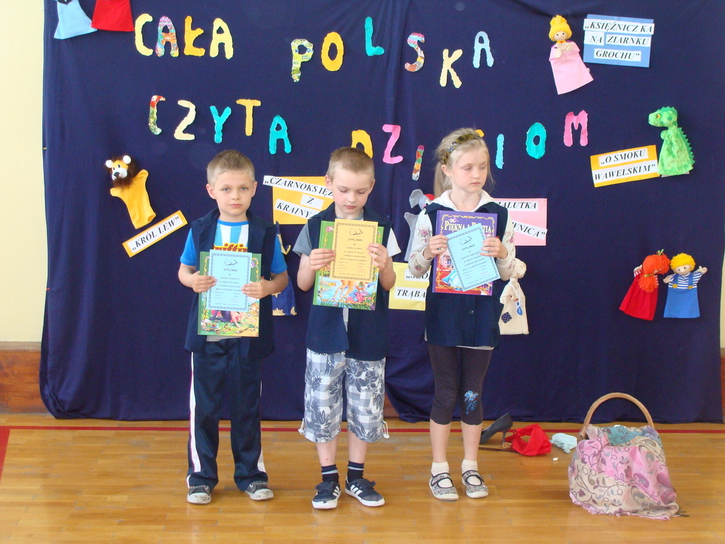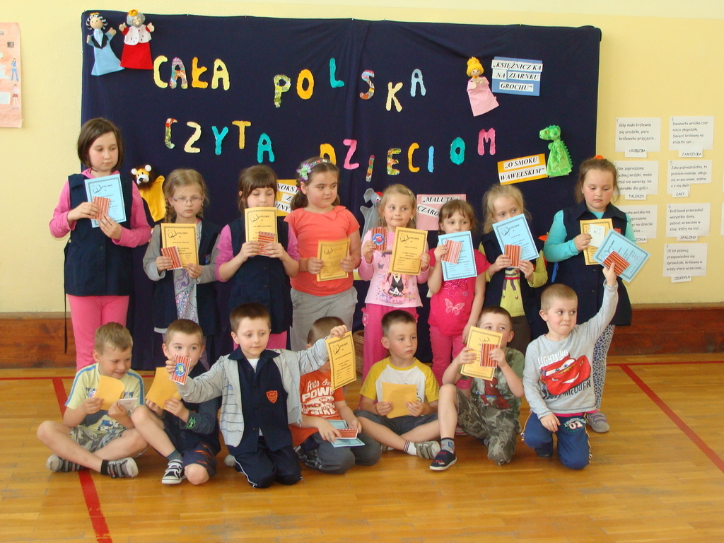 Nasza szkoła uczestniczy w akcji Cała Polska Czyta Dzieciom. Zachęcamy uczniów do czytania, korzystania z biblioteki szkolnej oraz filii biblioteki gminnej. Propagując czytanie zorganizowane zostało 9 maja spotkanie dla klas 0-III, podczas którego uczniowie odbyli podróż do krainy bajek i baśni, uczestniczyli w zabawach, konkursach sprawdzających znajomość literatury dla dzieci. Rozstrzygnięty został również konkurs plastyczny "Moja ulubiona książka". Wszyscy uczniowie biorący udział w konkursie otrzymali dyplomy a autorzy wyróżnionych prac zostali nagrodzeni książkami.