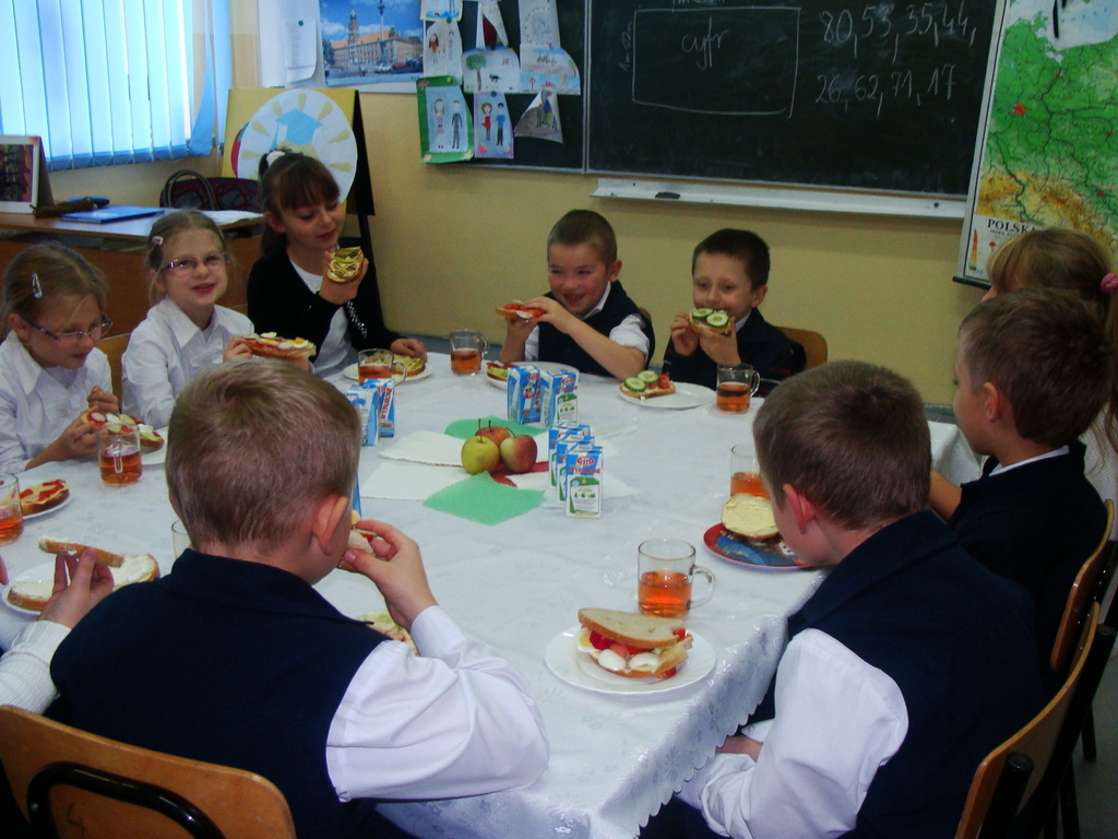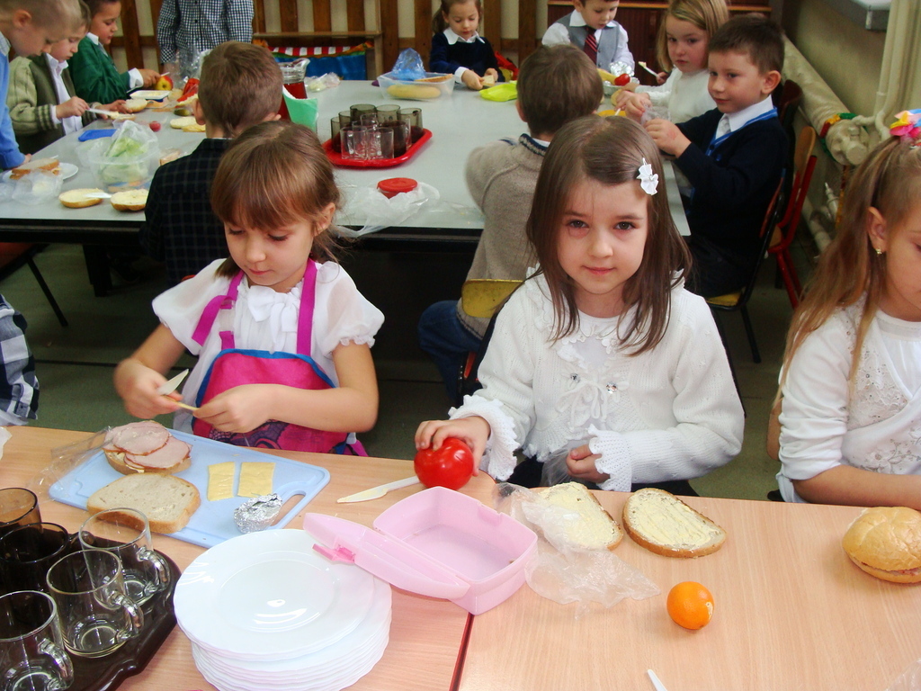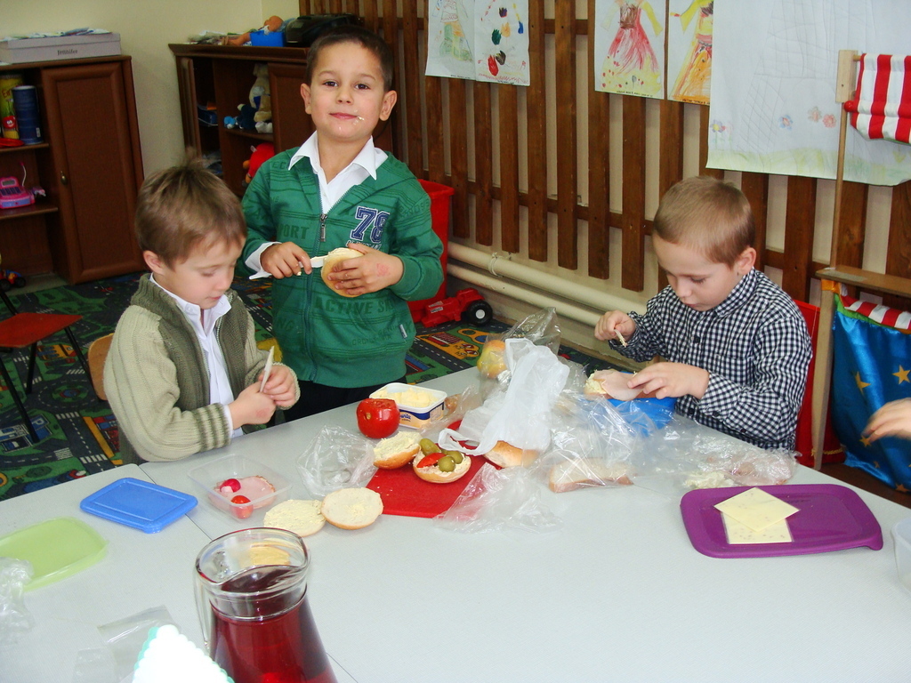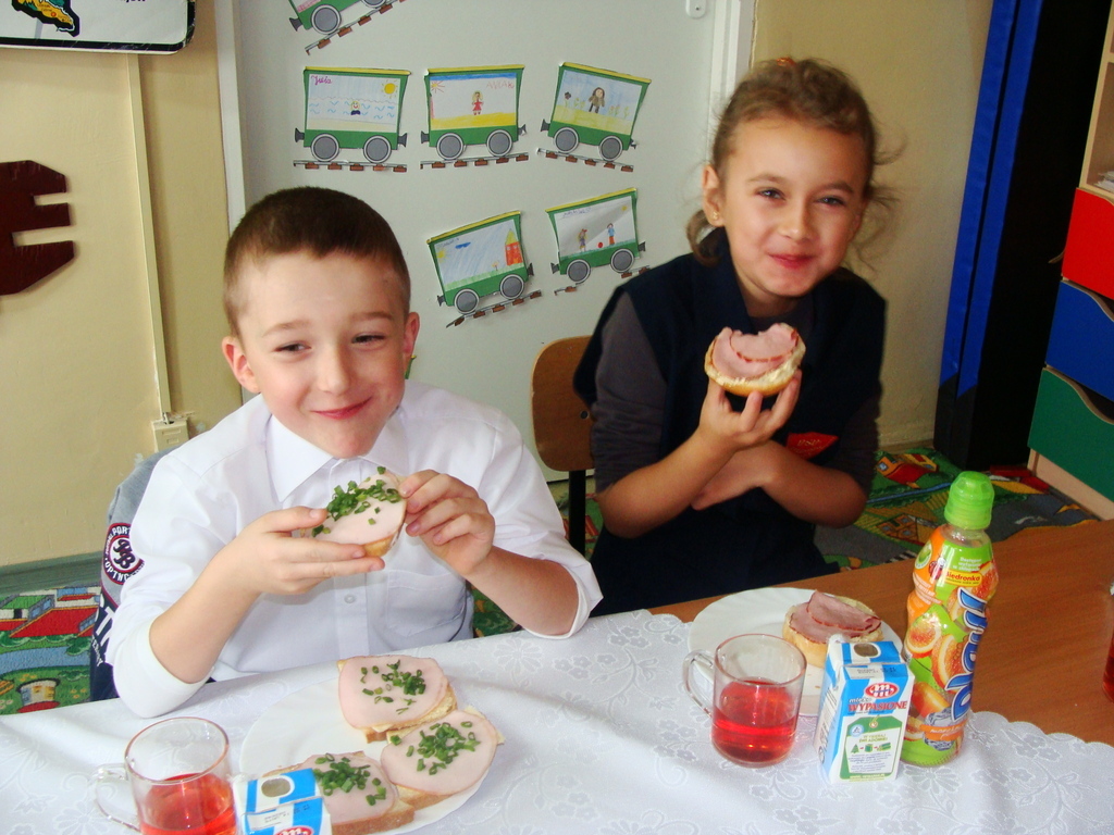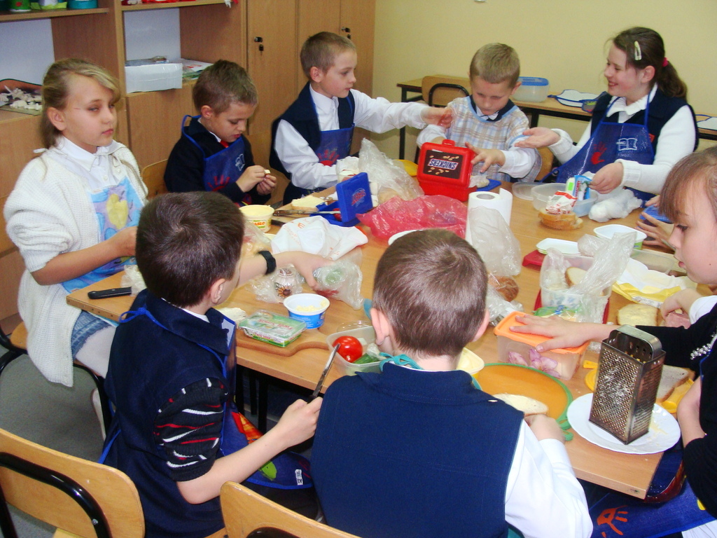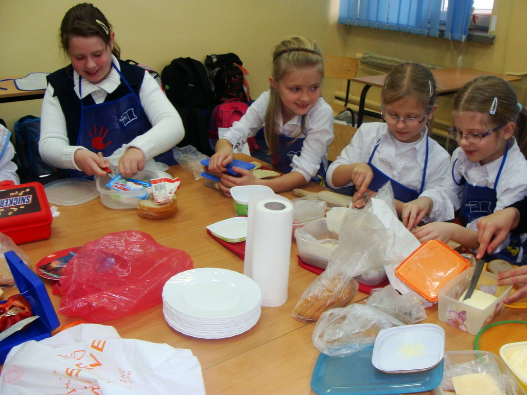 Podczas przygotowywania posiłków dzieci ubrane były w fartuszki, uczyły się nakrywać do stołu, pamiętały również o higienie rąk. W gotowości były także niezbędne akcesoria kuchenne: ściereczki, deski, talerzyki, noże i produkty spożywcze: umyte i obrane warzywa, wędliny, sery i nabiał. Uczniowie z wielką radością i dumą przygotowywali zdrowe i pyszne kanapki, które ze smakiem zjadali.