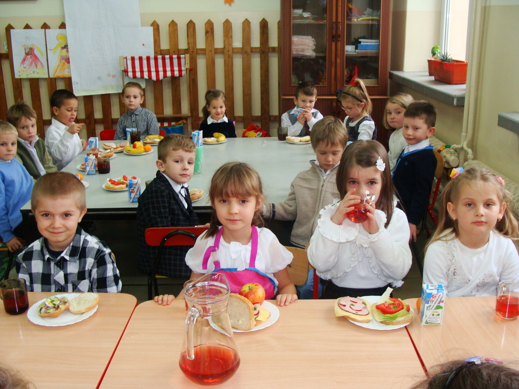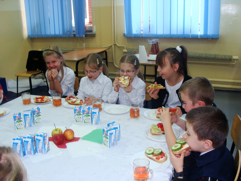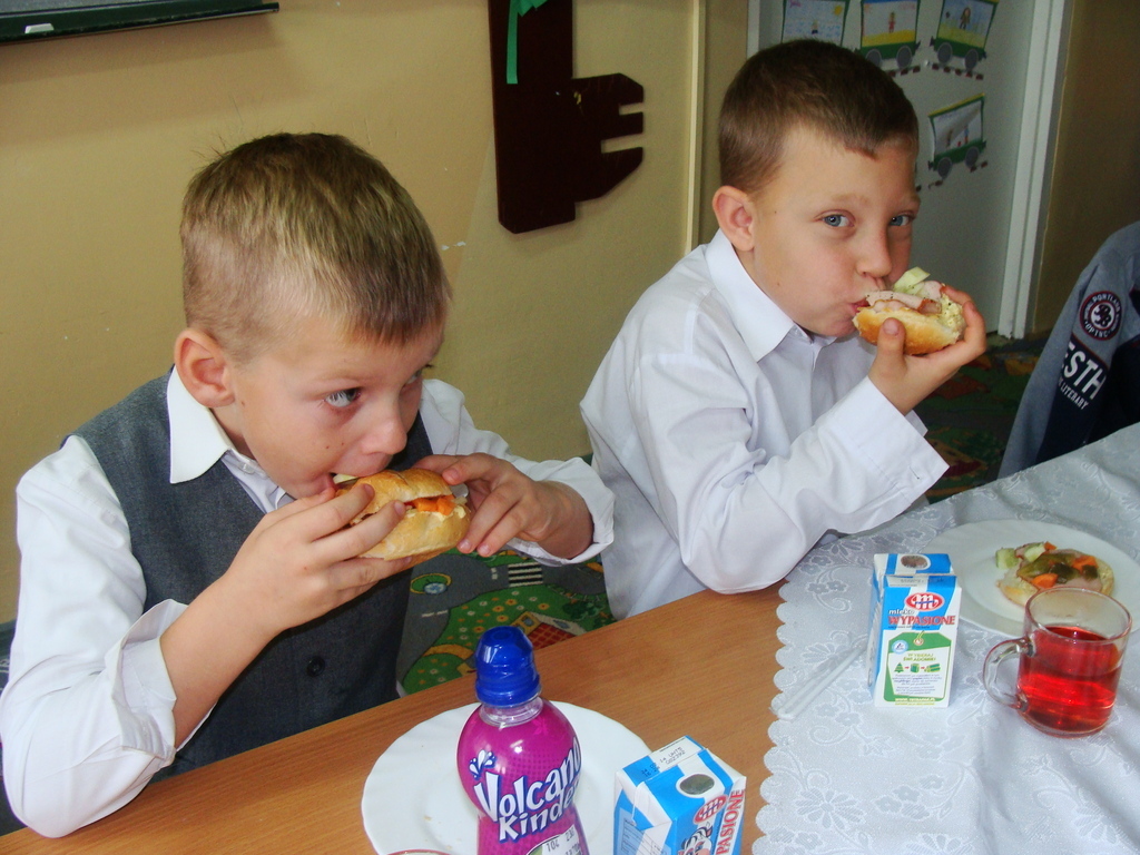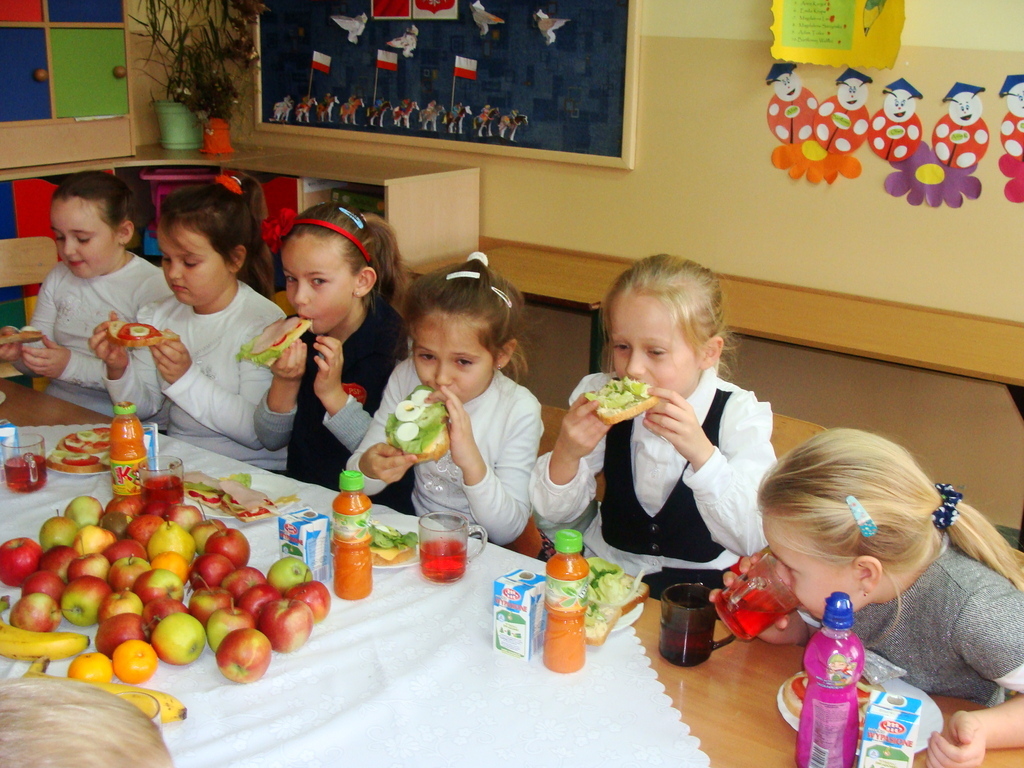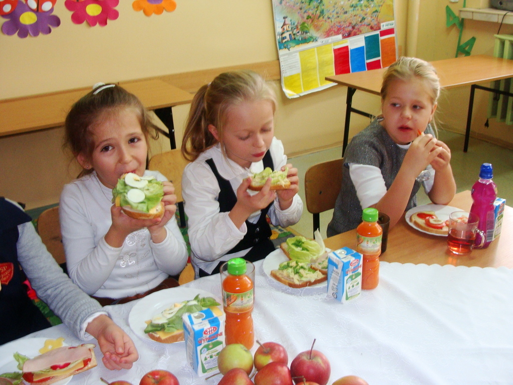 Podczas przygotowywania posiłków dzieci ubrane były w fartuszki, uczyły się nakrywać do stołu, pamiętały również o higienie rąk. W gotowości były także niezbędne akcesoria kuchenne: ściereczki, deski, talerzyki, noże i produkty spożywcze: umyte i obrane warzywa, wędliny, sery i nabiał. Uczniowie z wielką radością i dumą przygotowywali zdrowe i pyszne kanapki, które ze smakiem zjadali.